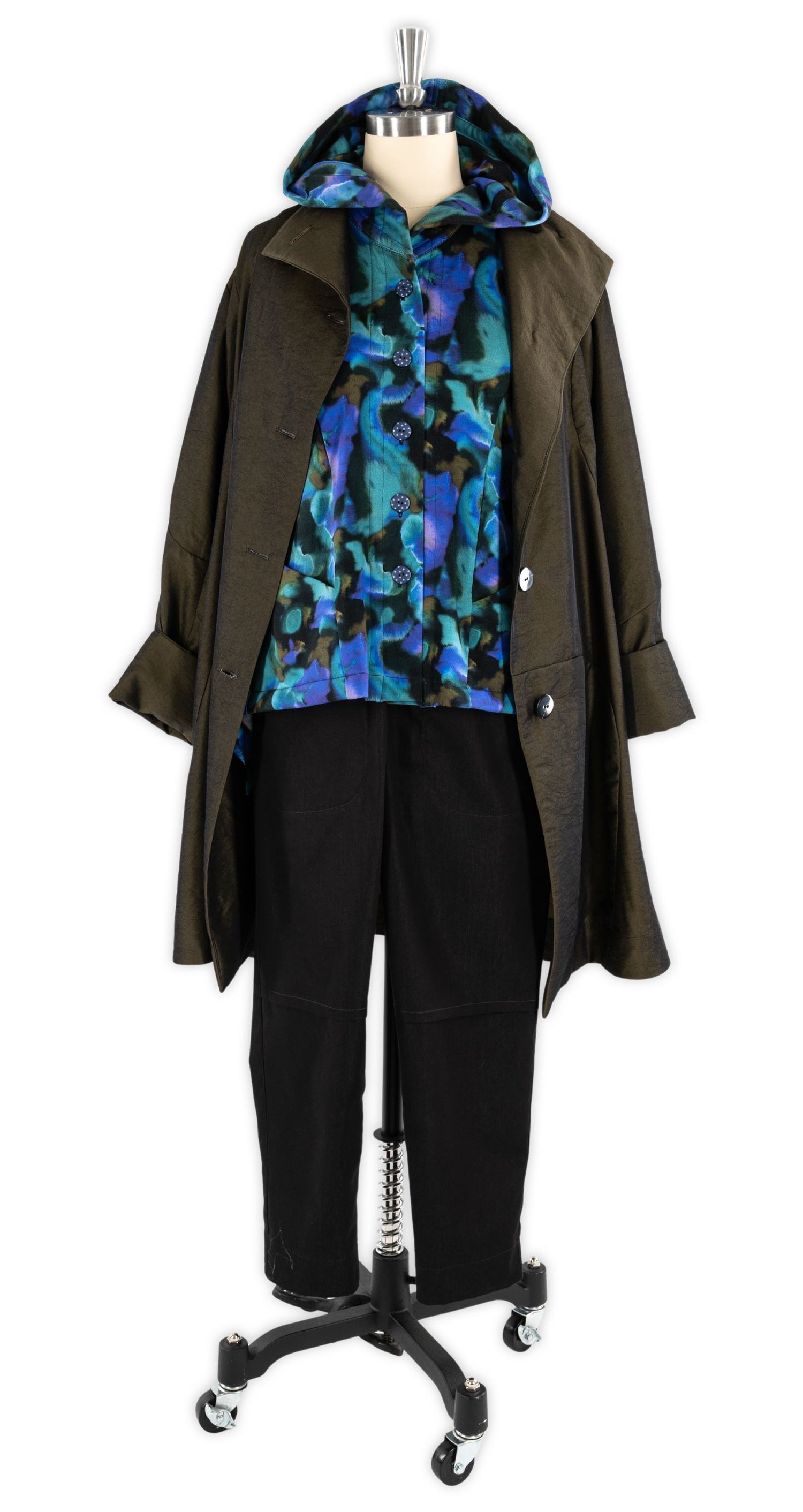 Vogue 9244 by Marcy Tilton is a beautifully shaped, feminine hoodie sewn here in Blue Angel, a Dutch cotton French terry, part of her Fall 2025 Core Wardrobe. Made directly from the pattern, the only modification was to line the hood with the self fabric, as the reverse side is white. This French terry is exceptionally soft and supple, and it’s also available in two other prints: Rainbow Leaves and Blue Poppies.