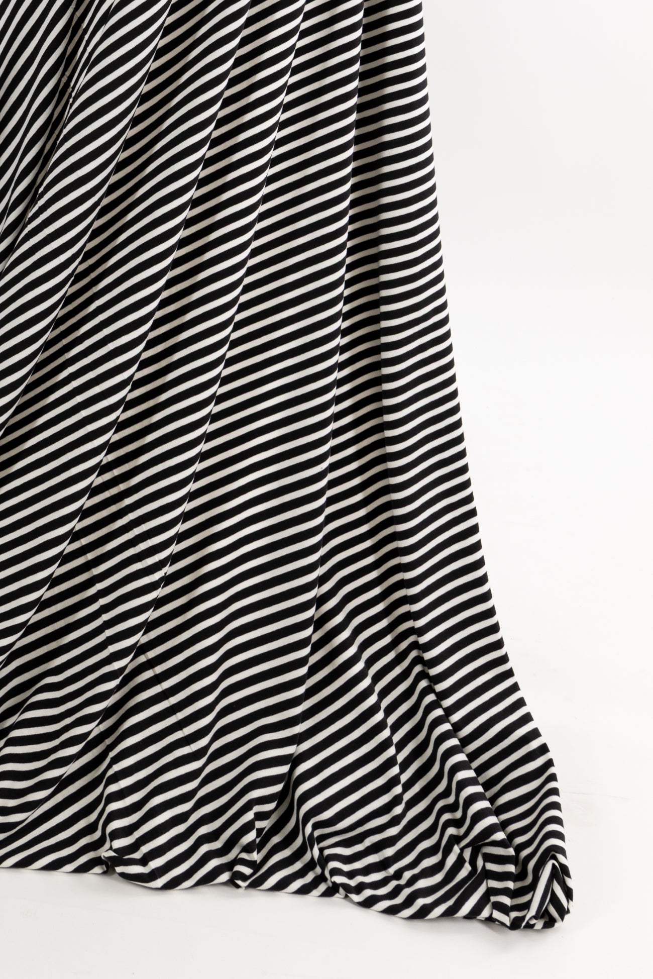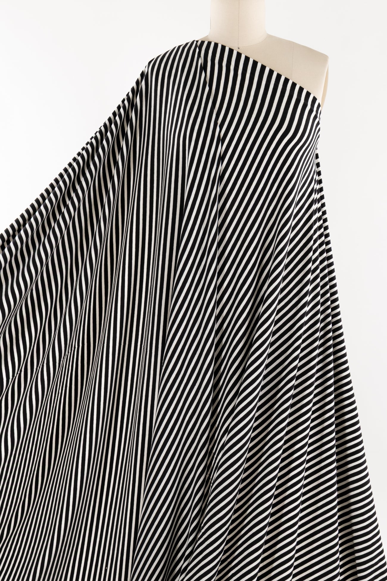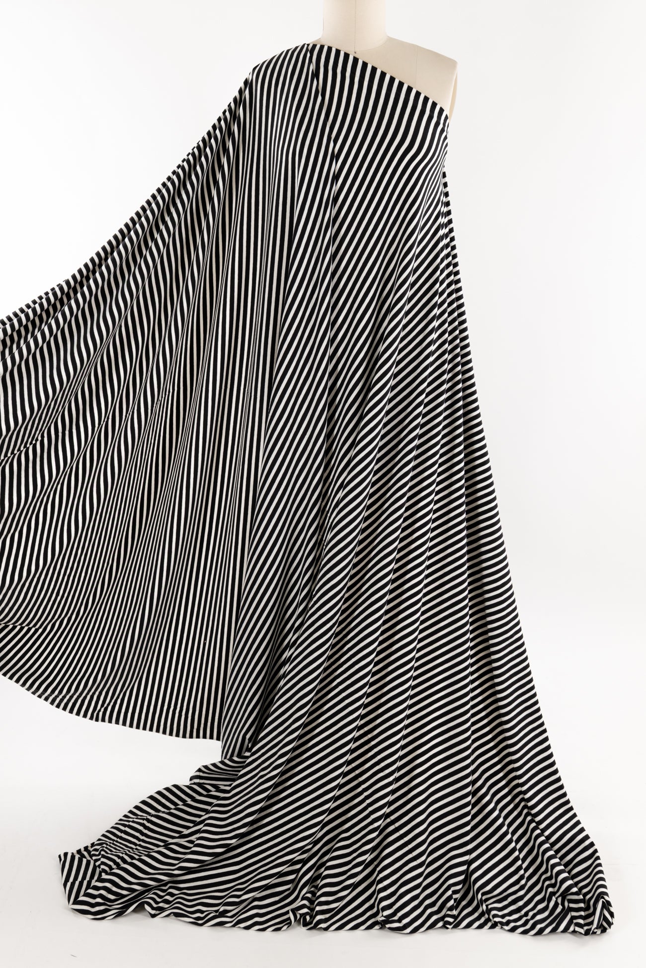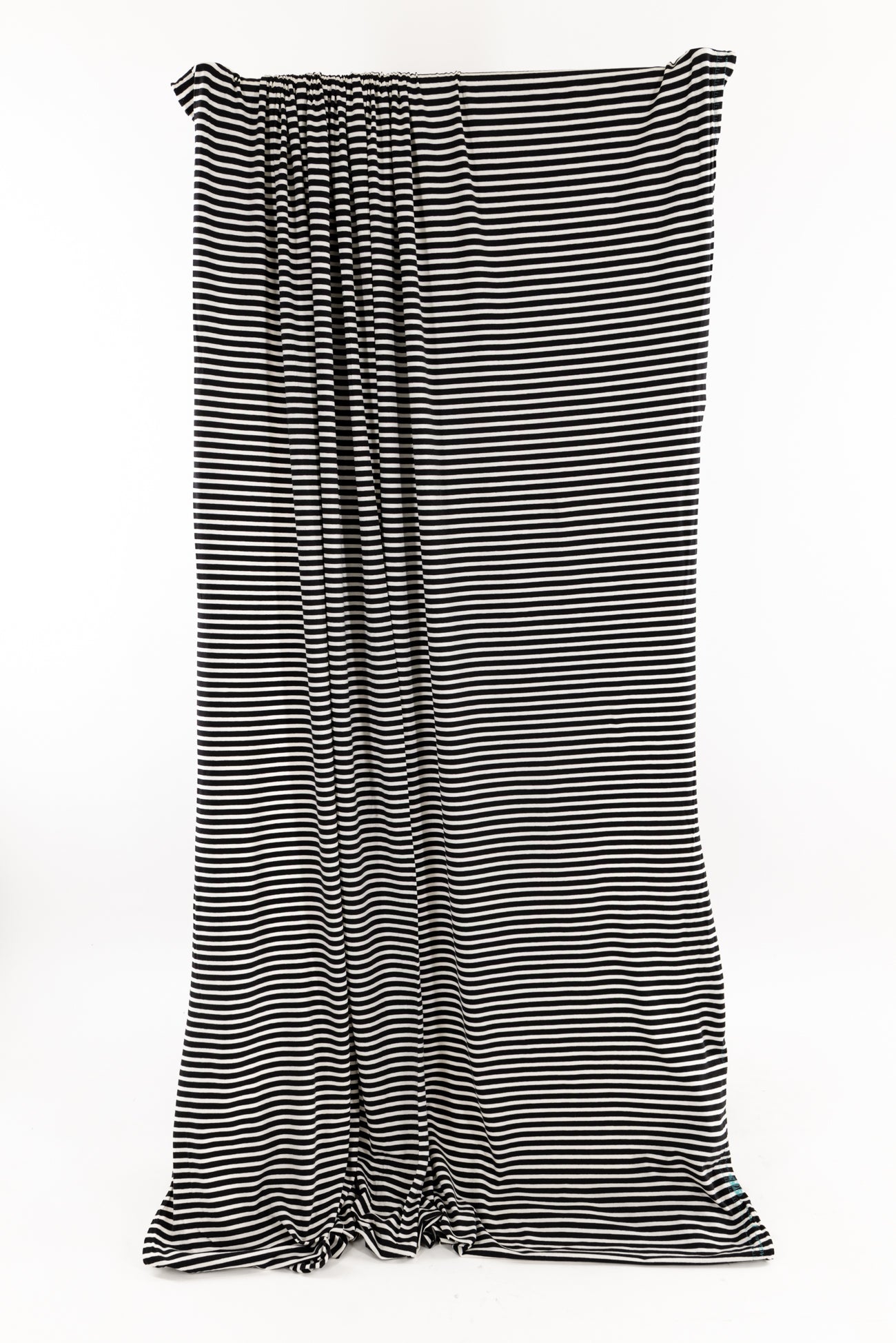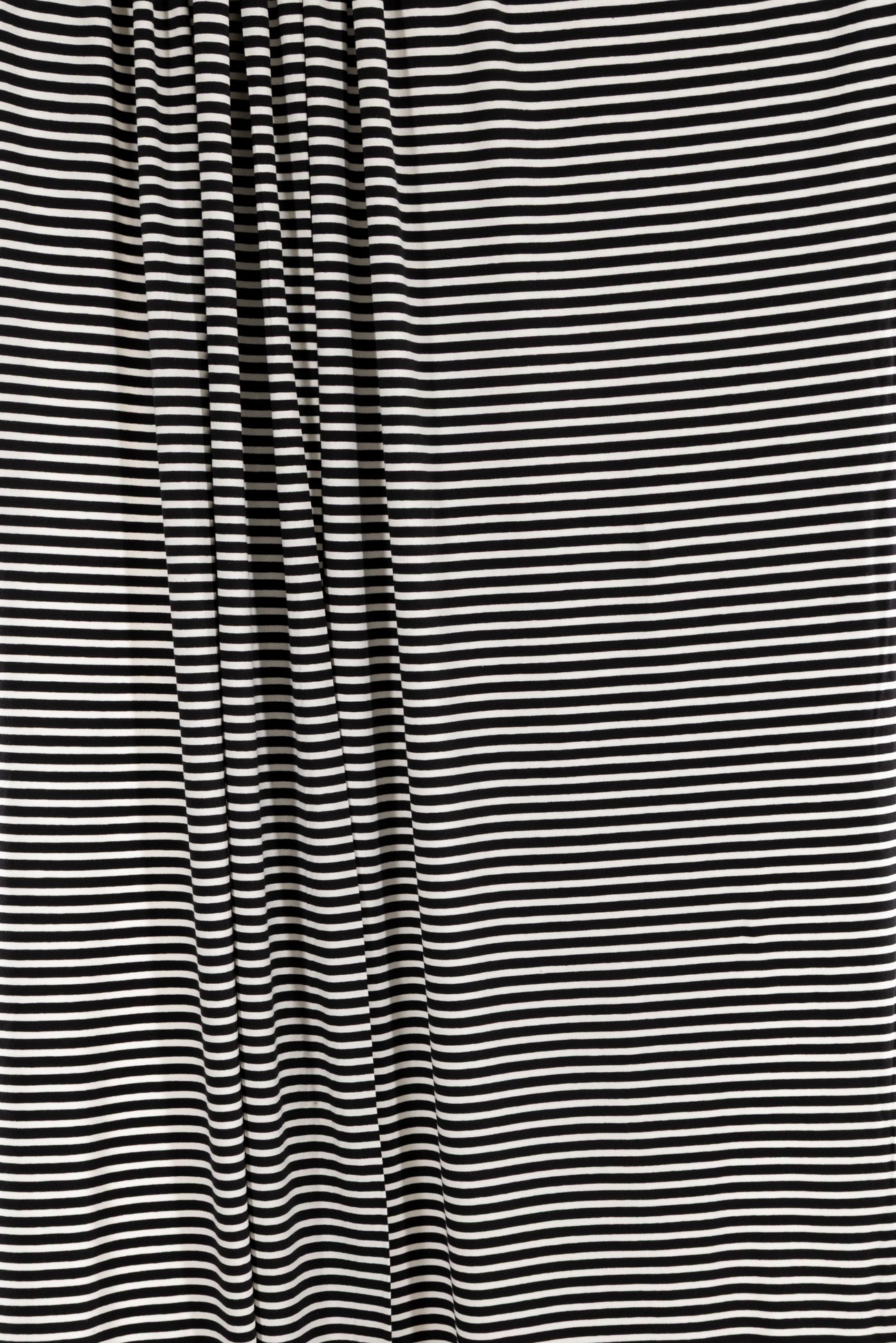 Classic and charming black and white stripes in a fine quality cotton spandex jersey produced in South Korea. Mid-weight with an appealing soft hand and drape, ½" repeat, and 4-way stretch with some rolling at the cut edge. Right for a t-shirt, cardi, top, tunic, dress, skirt, soft pants, sweater, loungewear, kimono, caftan, jumpsuit, men's, children's clothes, or accents. Oeko-Tex® certified. Marcy says,'Perfect for trims, edging, contrast, details, sleeves etc., to add a pop to both knits and wovens.'