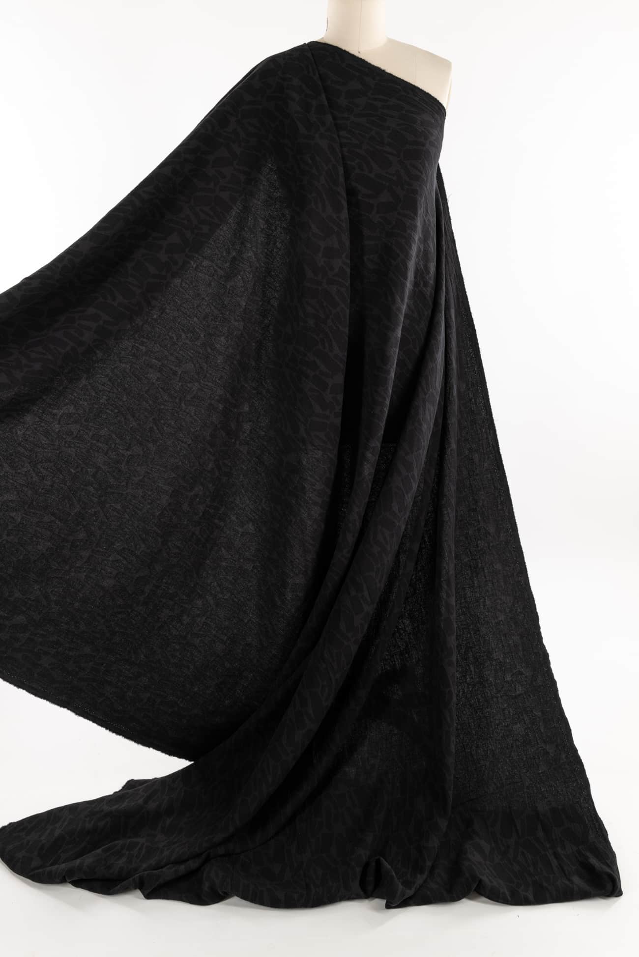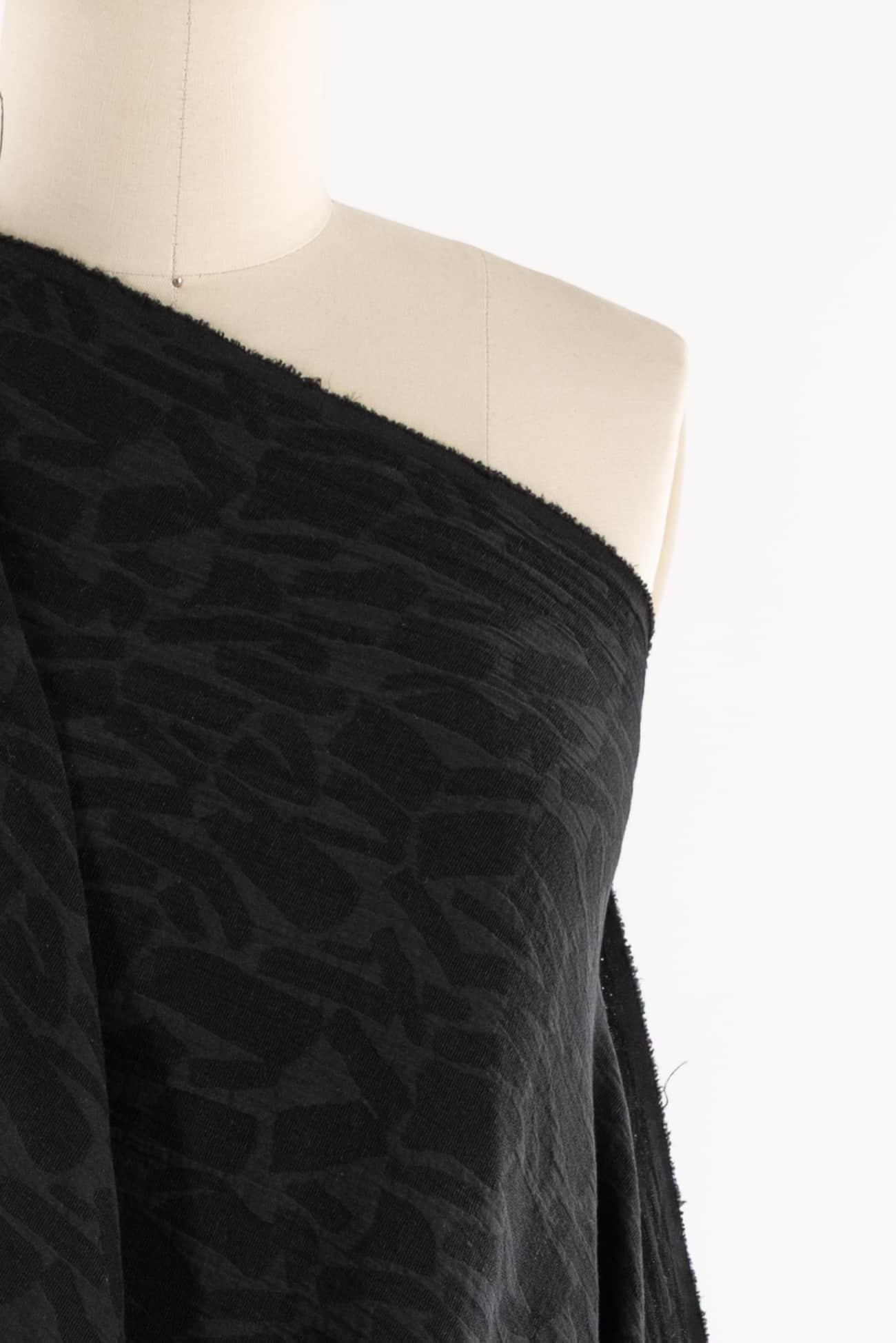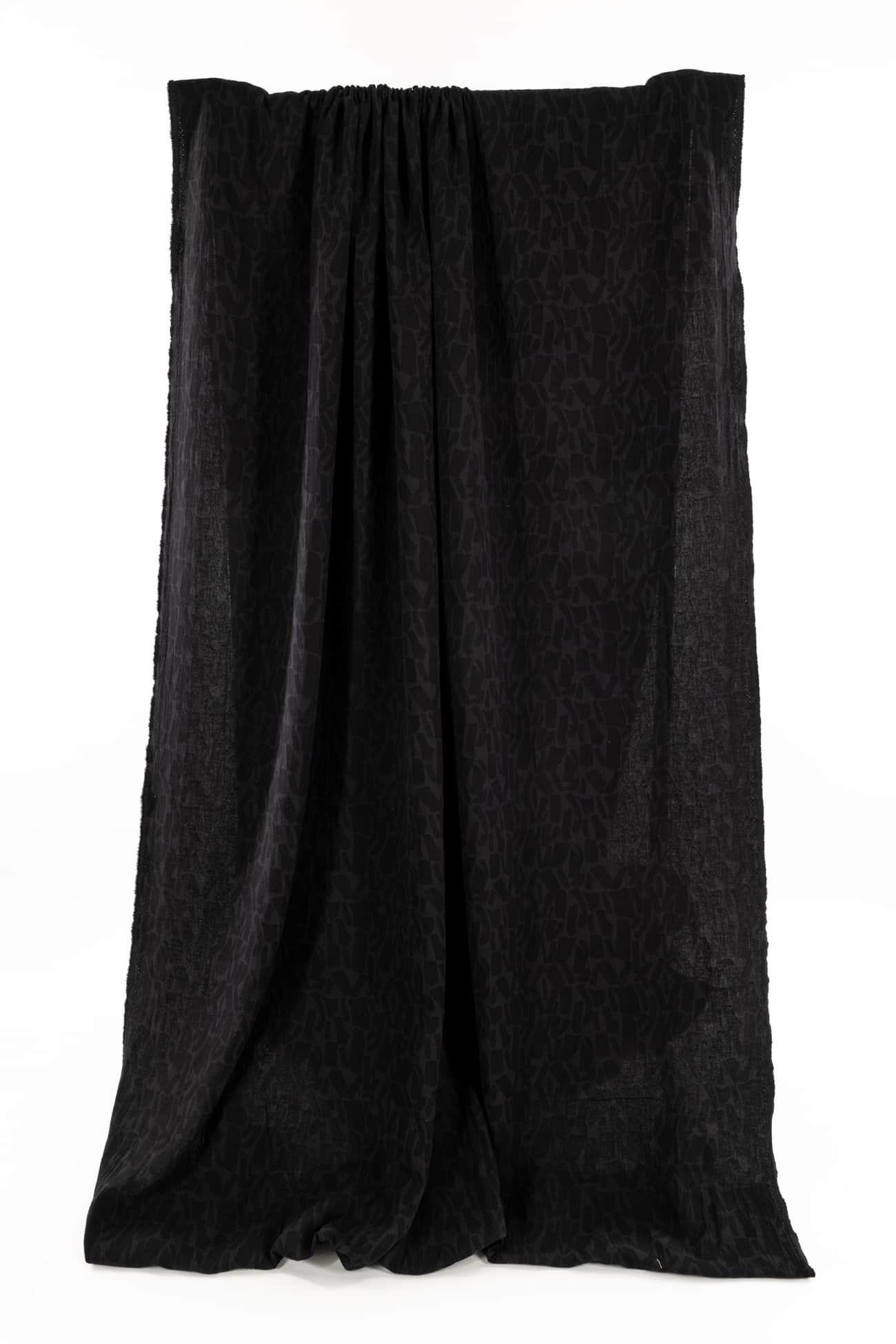 Quietly beautiful in all ways, black cotton blend jacquard has a softly textured abstract/organic geometric woven in all-over design. Light suiting weight with a touch of depth, subtle texture, soft hand, and malleable drape. Use either or both sides. Feels delicious, no wrinkling, ideal for a jacket, vest, duster coat, or structured dress. Marcy says, 'I've lightened up the black to show the texture, but it is true black. Perfect for travel, ideal for a layering piece to dress up or down.'