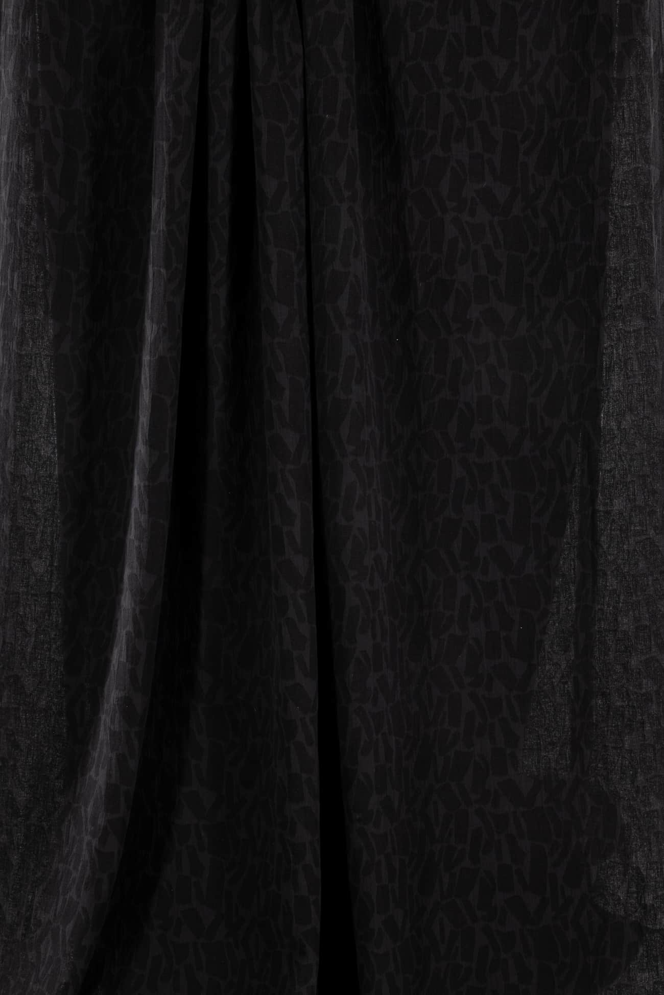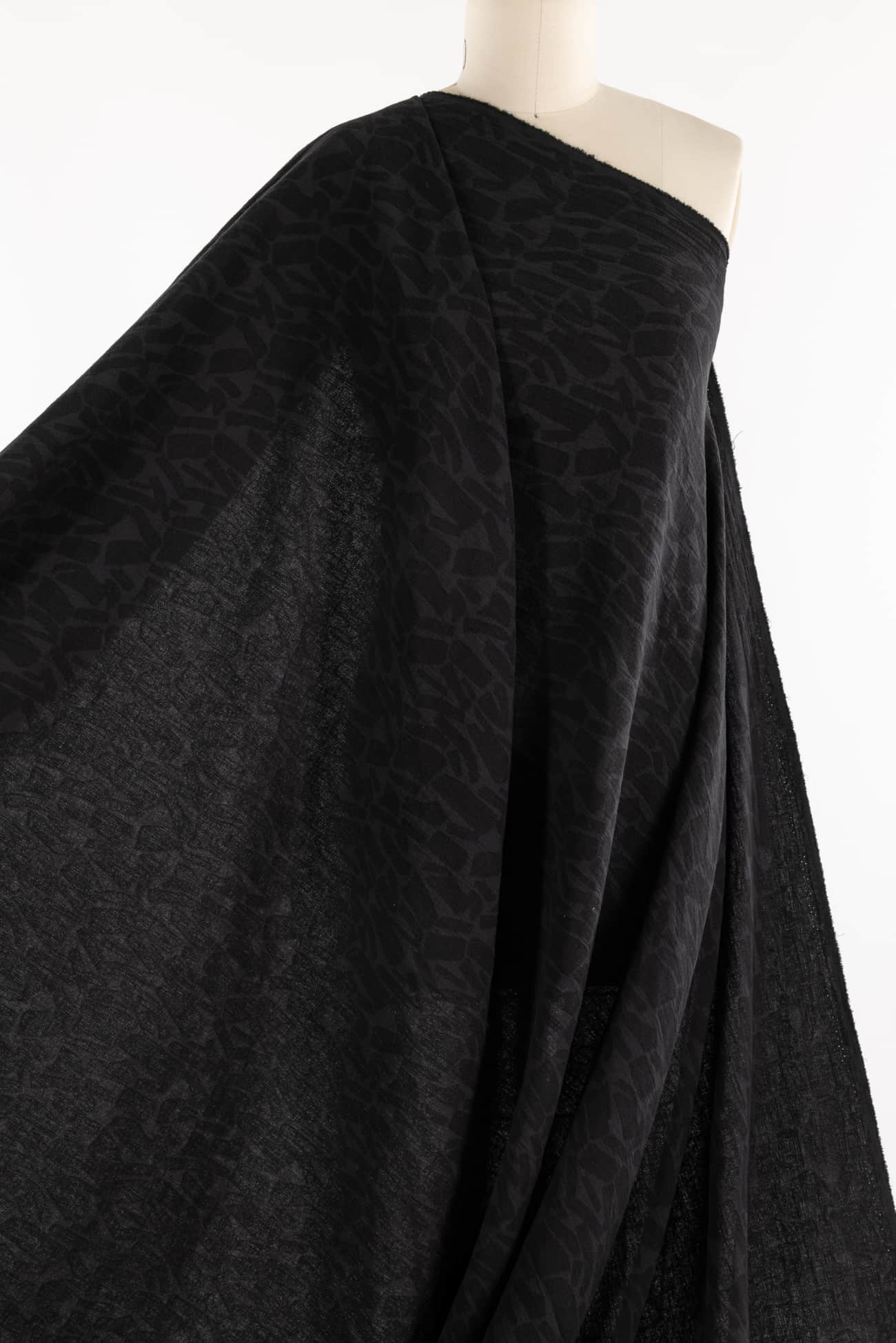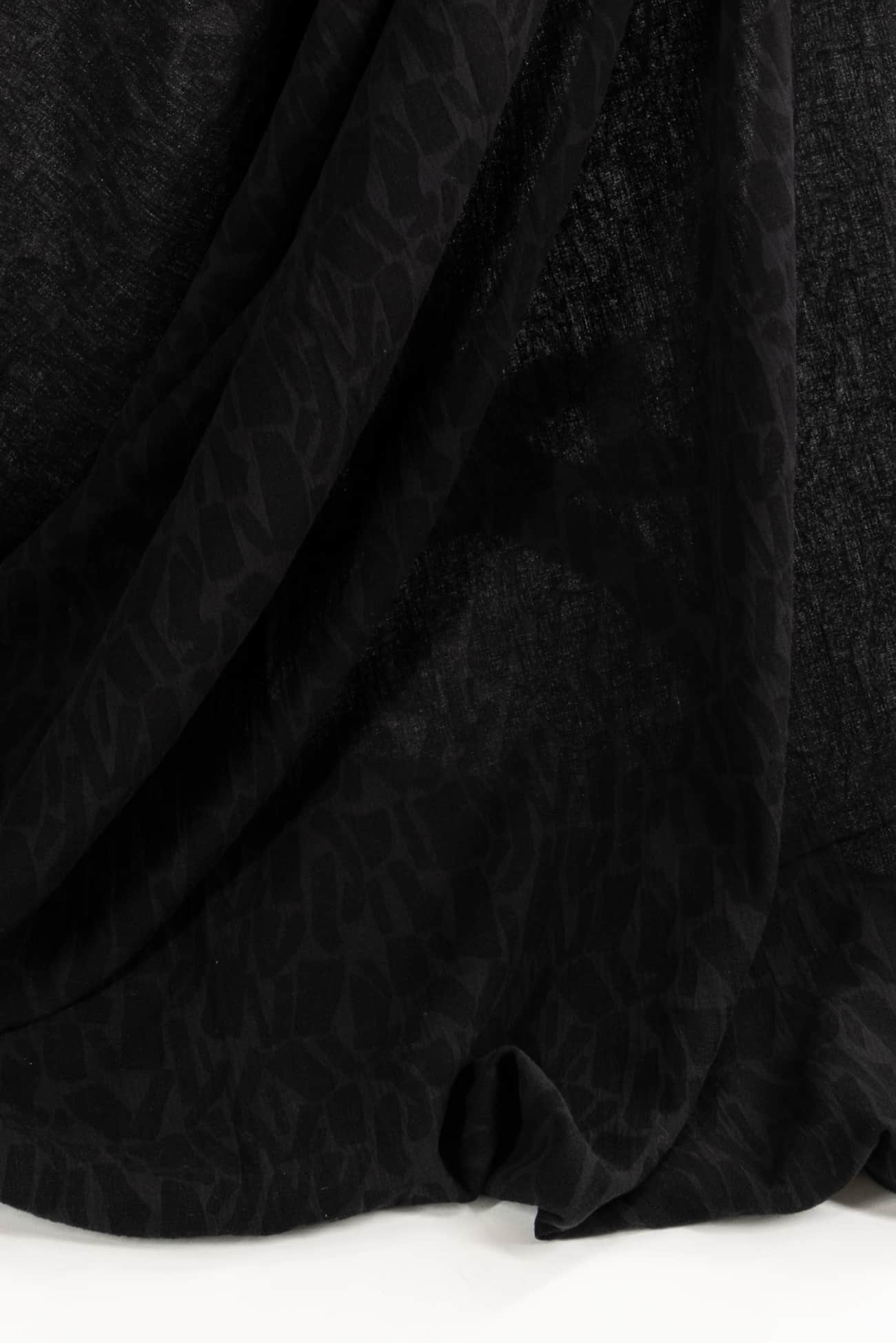 Quietly beautiful in all ways, black cotton blend jacquard has a softly textured abstract/organic geometric woven in all-over design. Light suiting weight with a touch of depth, subtle texture, soft hand, and malleable drape. Use either or both sides. Feels delicious, no wrinkling, ideal for a jacket, vest, duster coat, or structured dress. Marcy says, 'I've lightened up the black to show the texture, but it is true black. Perfect for travel, ideal for a layering piece to dress up or down.'