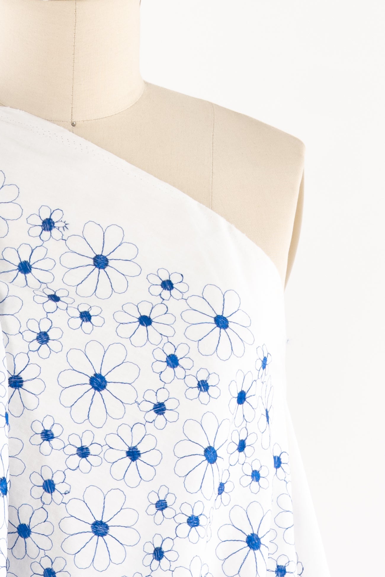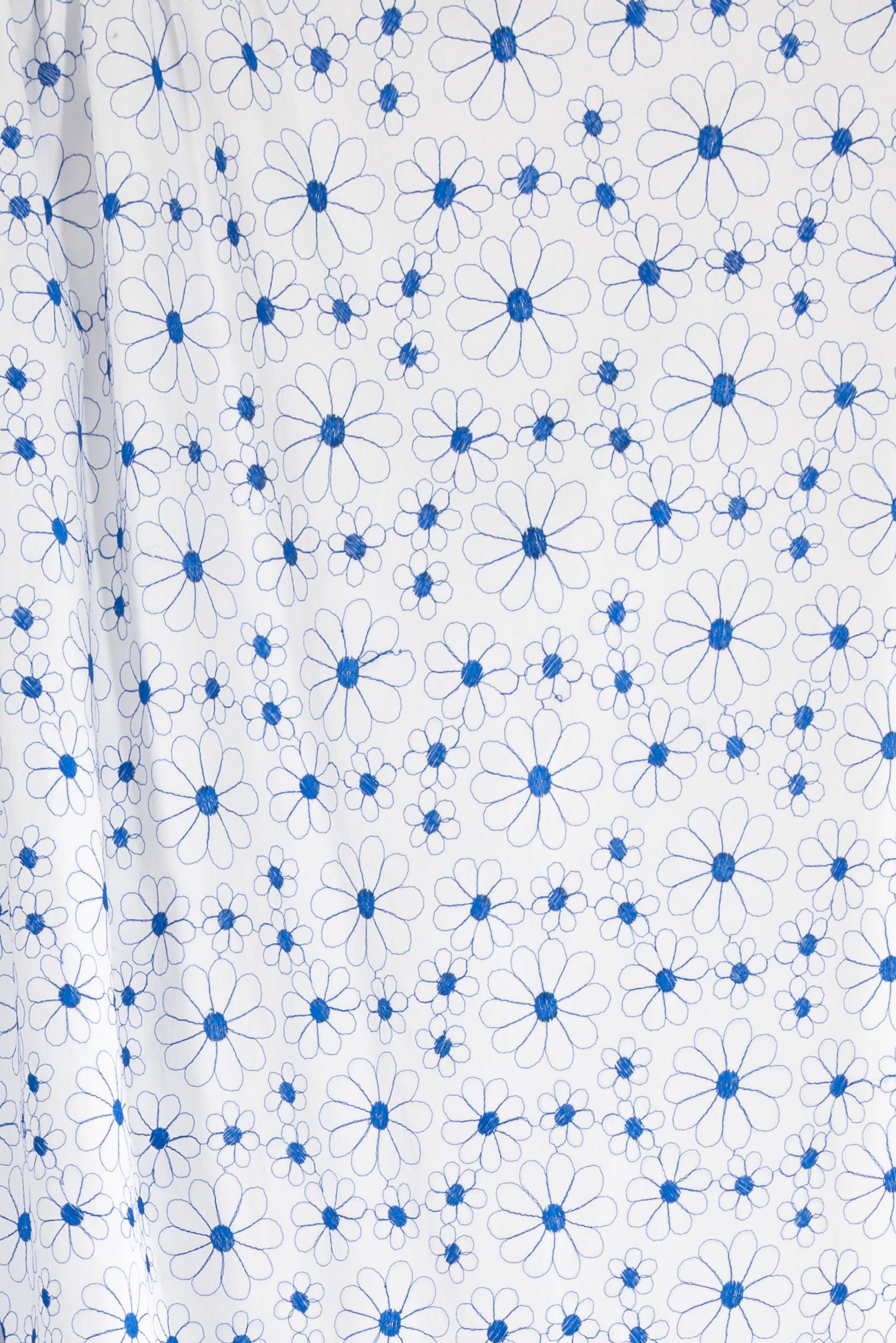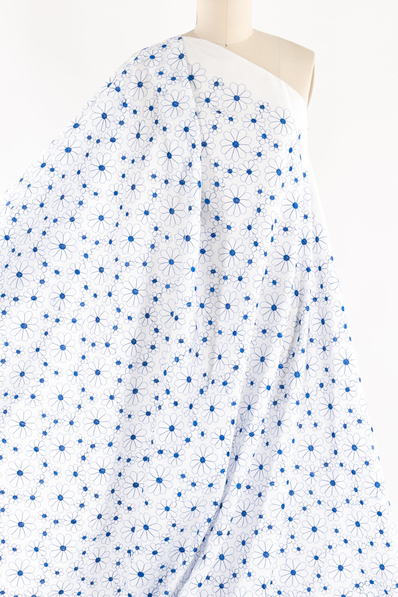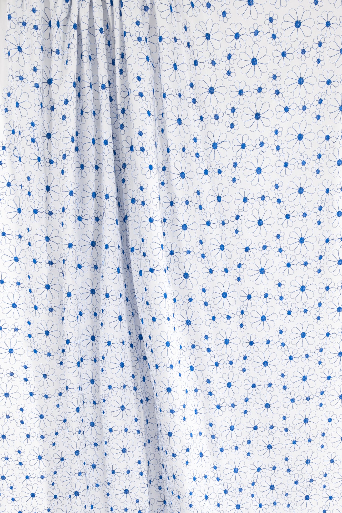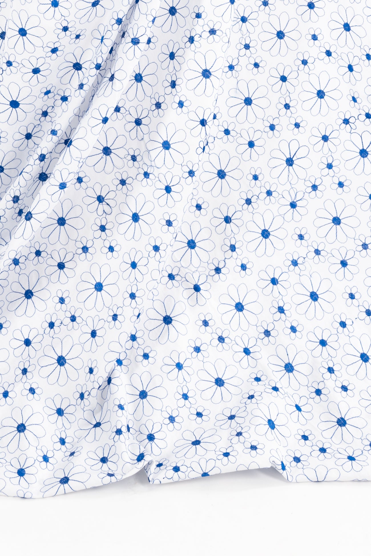Delicate embroidered daisies in blue on white in a fine quality cotton, deadstock from an LA designer. Light/mid-weight with a smooth matte hand, the floral motif embroidery adds a touch of texture, a 4" repeat and supple drape. Right for a shirt, top, tunic, dress, skirt, soft pants or children's.
