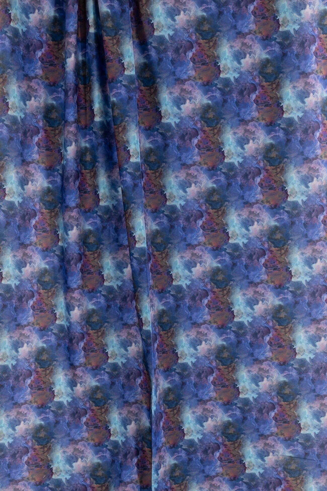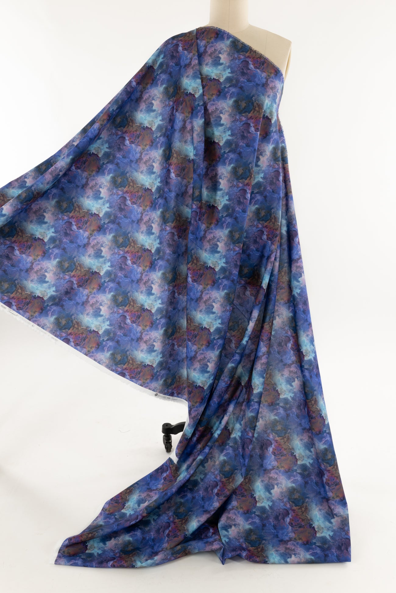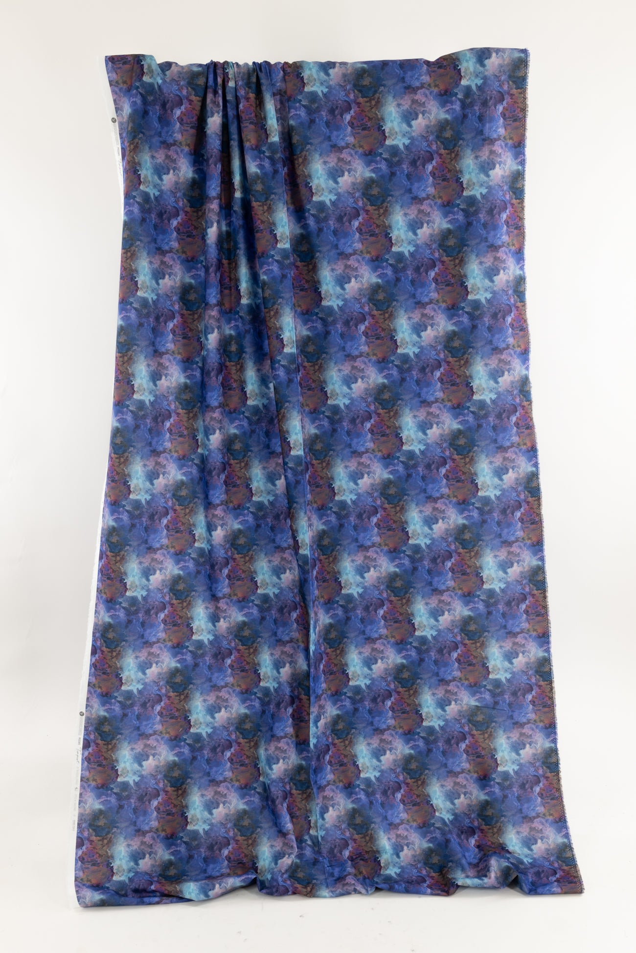 Stunning blue, purple, navy, and cocoa fluid abstract reminiscent of reflections in water. Lightweight, opaque, with a smooth cool hand, 7¾" repeat, and soft drape. Oeko-Tex® certified. Right for a dress, skirt, shirt, tunic, caftan, kimono, soft pant, men's, or children's wear.