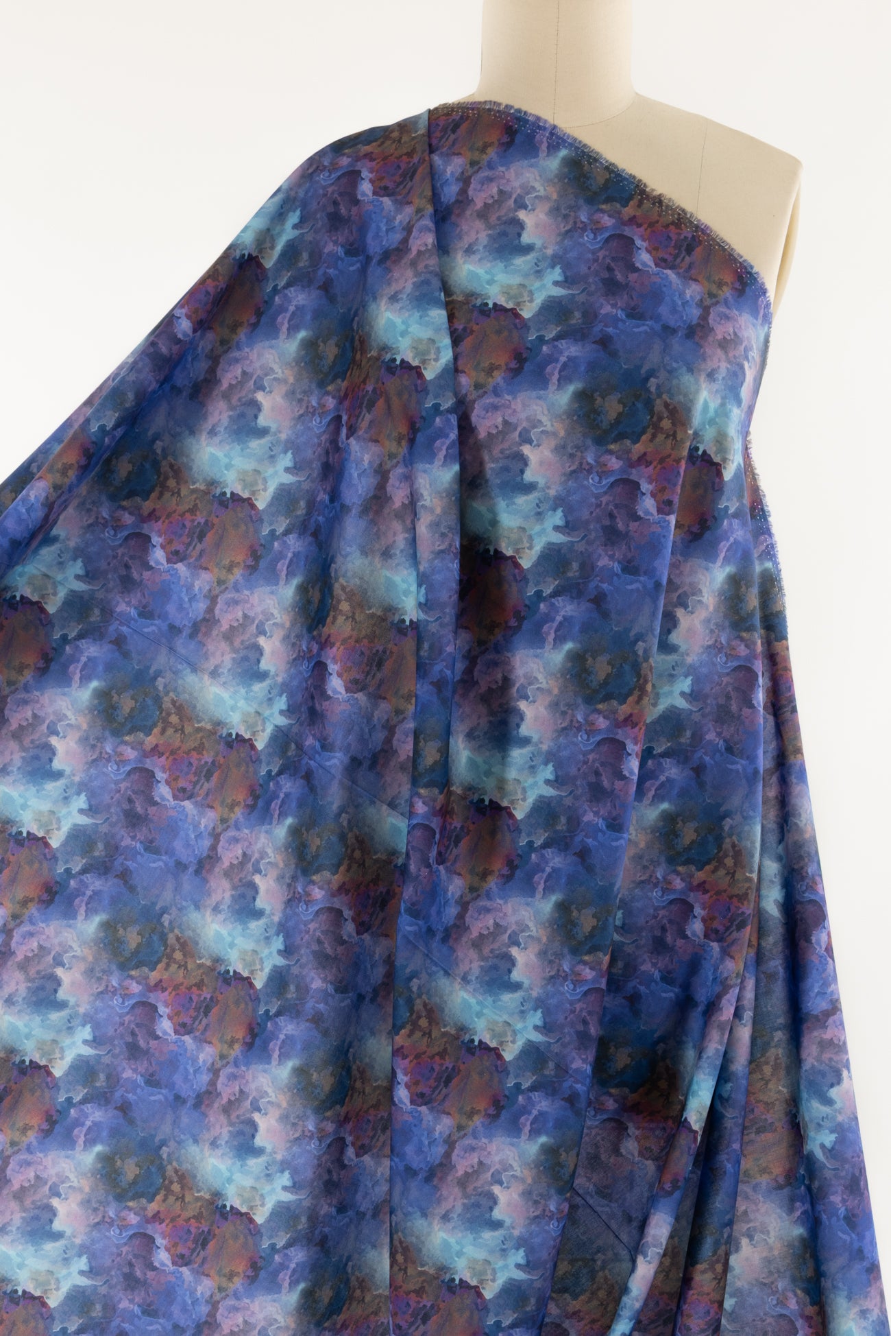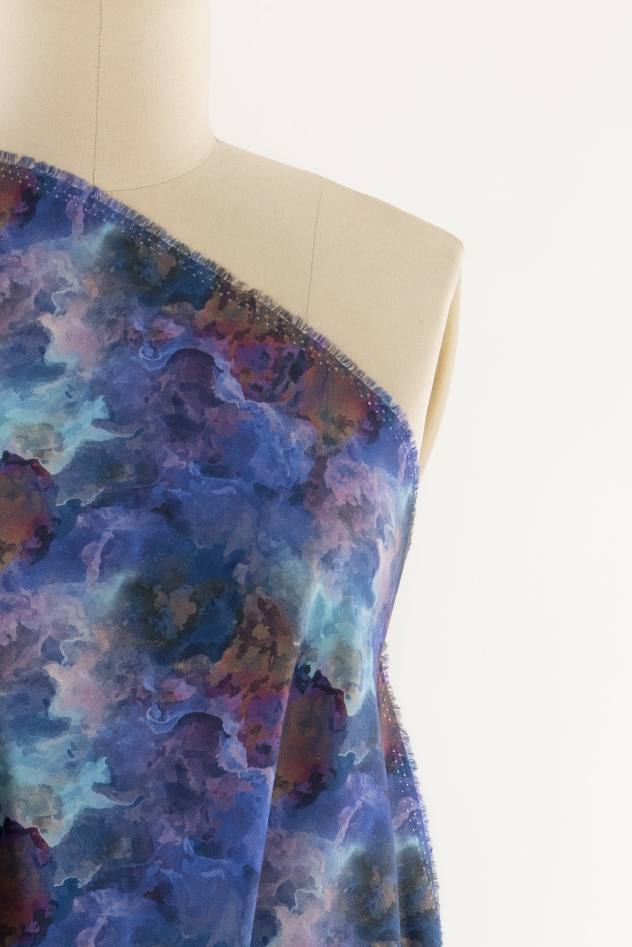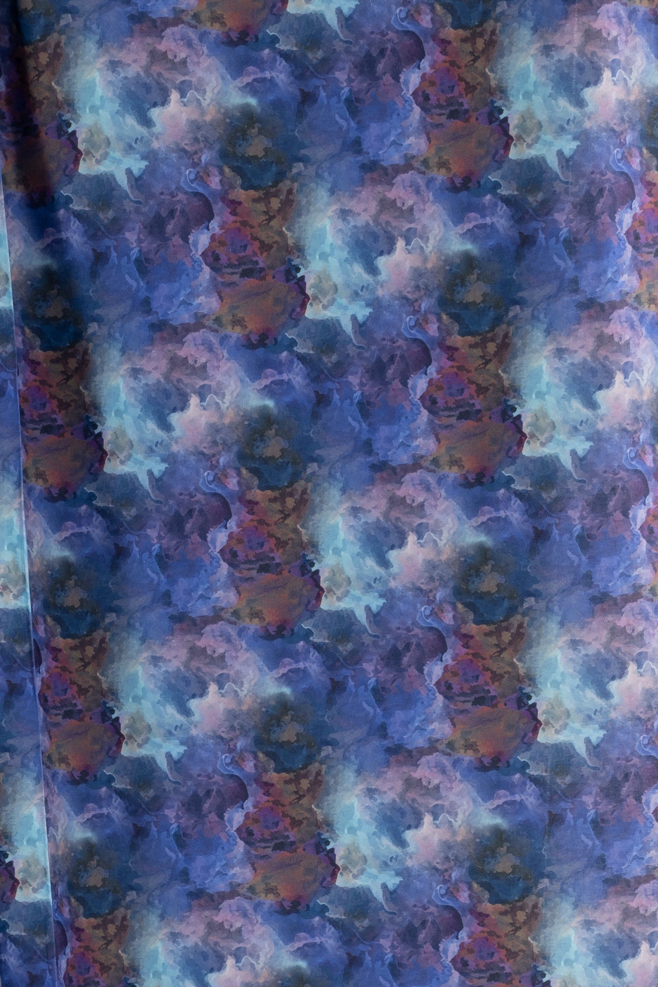 Stunning blue, purple, navy, and cocoa fluid abstract reminiscent of reflections in water. Lightweight, opaque, with a smooth cool hand, 7¾" repeat, and soft drape. Oeko-Tex® certified. Right for a dress, skirt, shirt, tunic, caftan, kimono, soft pant, men's, or children's wear.