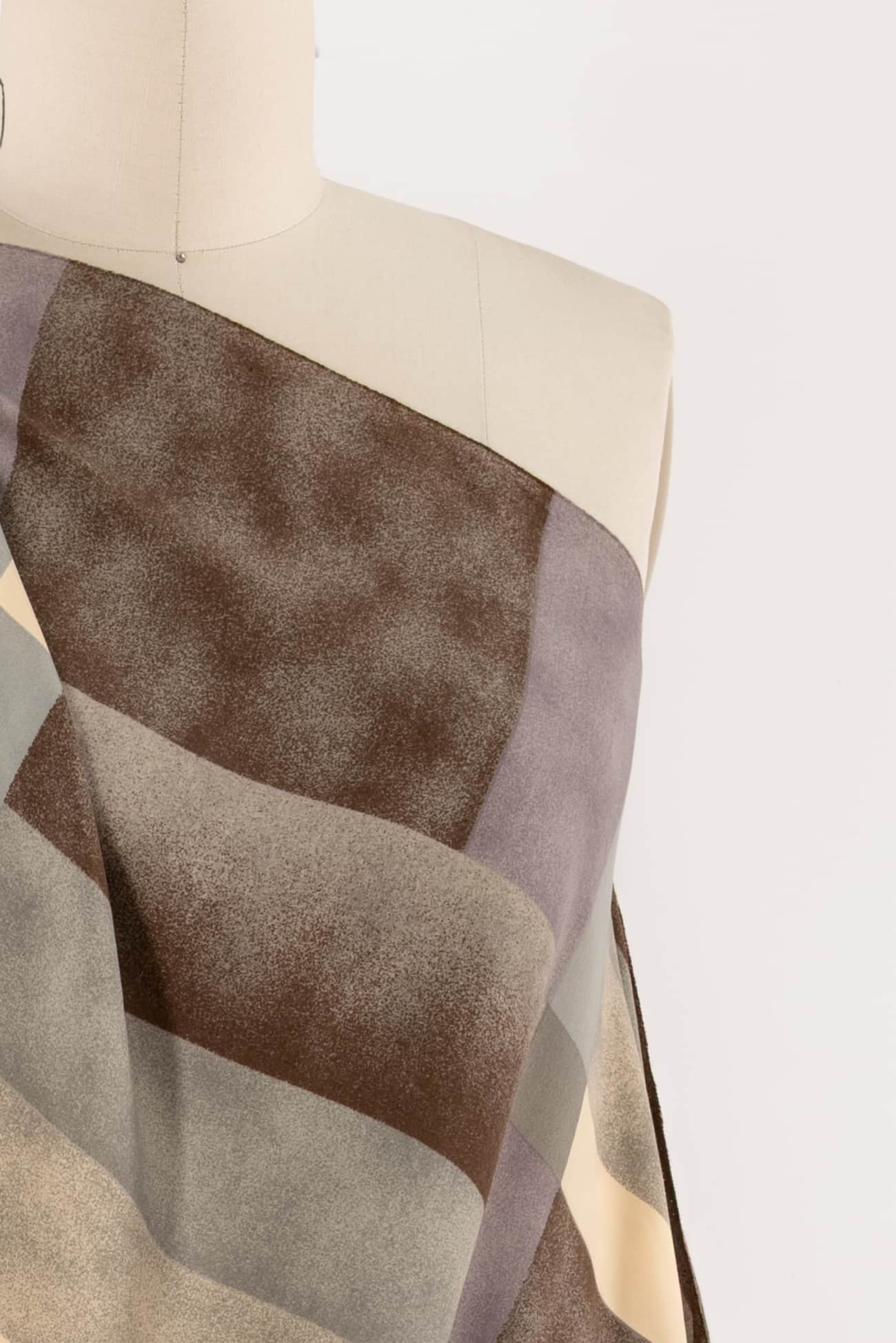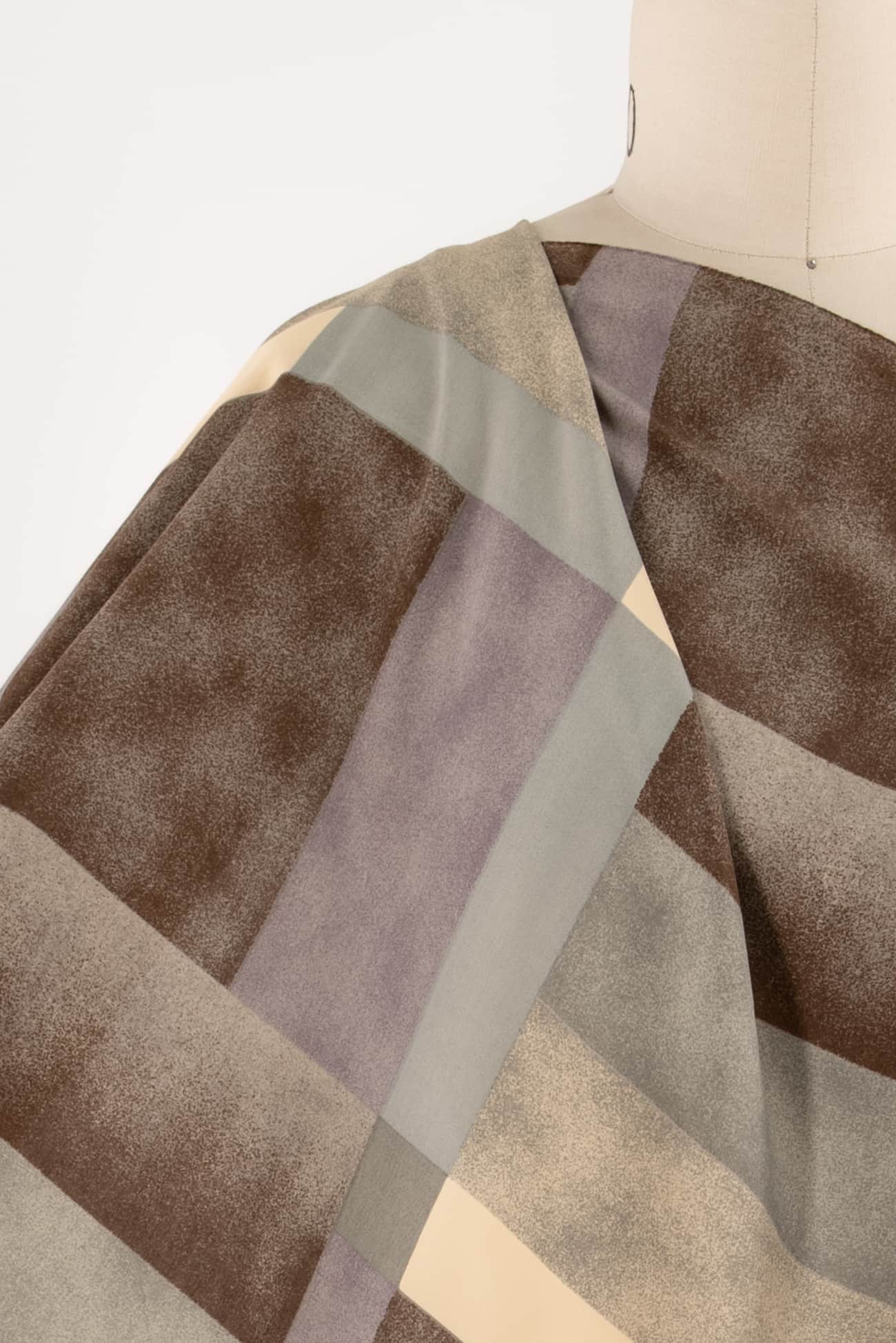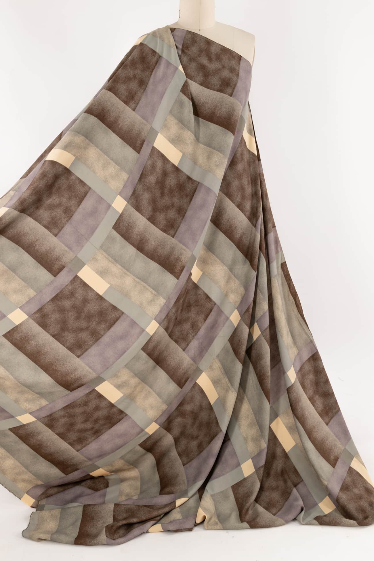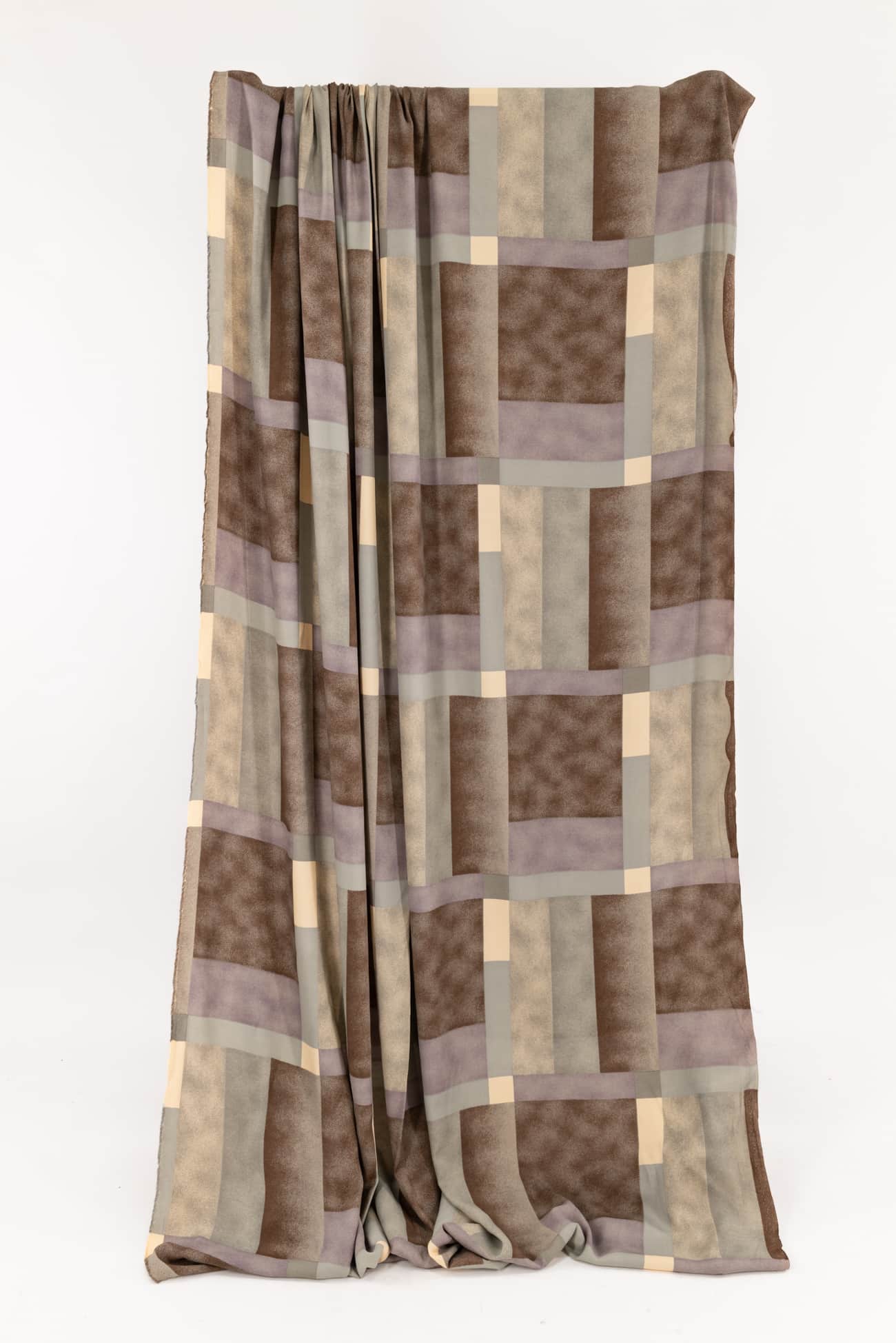 Quietly gorgeous geometry in shades of brown, taupe and beige in a lovely viscose woven. Finely woven faille from, deadstock from an Italian mill is lightweight with a silky malleable hand, a 23¾" repeat and soft drape. Just right for a shirt, tunic, top, vest, soft pant, dress, caftan, kimono or men's.