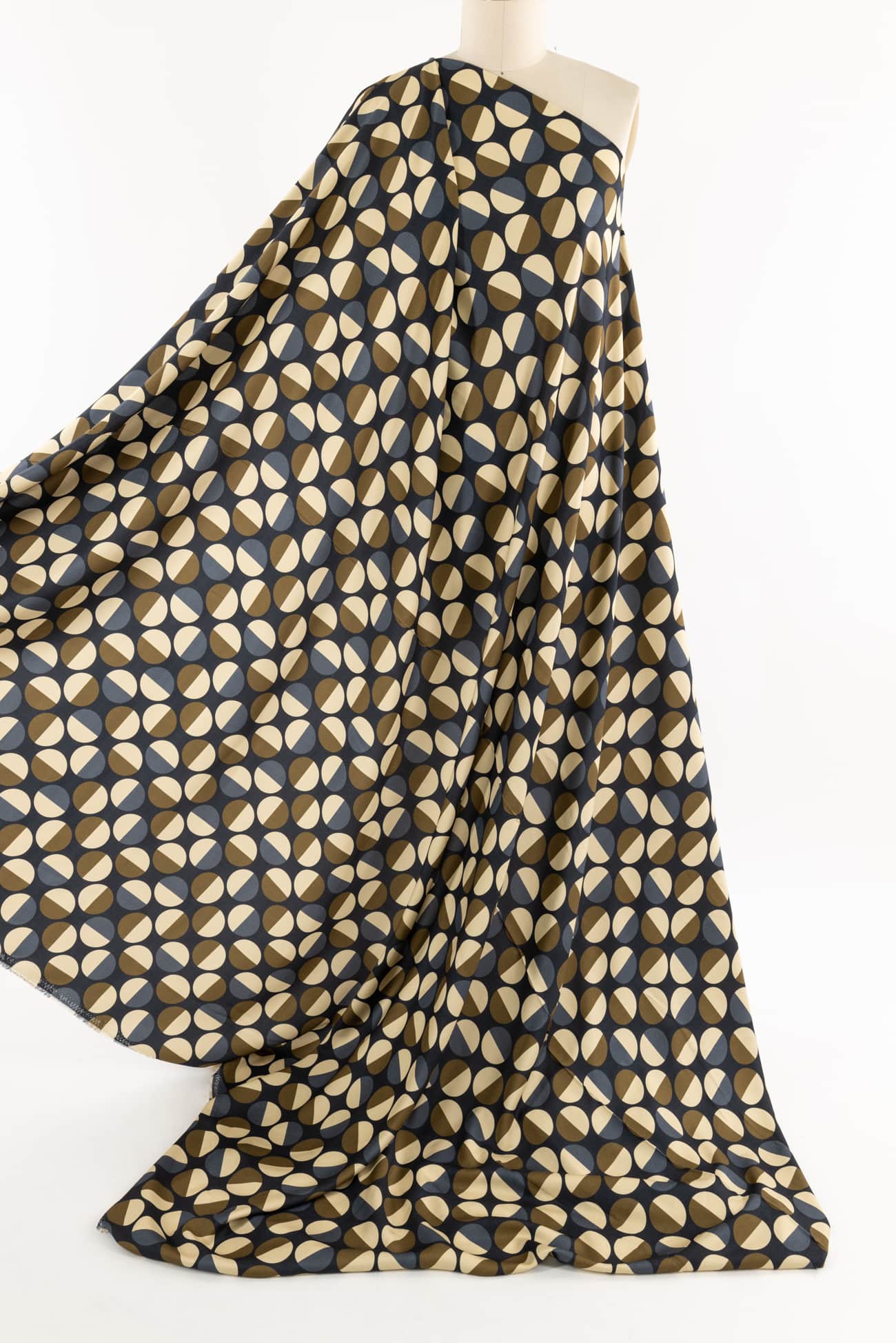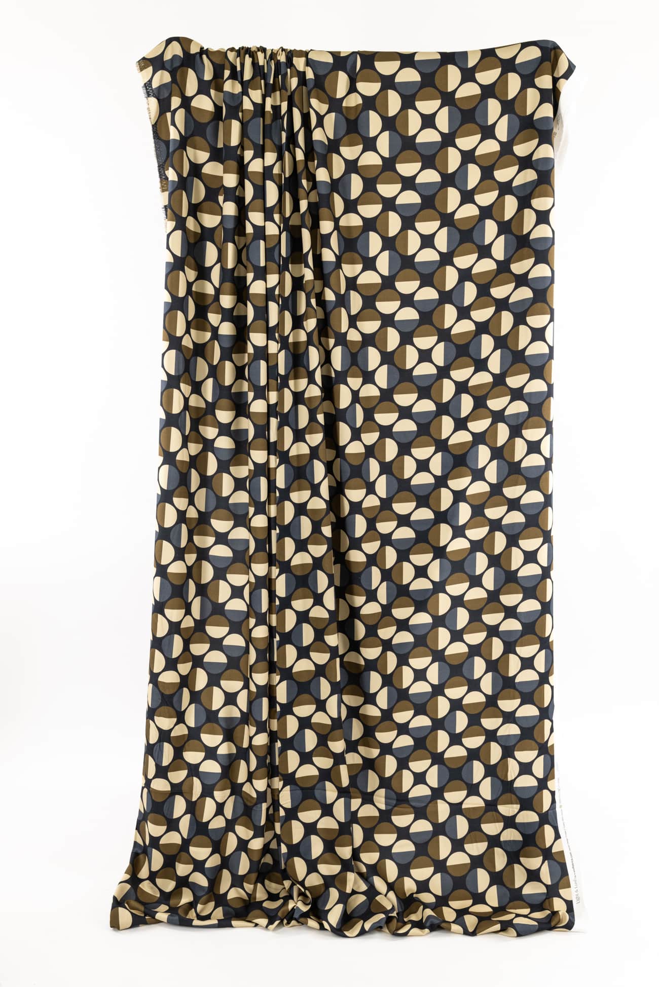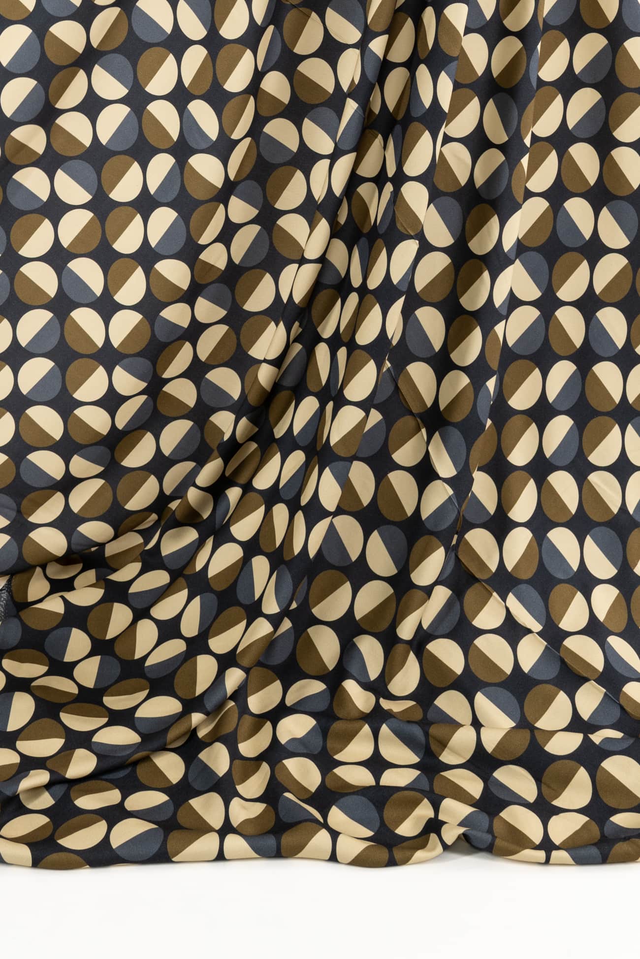 Modern geometric with circles in rich shades of pale yellow, dark dijon, charcoal and black, in a gorgeous digital print on an impeccable European quality viscose woven, produced in Denmark. Light/mid-weight, opaque and will skim the body in a flattering way. It has a soft smooth hand, an 8¼" repeat and fluid drape. Right for a dress, shirt, soft pants, blouse, tunic, skirt, loungewear, men's or children's. Oeko-Tex® certified.