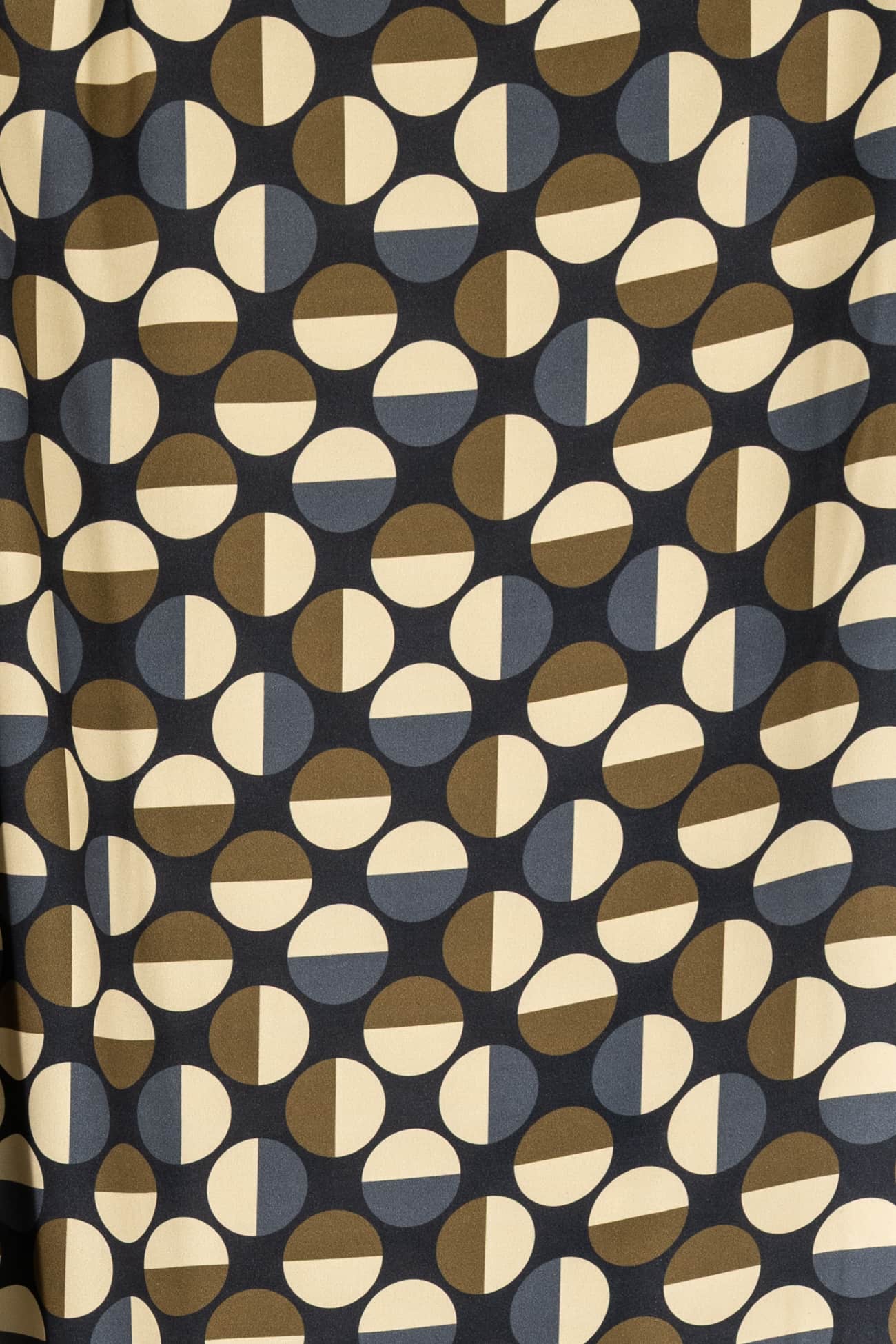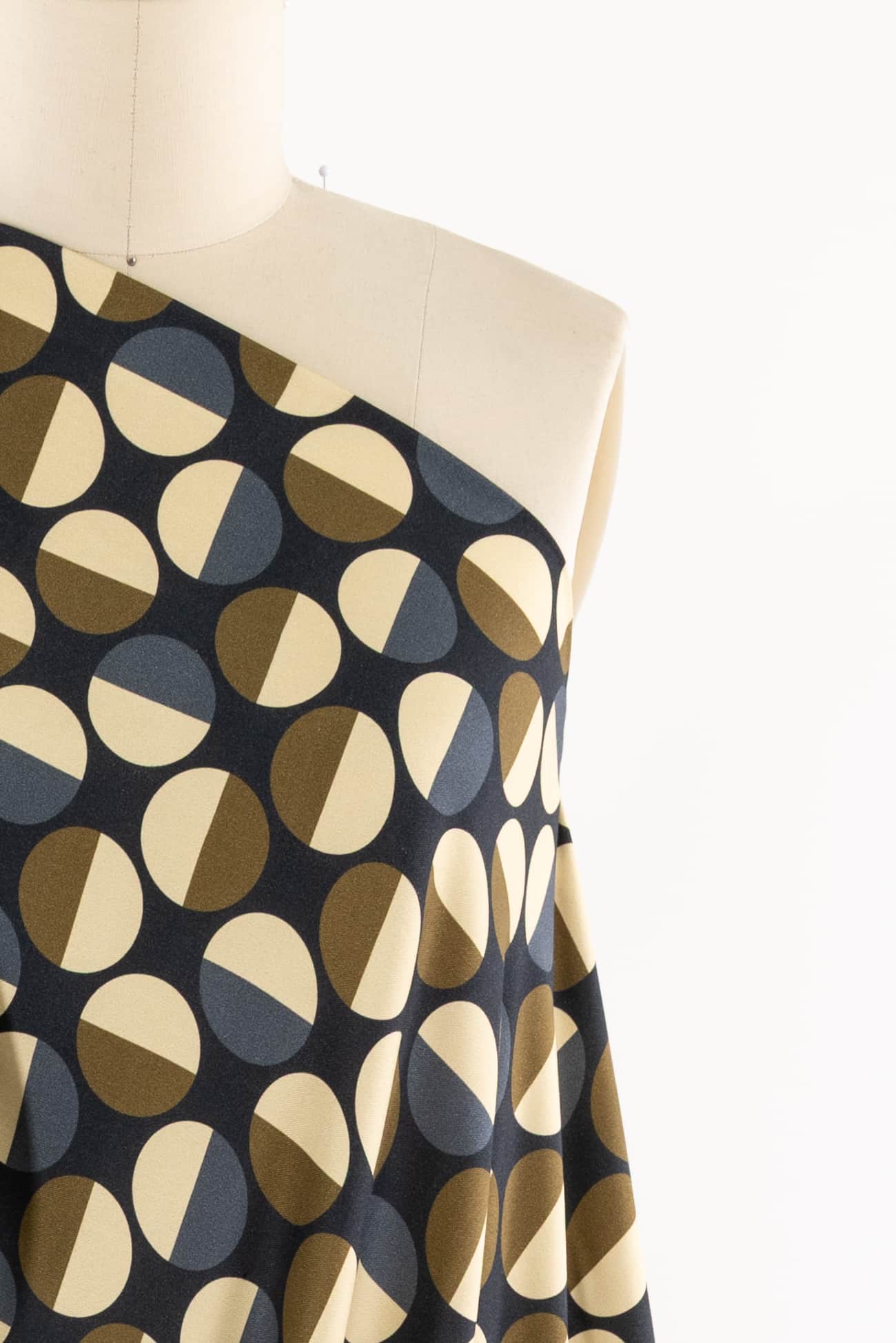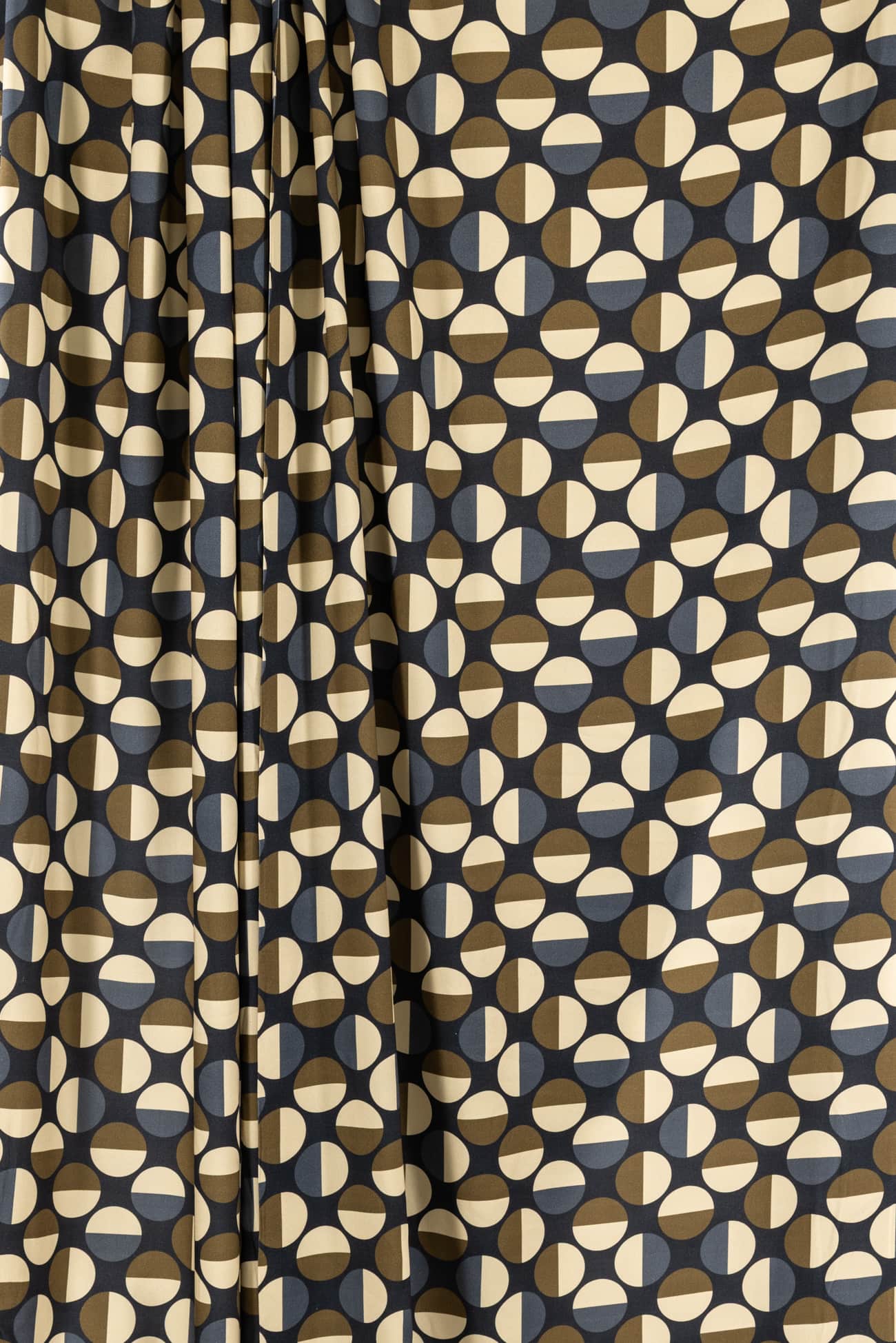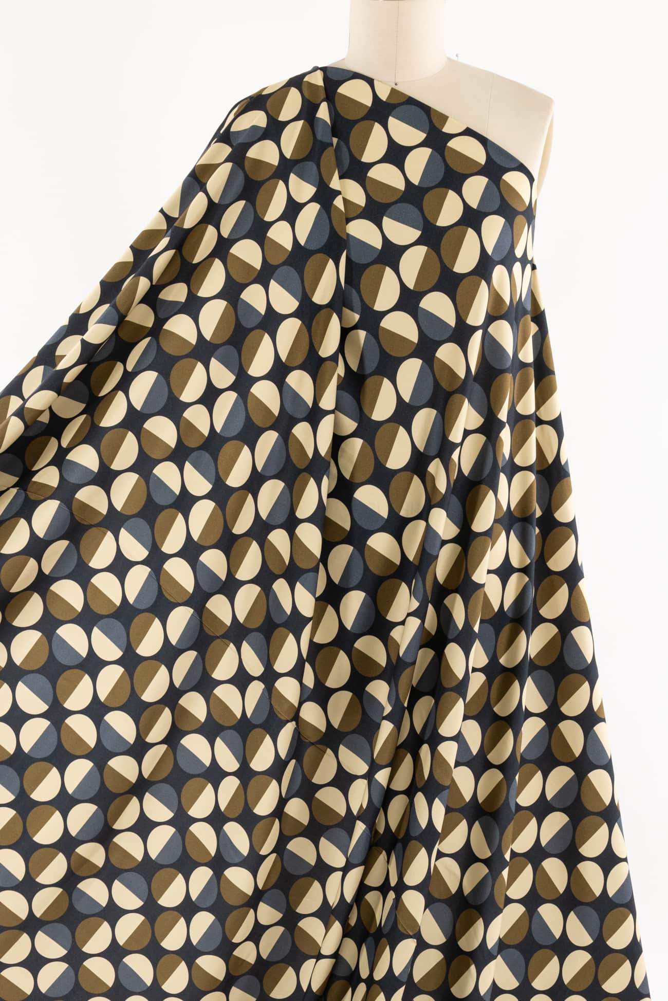 Modern geometric with circles in rich shades of pale yellow, dark dijon, charcoal and black, in a gorgeous digital print on an impeccable European quality viscose woven, produced in Denmark. Light/mid-weight, opaque and will skim the body in a flattering way. It has a soft smooth hand, an 8¼" repeat and fluid drape. Right for a dress, shirt, soft pants, blouse, tunic, skirt, loungewear, men's or children's. Oeko-Tex® certified.