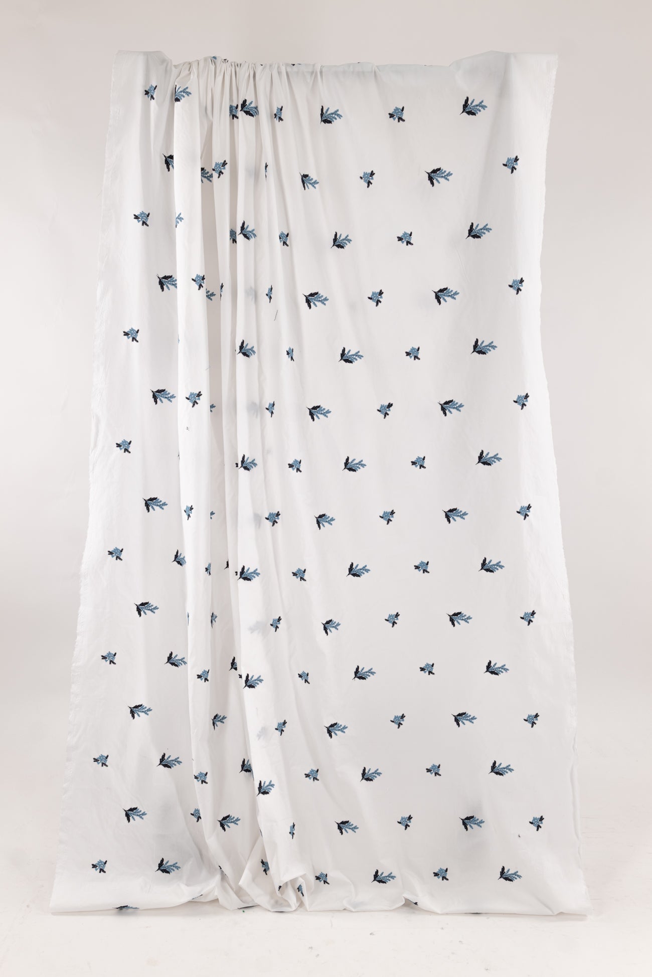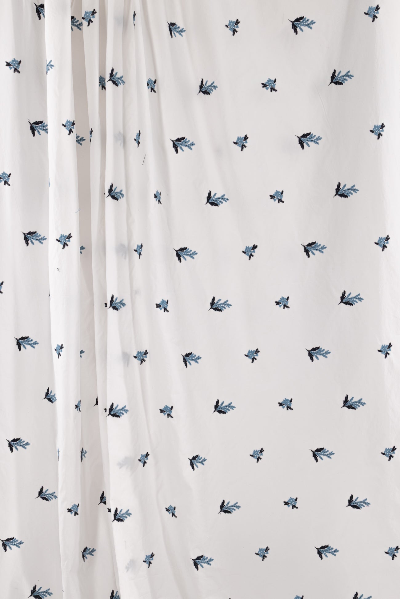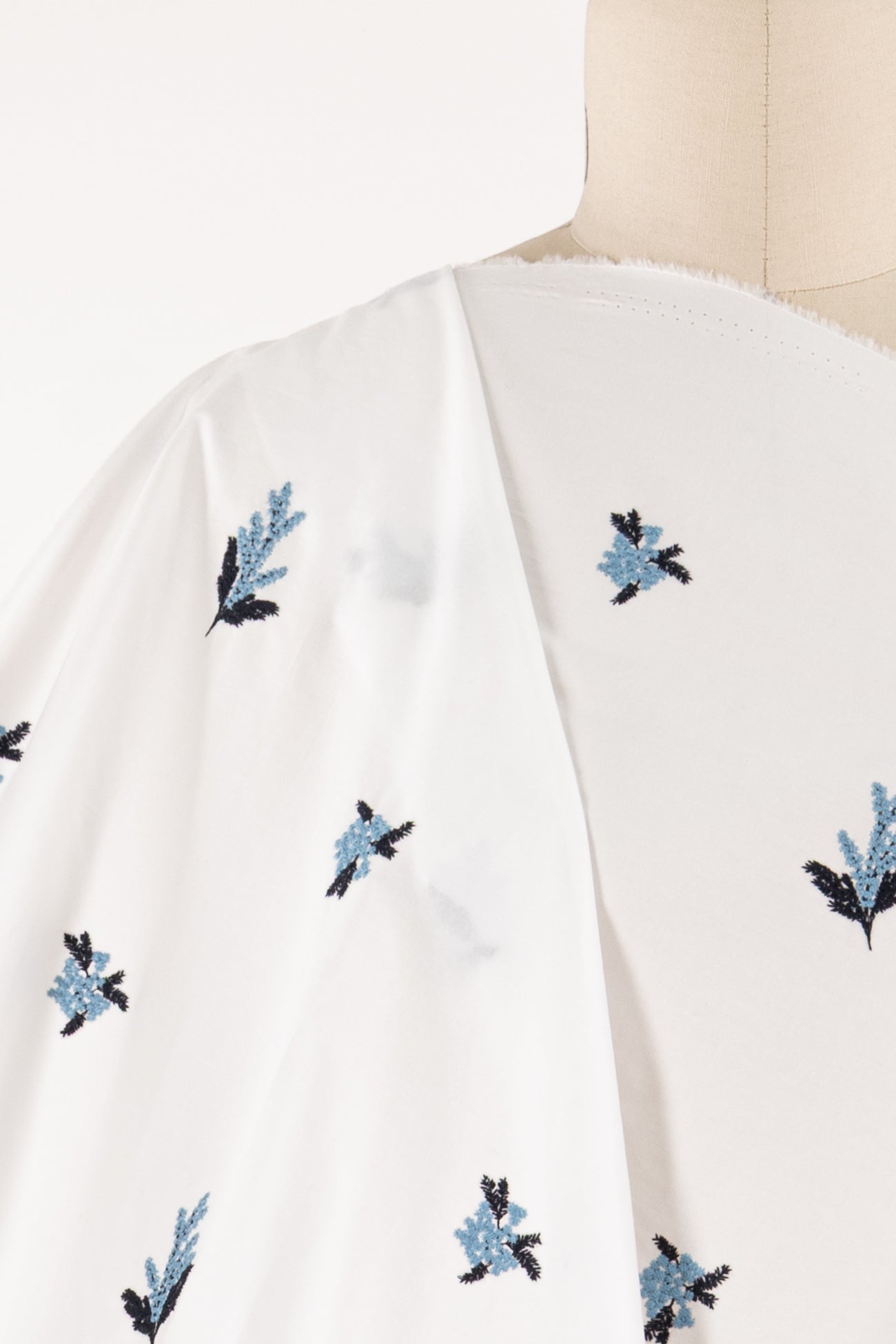 White cotton embroidered with blue and navy flowers, charming deadstock from an LA designer. Light/shirting weight, semi-opaque with a softly embroidered hand, 8½" repeat, and soft drape. Right for a dress, top, tunic, shirt, skirt, soft pant, caftan, kimono, light jacket, or children's.