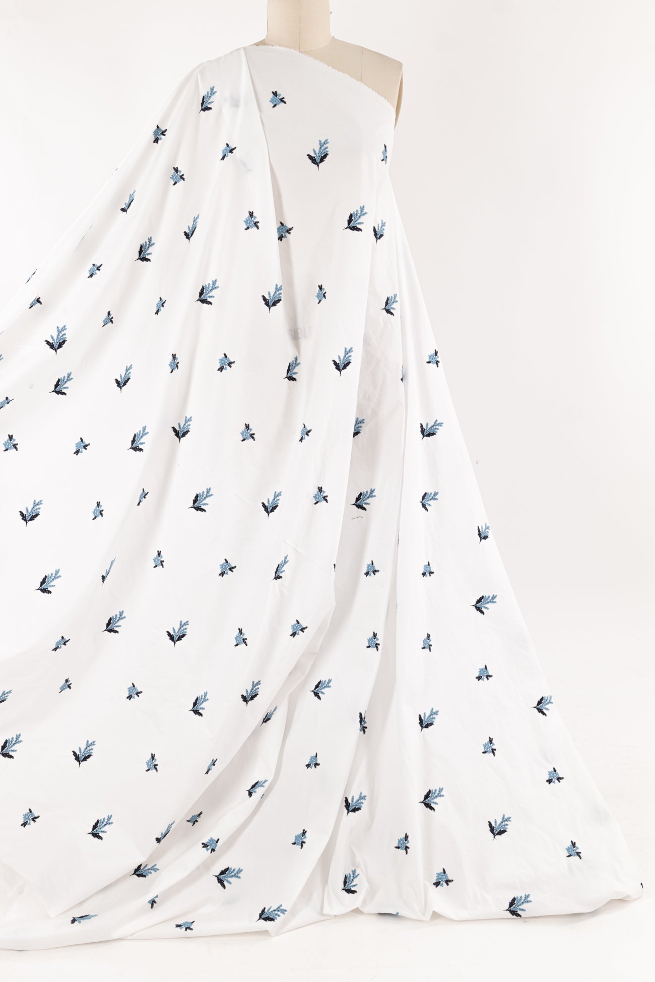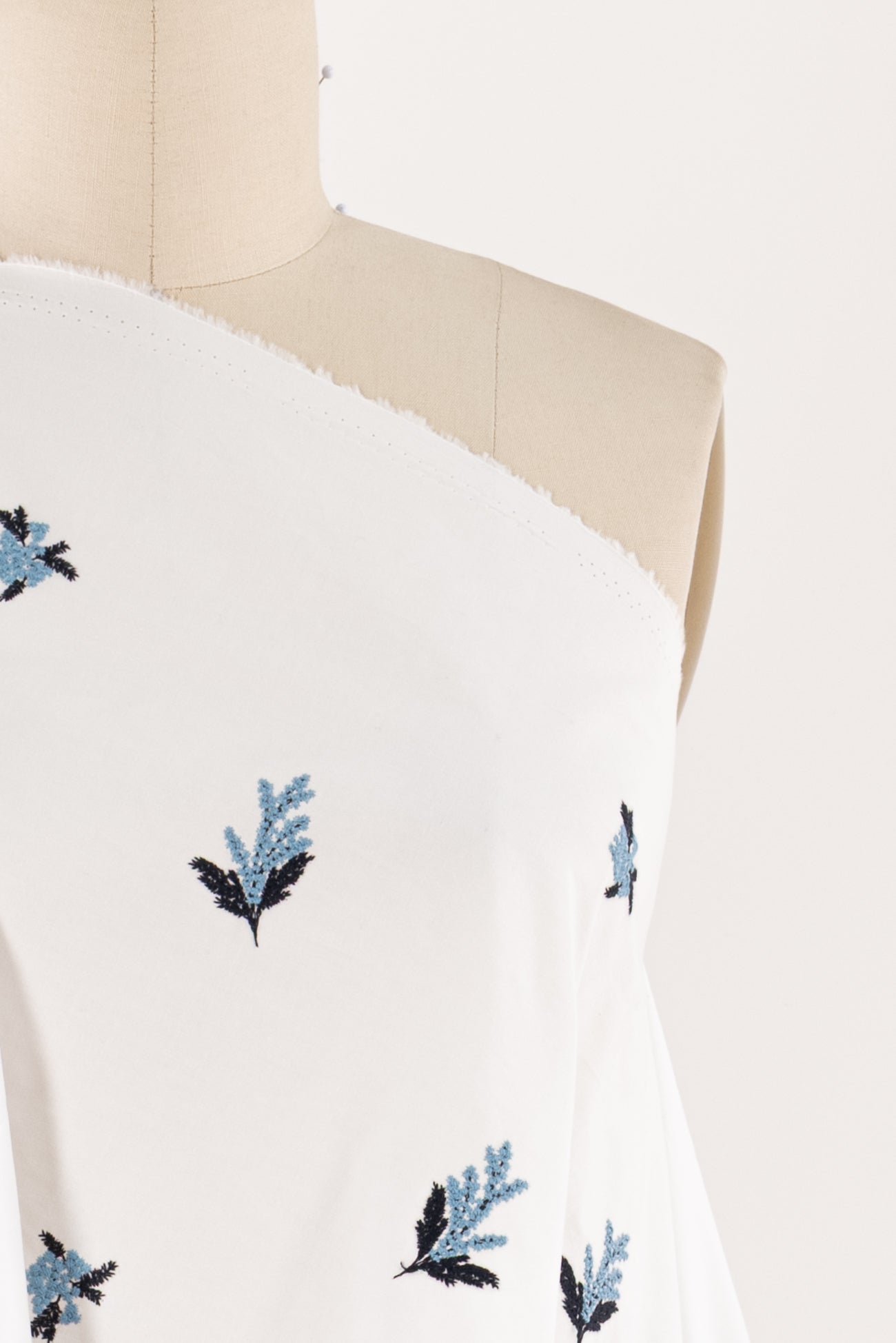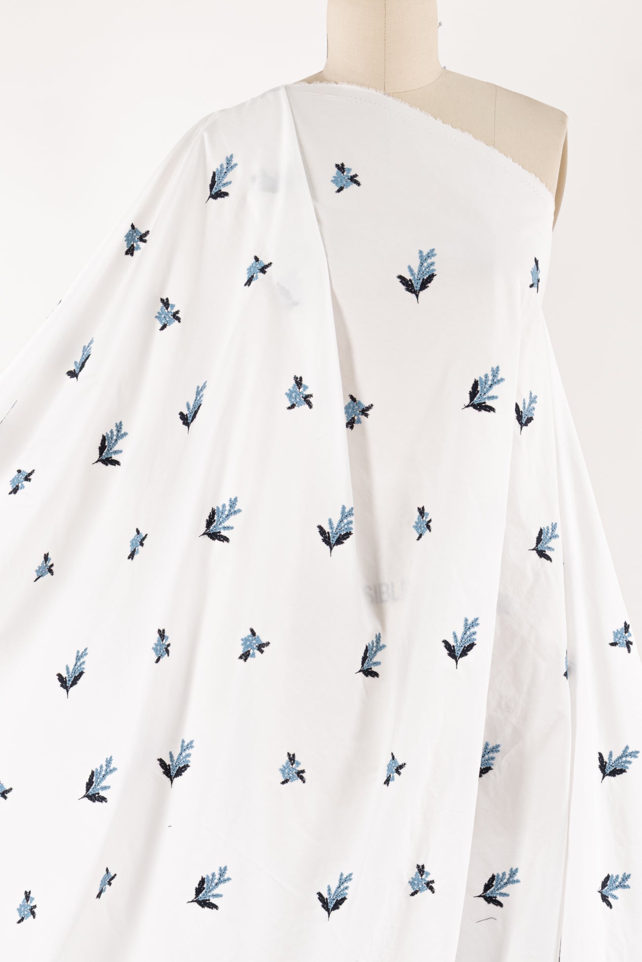 White cotton embroidered with blue and navy flowers, charming deadstock from an LA designer. Light/shirting weight, semi-opaque with a softly embroidered hand, 8½" repeat, and soft drape. Right for a dress, top, tunic, shirt, skirt, soft pant, caftan, kimono, light jacket, or children's.