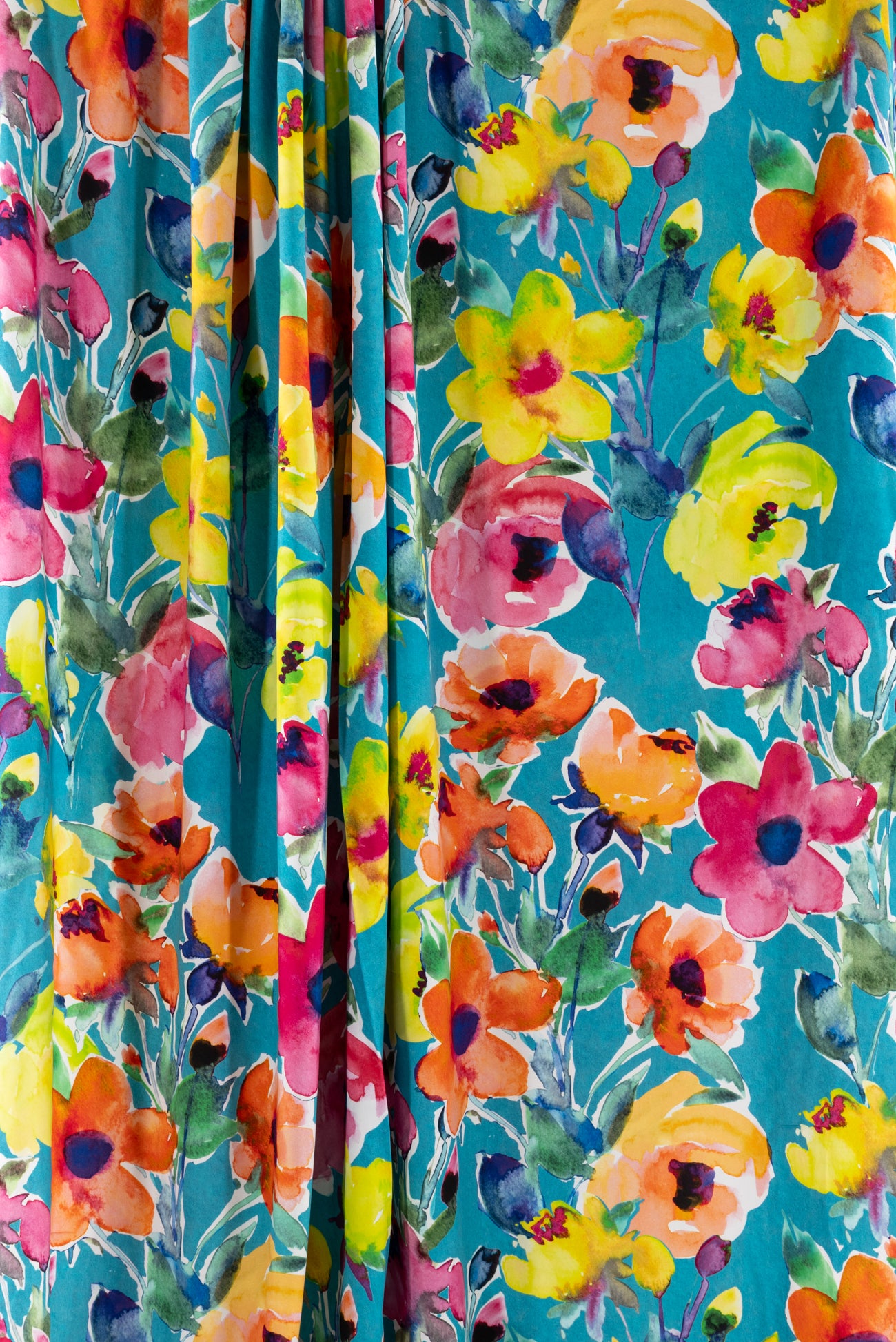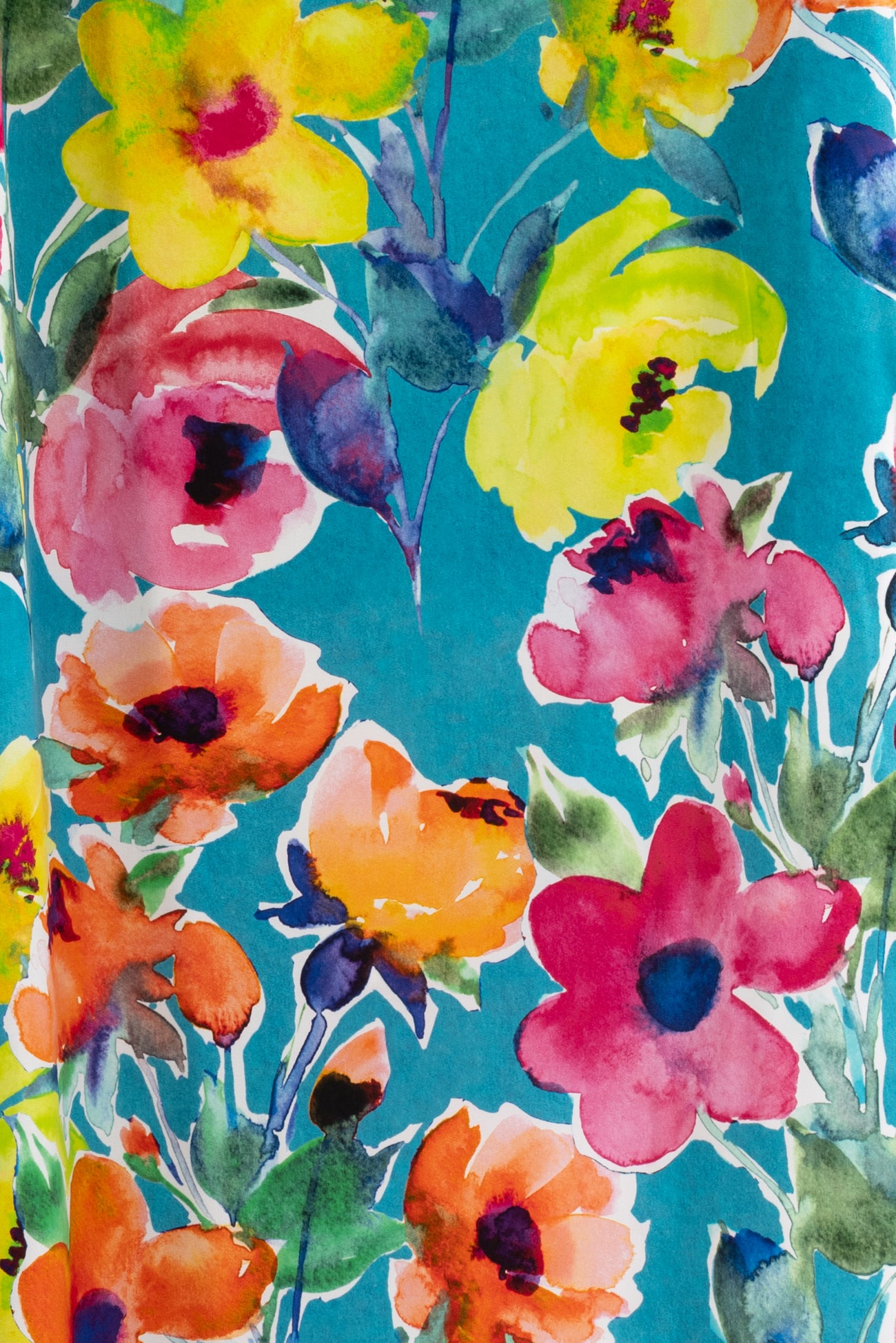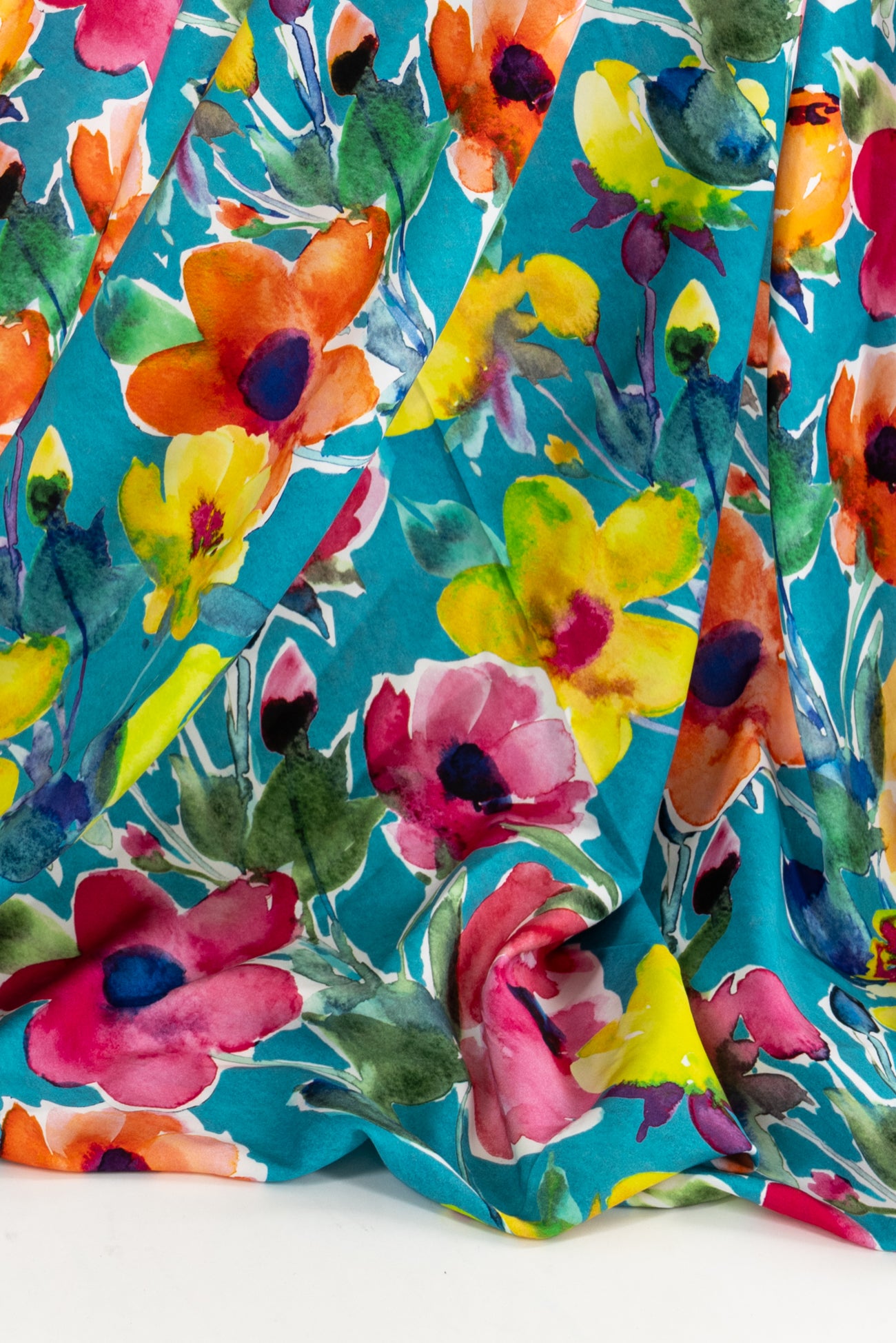 Stunning painterly color saturated floral in pinks and yellows on turquoise, digitally printed on a supple fine grained rayon. Lightweight, opaque, with a smooth, cool, dry hand and fluid liquid drape. Right for a dress, blouse, tunic, skirt, soft pant, jumpsuit, caftan, kimono, children's and men's clothes. One way design, 35¼" repeat. Oeko-Tex® certified.