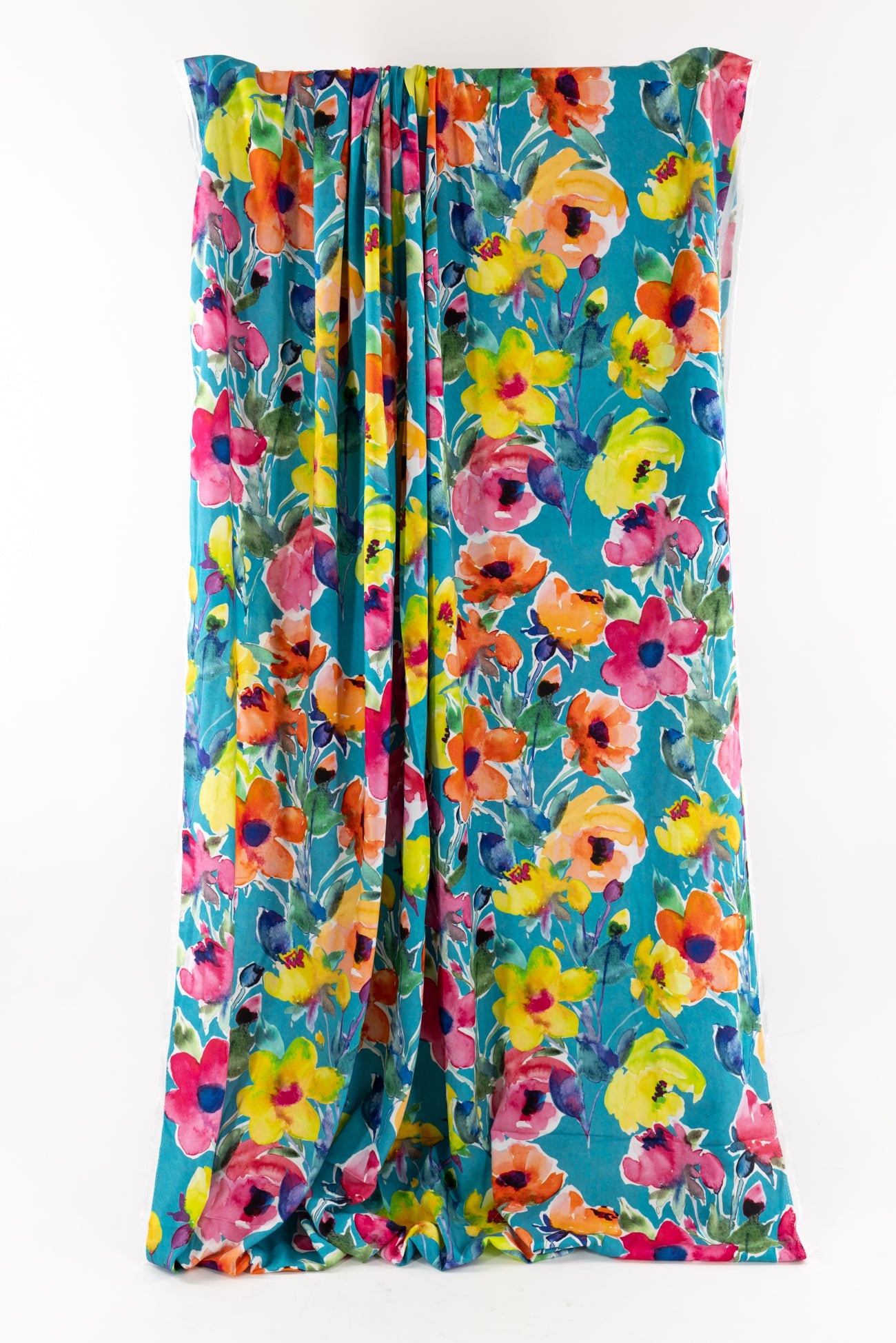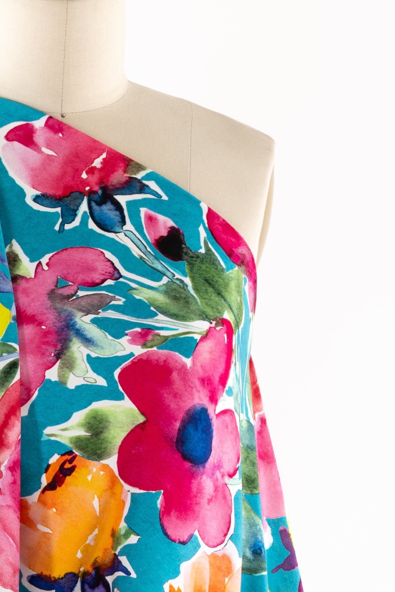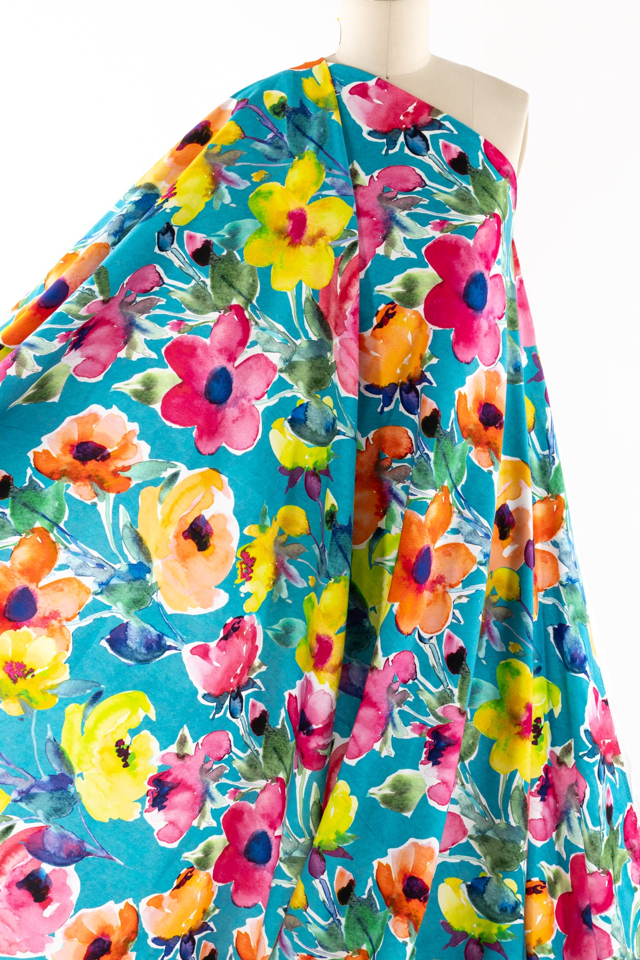 Stunning painterly color saturated floral in pinks and yellows on turquoise, digitally printed on a supple fine grained rayon. Lightweight, opaque, with a smooth, cool, dry hand and fluid liquid drape. Right for a dress, blouse, tunic, skirt, soft pant, jumpsuit, caftan, kimono, children's and men's clothes. One way design, 35¼" repeat. Oeko-Tex® certified.