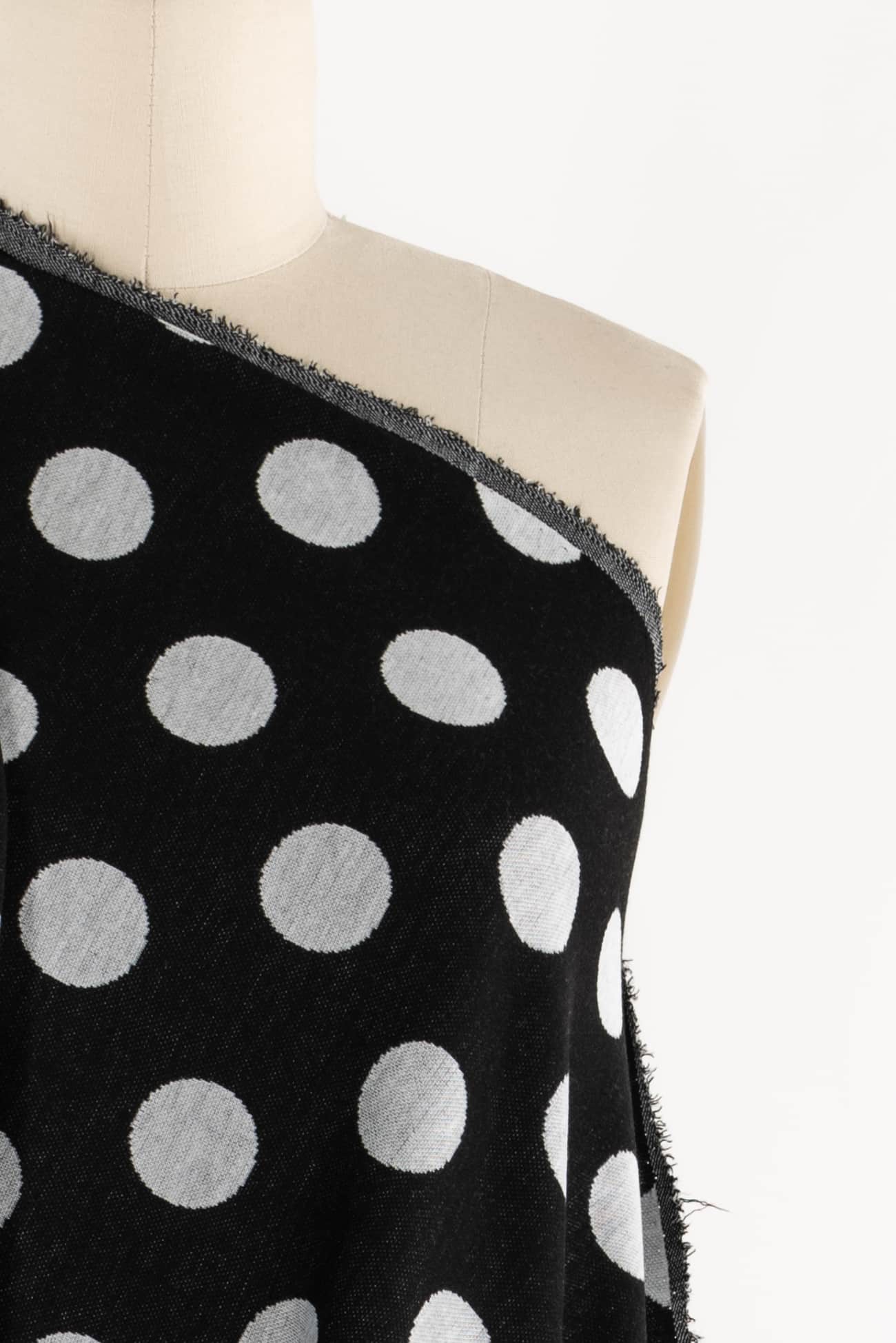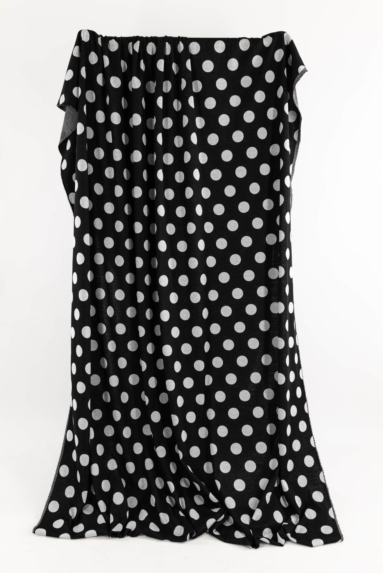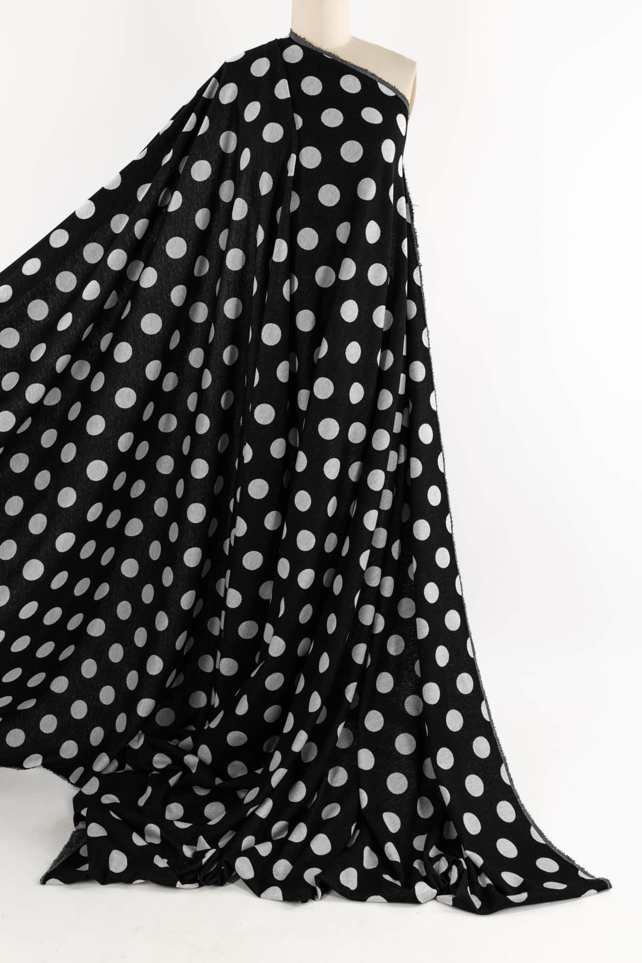 Fun, lovely quality double knit in black with 1 ¼' evenly scattered overall white dots, deadstock, produced in US mills for California designer Katrin Noon. Mid/lightweight, supple soft hand, and drape, stable, 2-way crosswise stretch, no rolling at the cut edge, so cutting and sewing is easy. Right for both tops and bottoms, tunic, t-shirt, dress, sweater, soft pant, jacket, duster coat, jumpsuit, skirt, cardi, kimono.