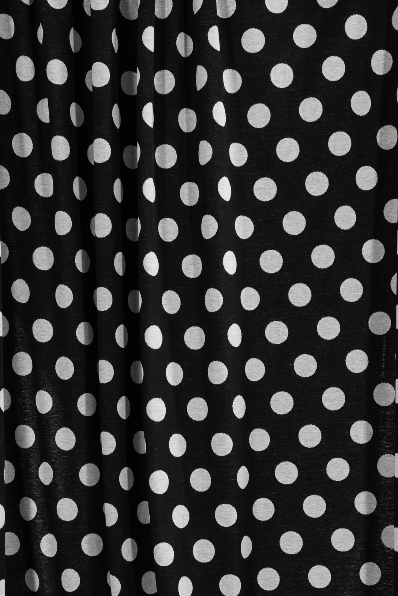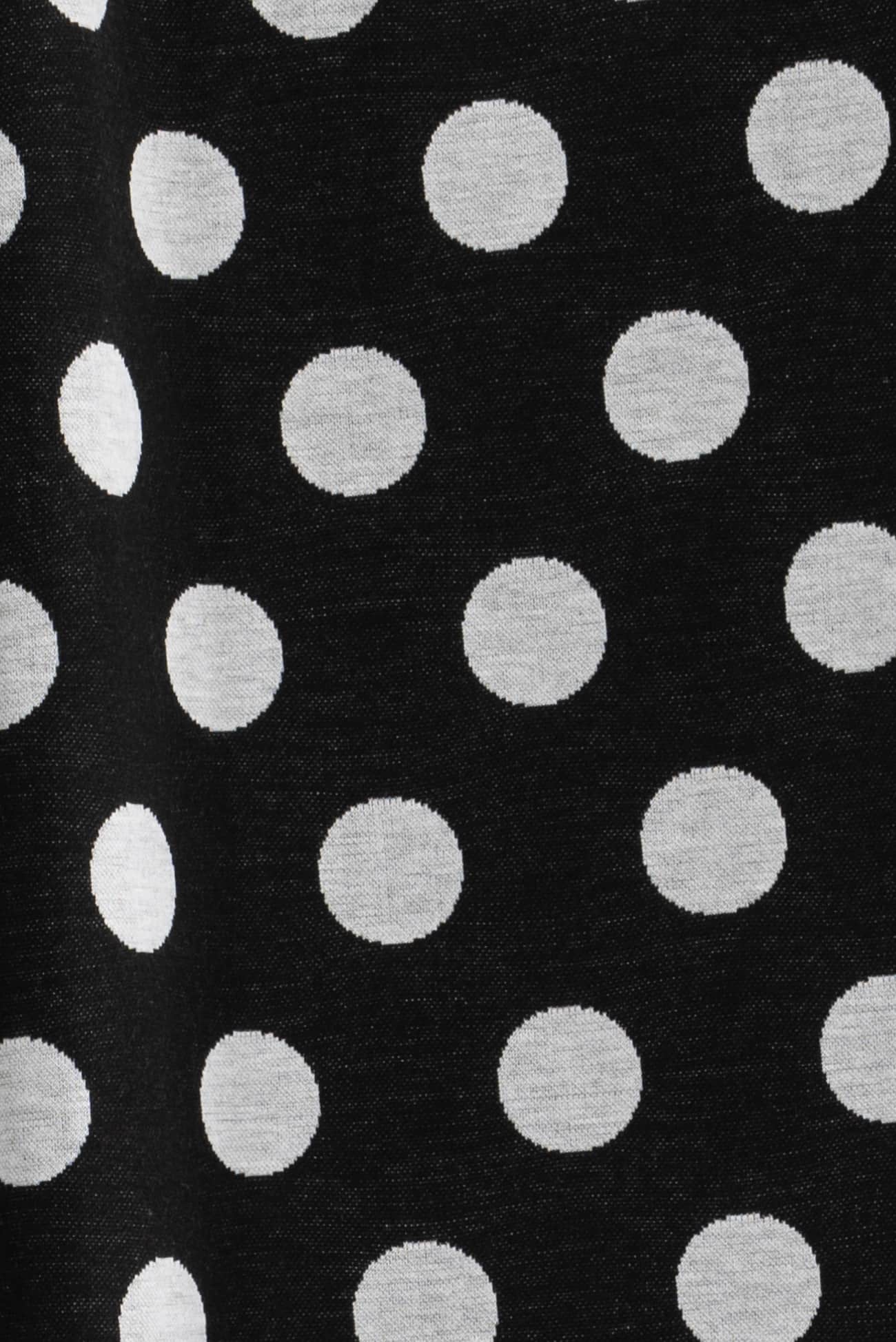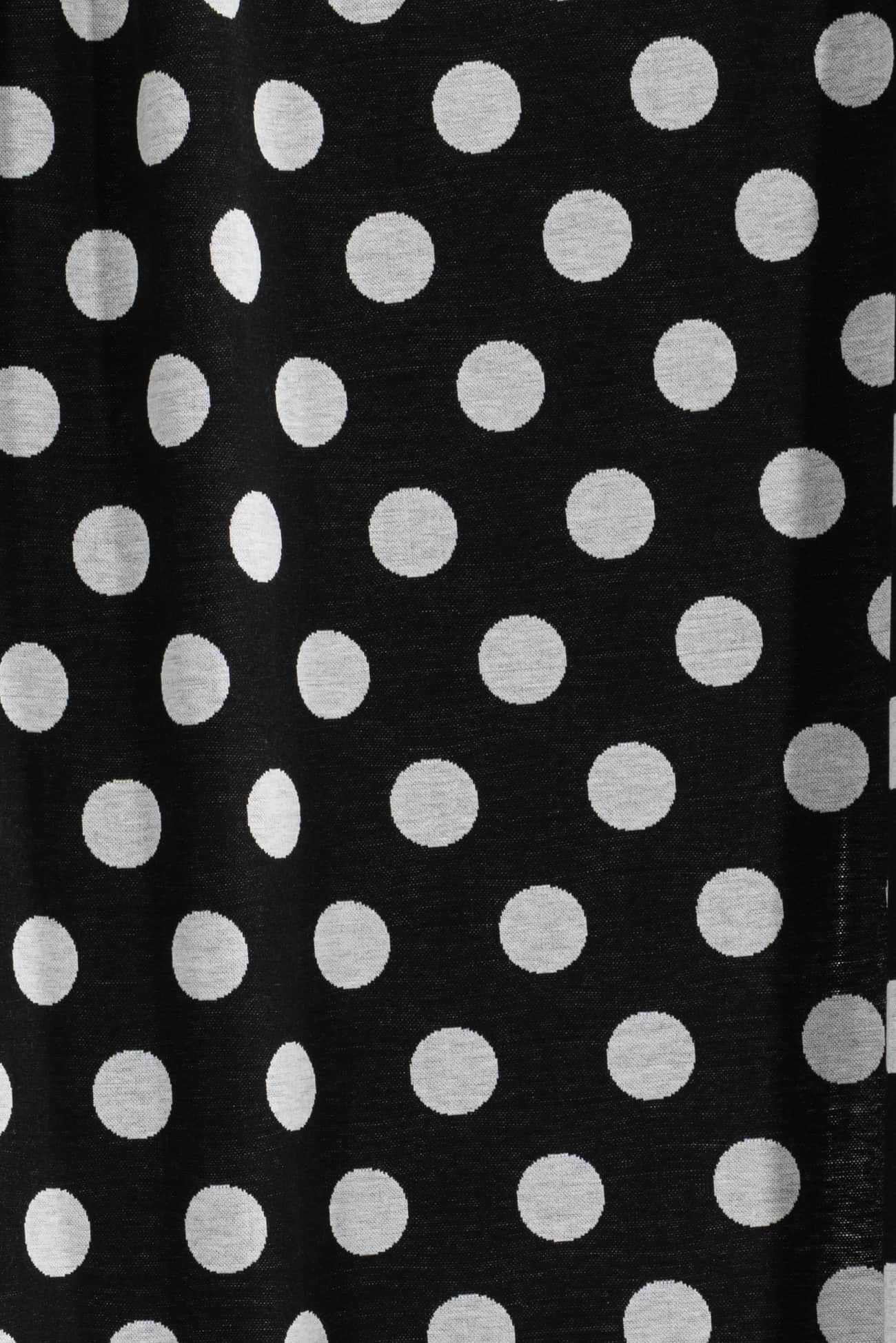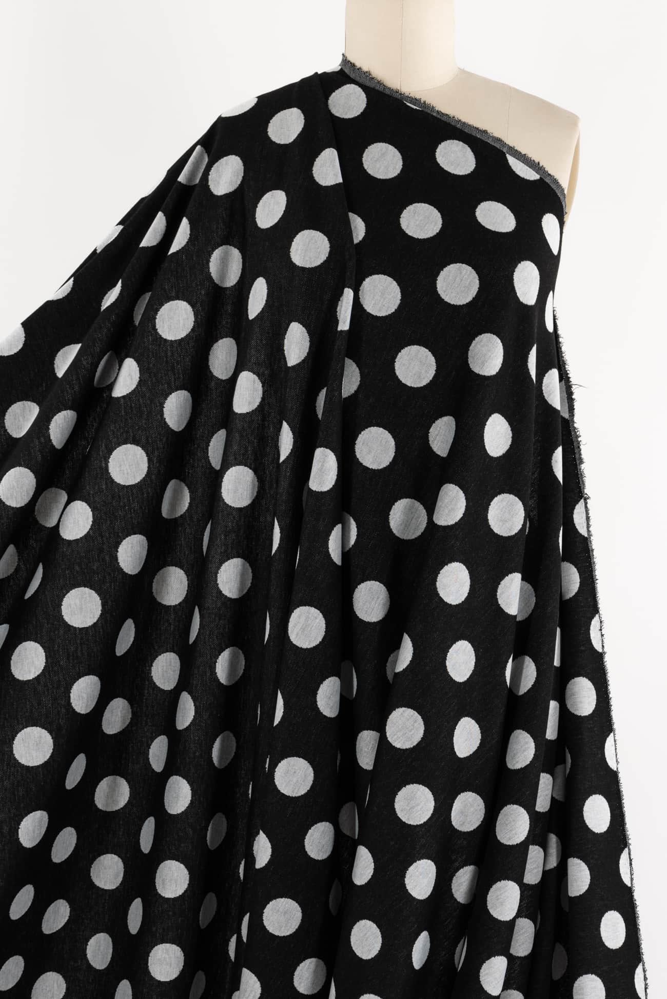 Fun, lovely quality double knit in black with 1 ¼' evenly scattered overall white dots, deadstock, produced in US mills for California designer Katrin Noon. Mid/lightweight, supple soft hand, and drape, stable, 2-way crosswise stretch, no rolling at the cut edge, so cutting and sewing is easy. Right for both tops and bottoms, tunic, t-shirt, dress, sweater, soft pant, jacket, duster coat, jumpsuit, skirt, cardi, kimono.