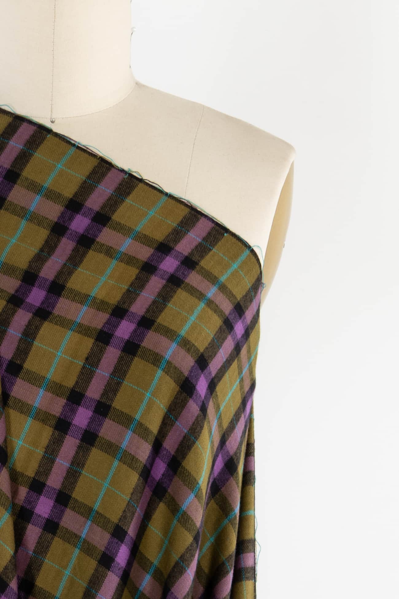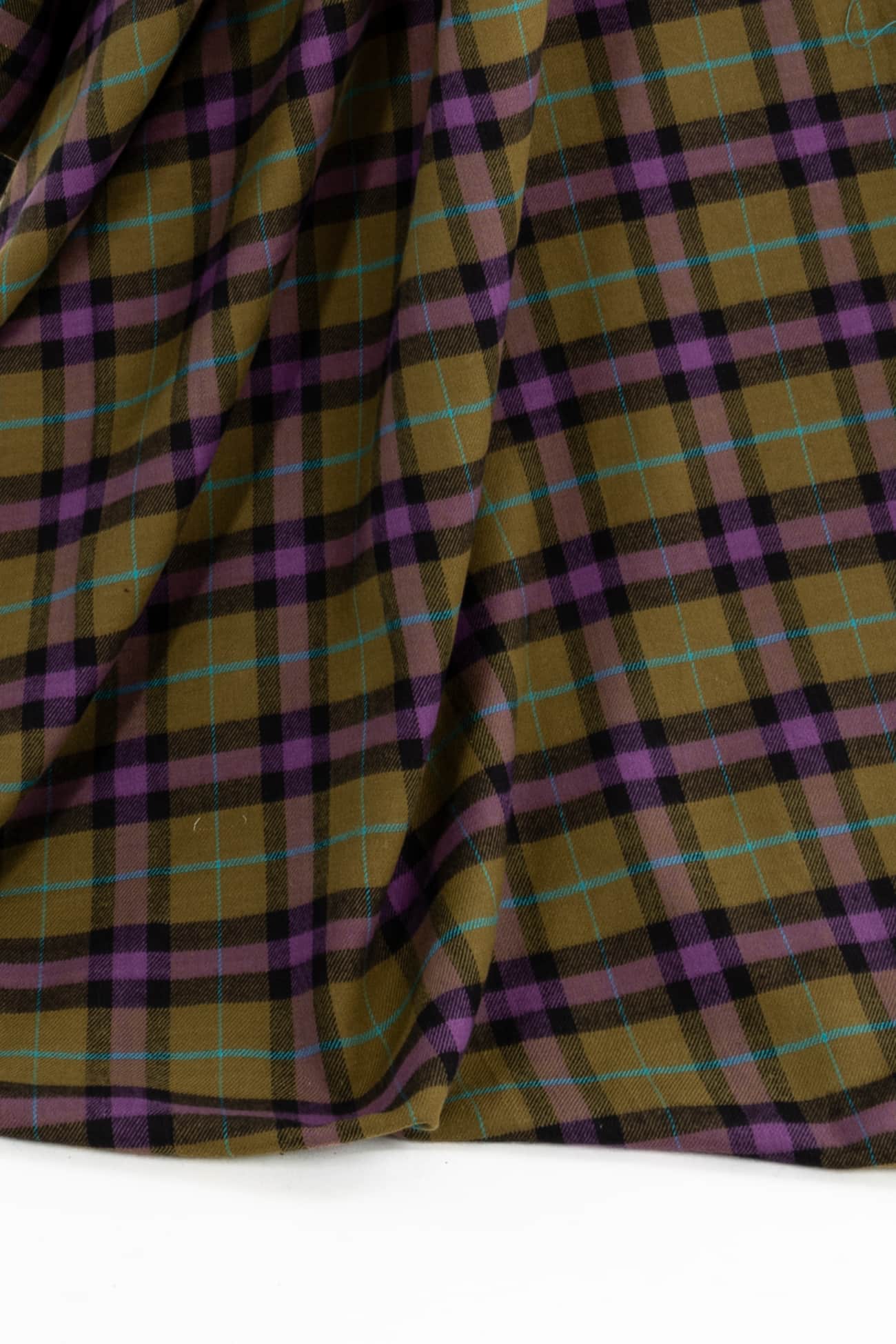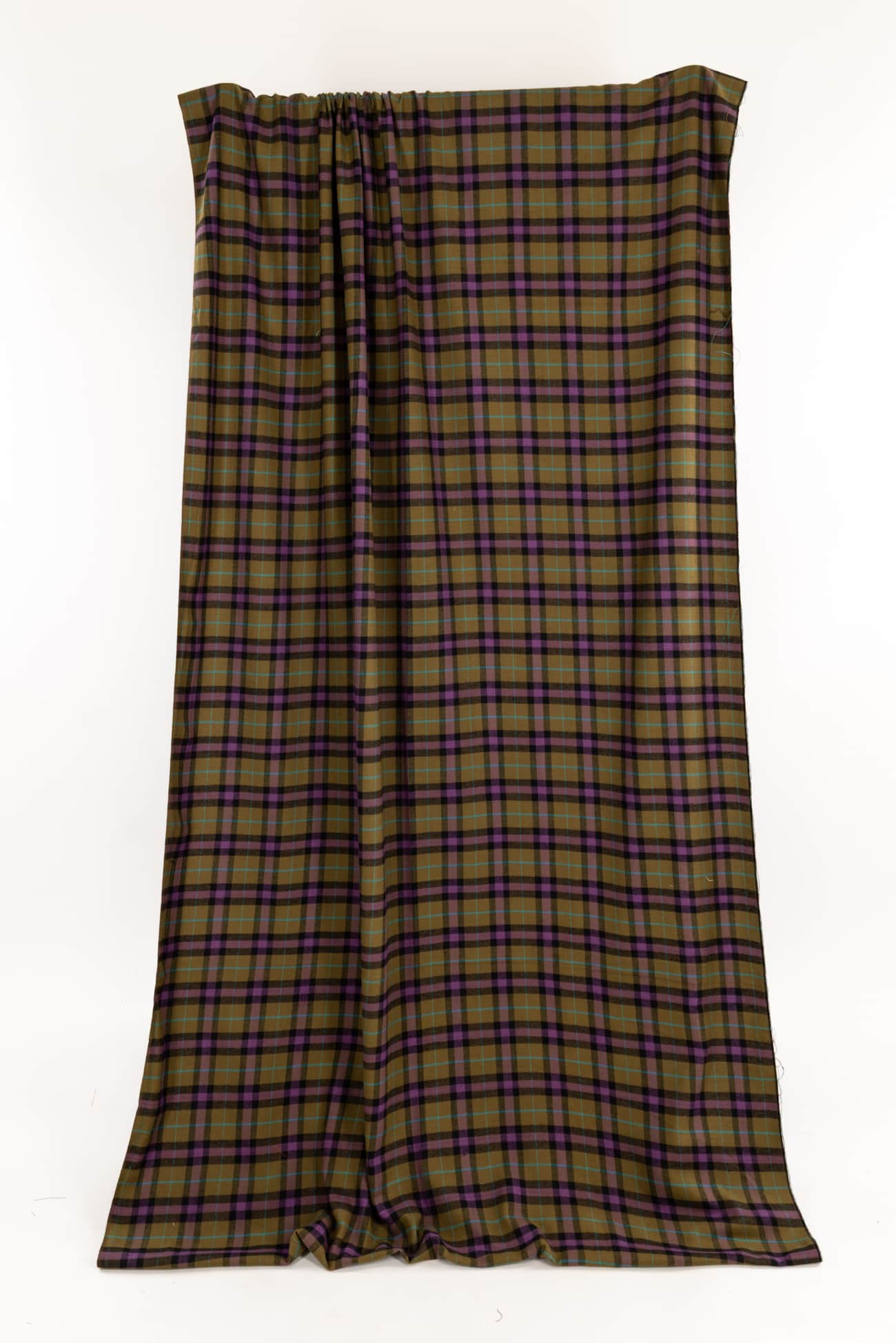 Warm plaid in shades of moss, violet and black in a fine quality cotton flannel from India. Light/shirting weight, yarn-dyed with a super soft hand, a cozy brushed finish on both sides, reversible, with a 3" repeat and a soft malleable drape. Delicious and cozy to wear. Right for a shirt, dress, vest, tunic, men's, children's, workwear, caftan, pj's or robe.