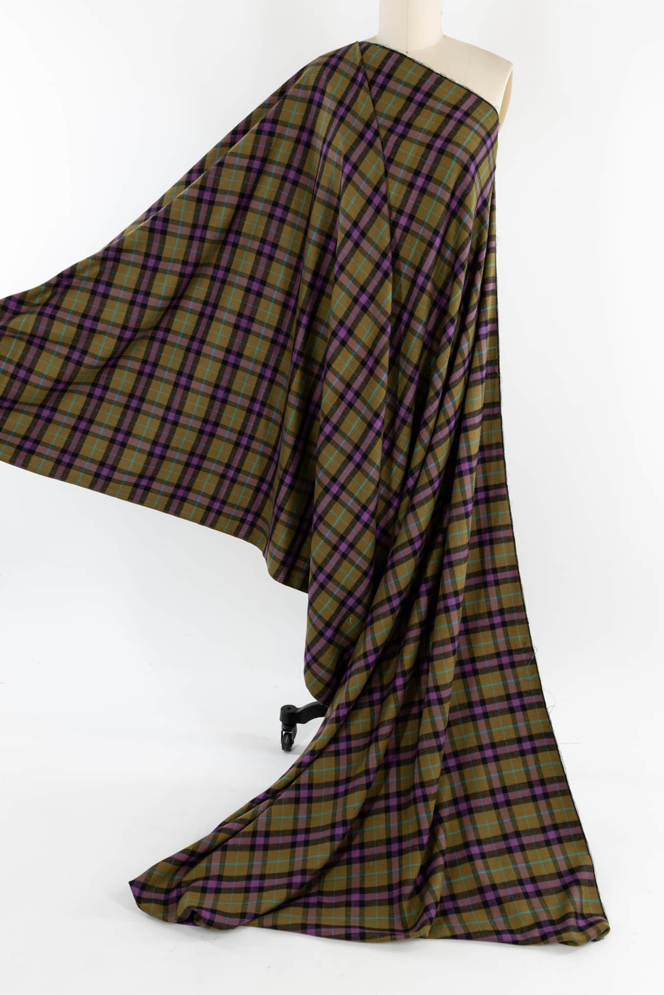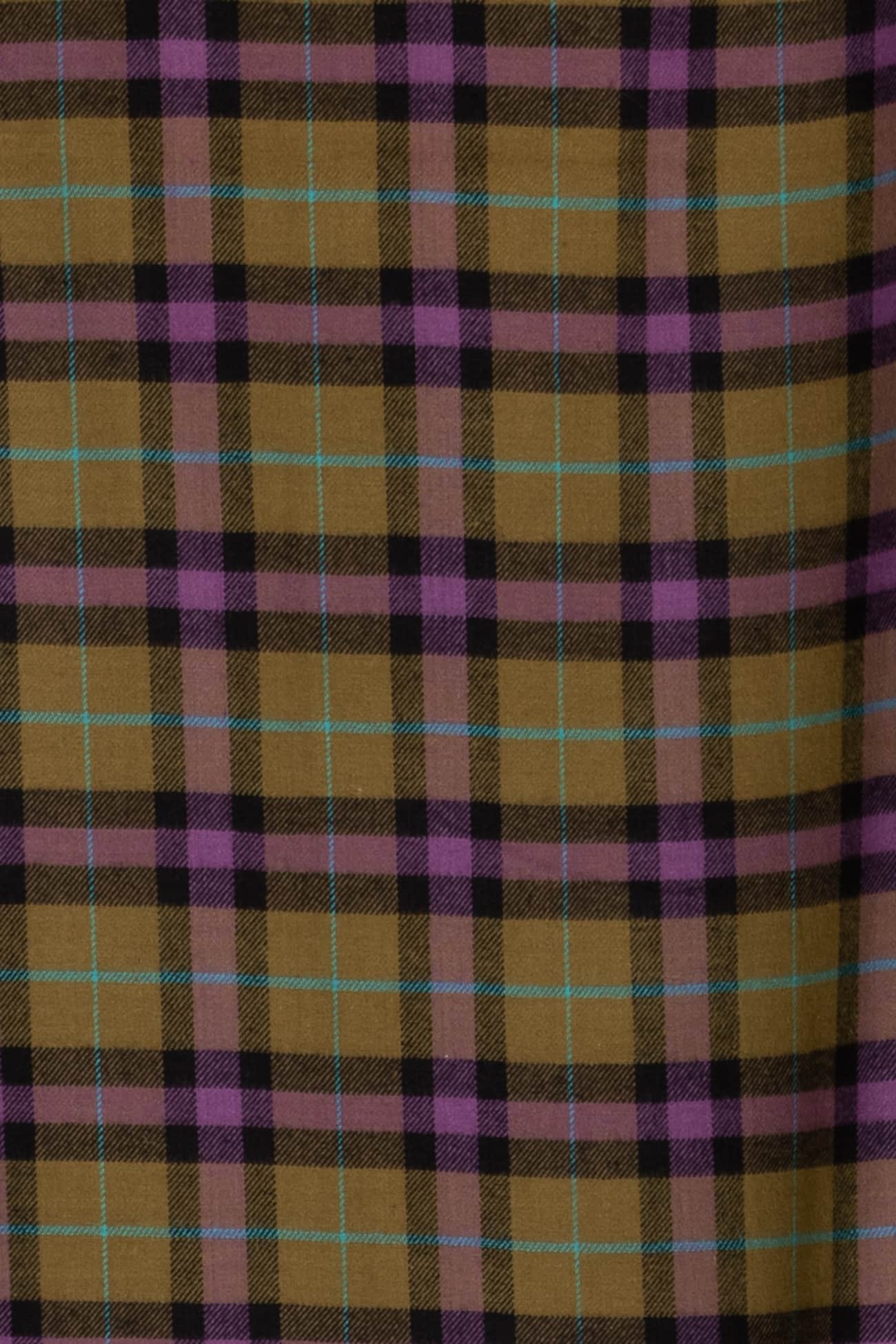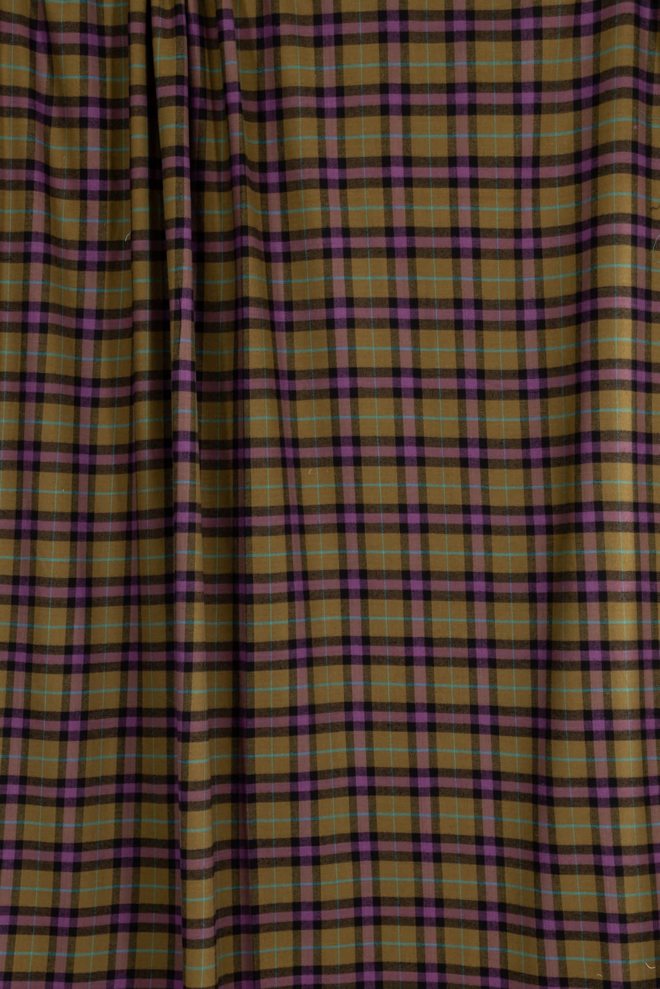 Warm plaid in shades of moss, violet and black in a fine quality cotton flannel from India. Light/shirting weight, yarn-dyed with a super soft hand, a cozy brushed finish on both sides, reversible, with a 3" repeat and a soft malleable drape. Delicious and cozy to wear. Right for a shirt, dress, vest, tunic, men's, children's, workwear, caftan, pj's or robe.