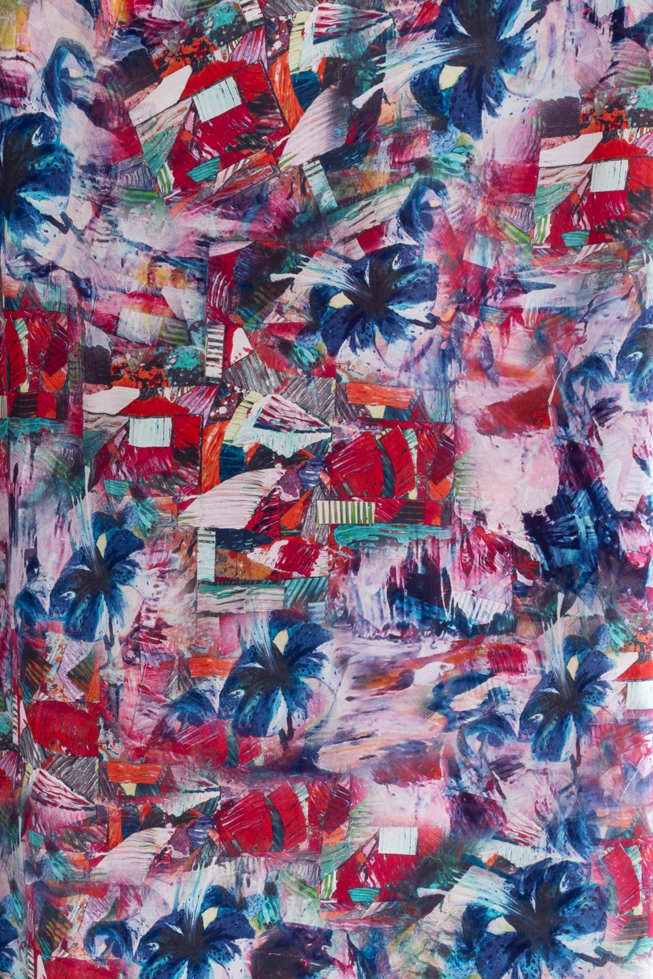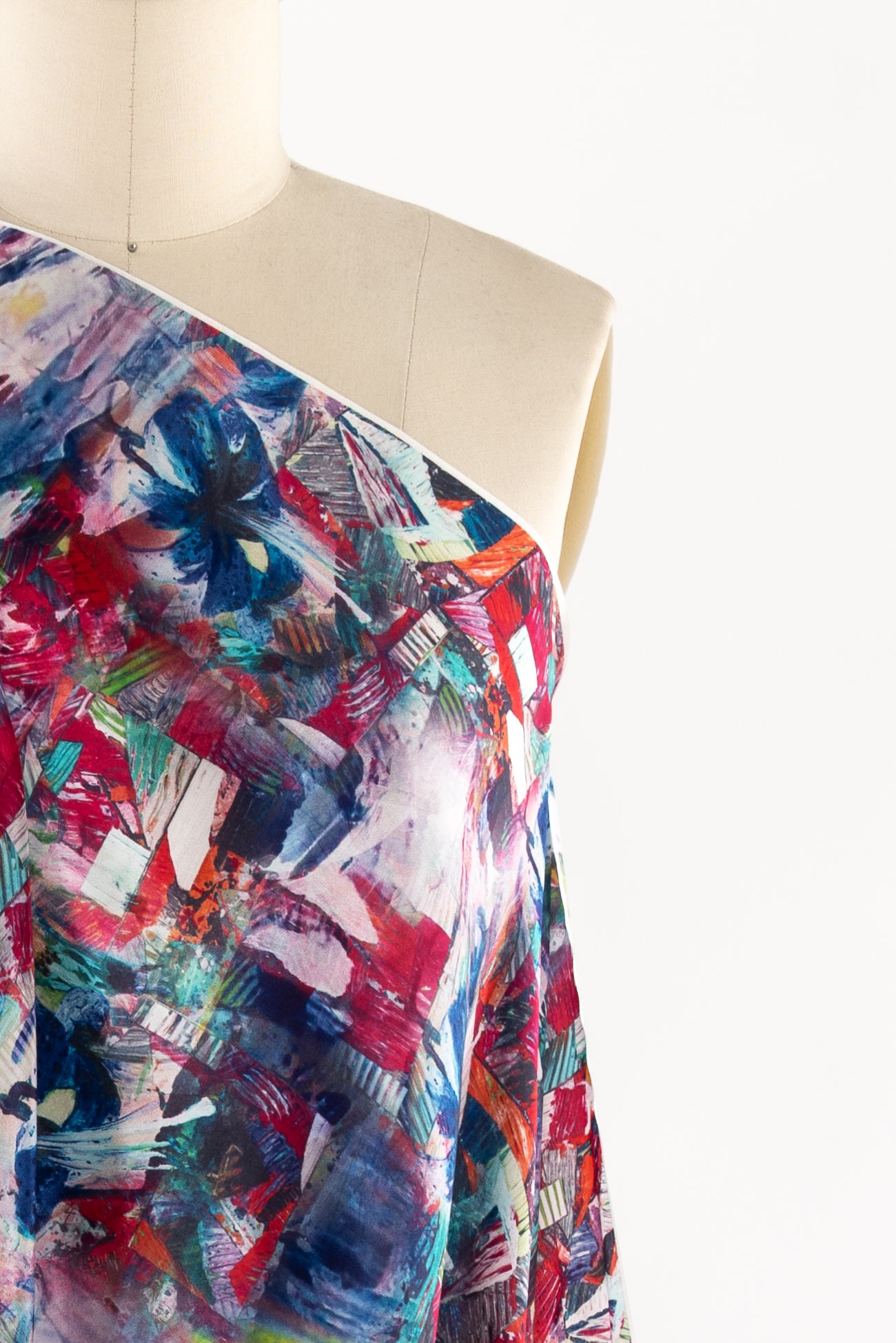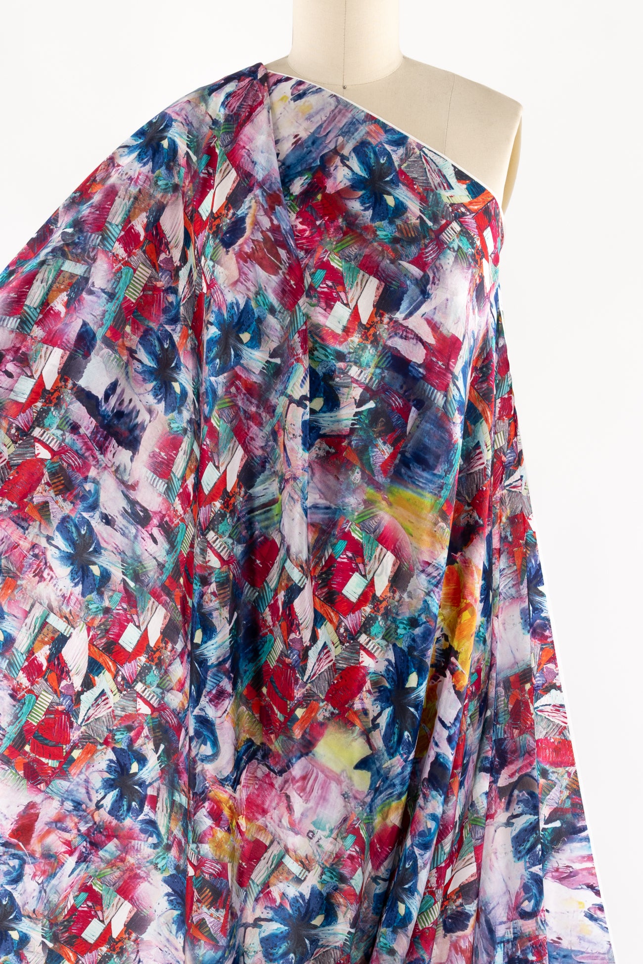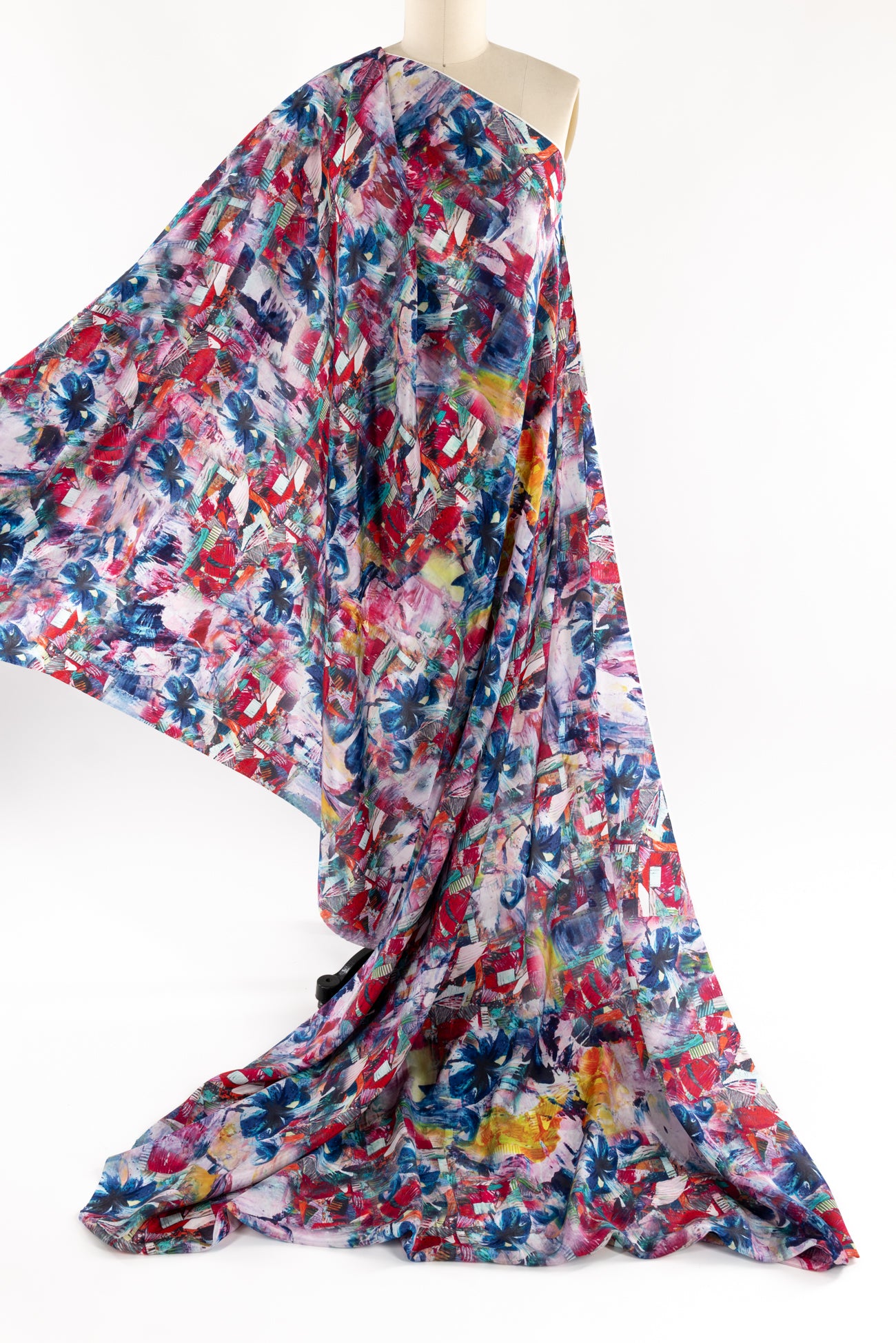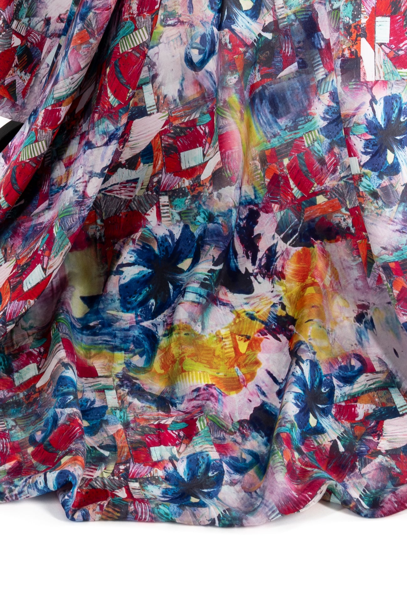 Silk crepe de Chine in a vibrant, painterly, multicolored, digitally printed abstract design, deadstock from a NYC designer. Lightweight, opaque, with a smooth silky hand and fluid airy drape. One way design, 39" repeat. To dress up or down. Right for a dress, shirt, skirt, soft pant, kimono, caftan or loungewear.