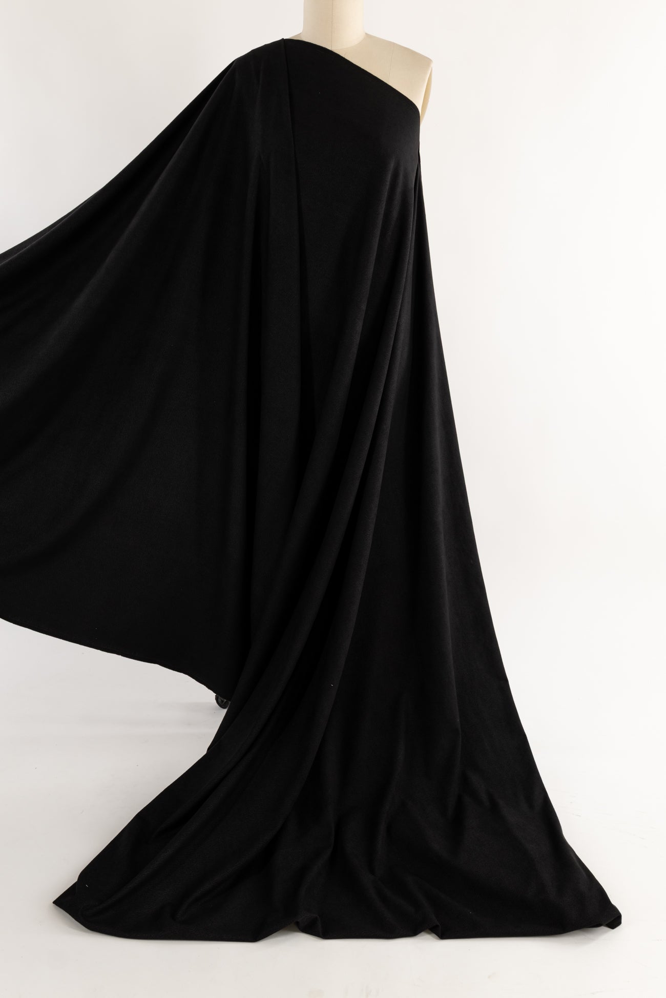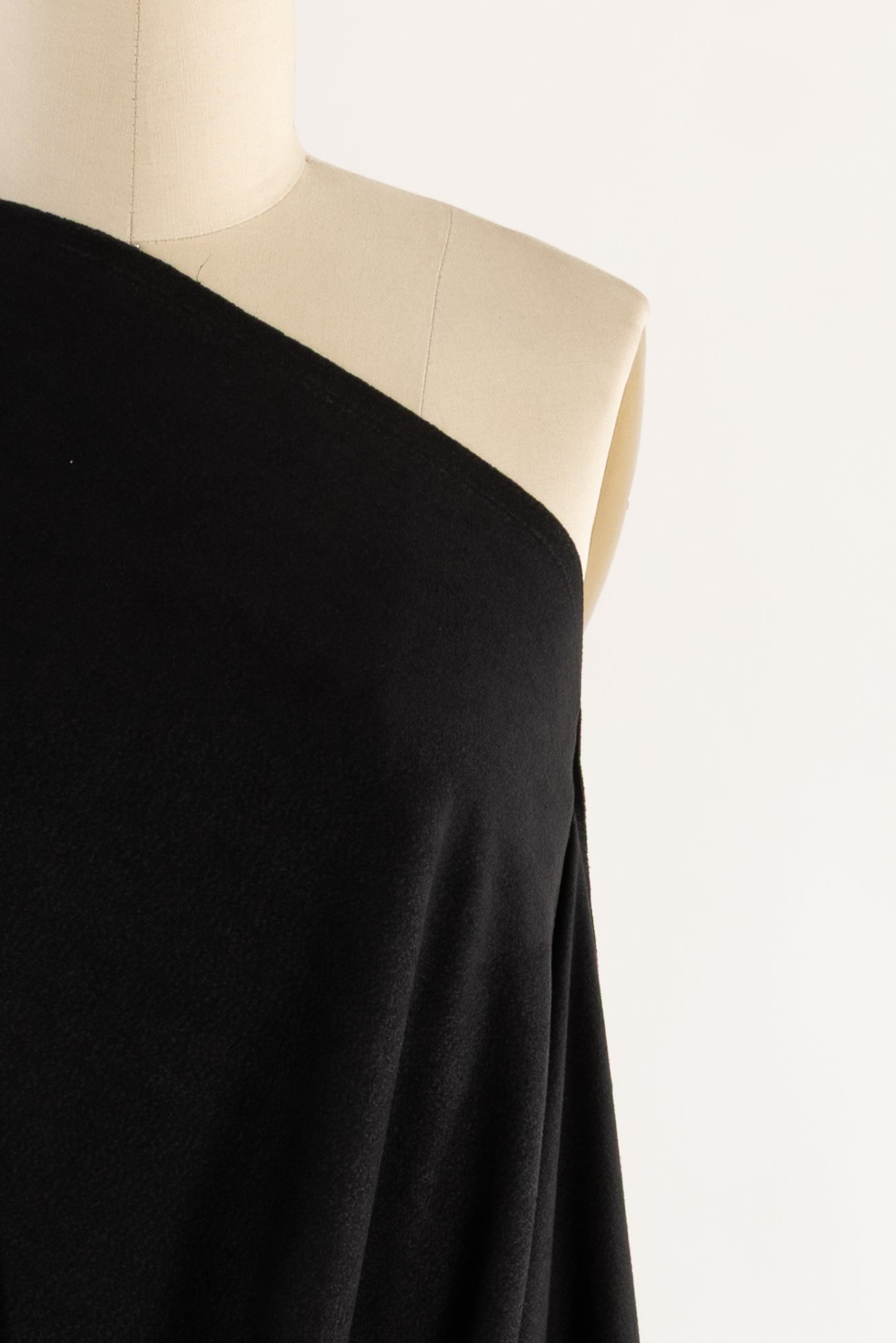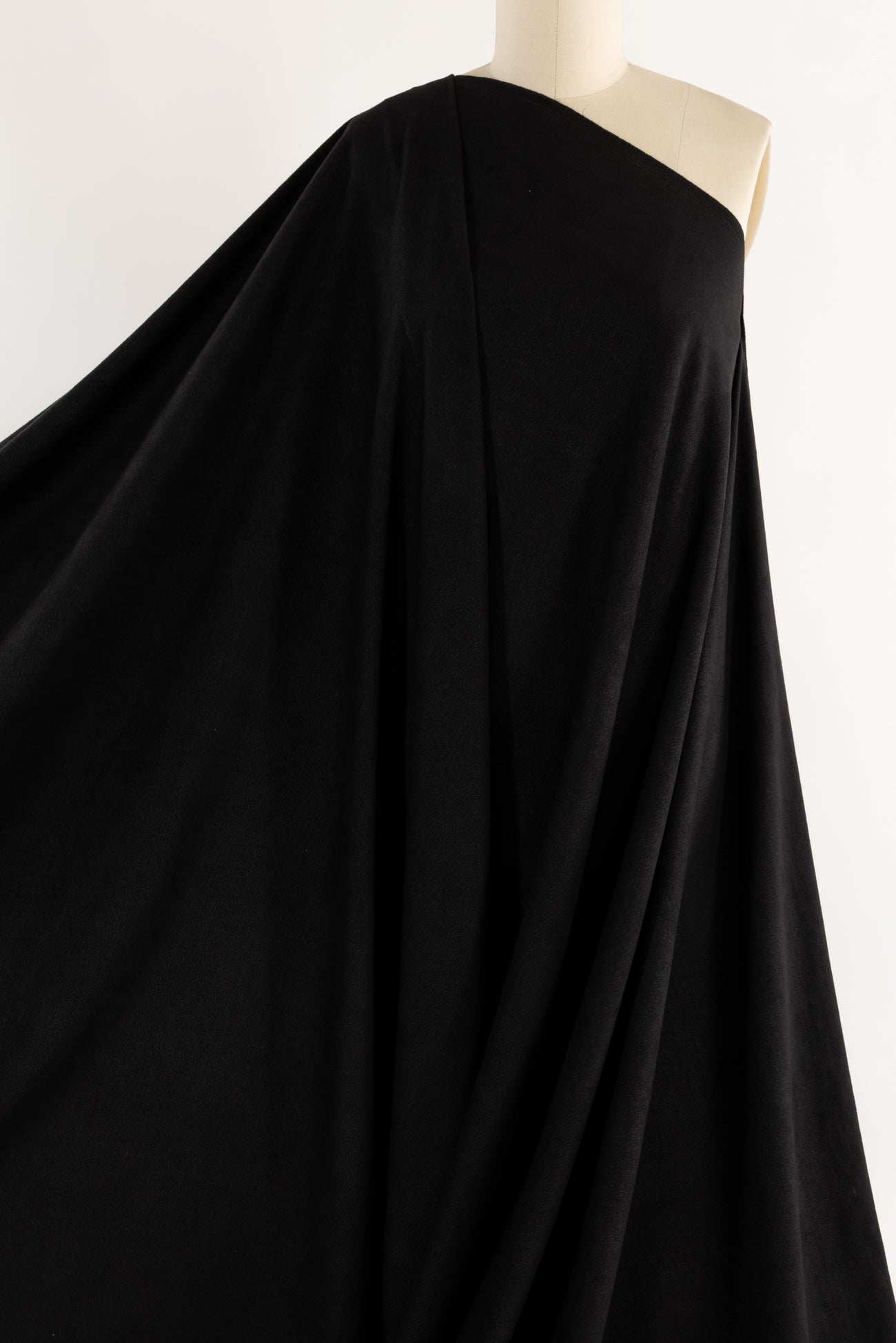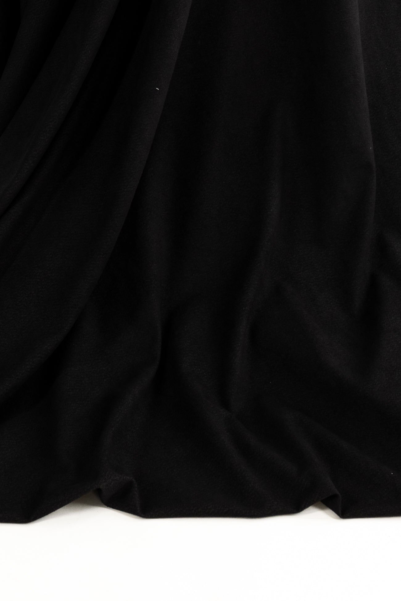 Black fashion/garment weight ultrasuede*, produced in Japan, deadstock from an LA designer - new fabric from vintage stock. Soft and supple, with a velvety hand and light structural drape. Slight crosswise stretch. Right for a tunic, light jacket or duster coat, vest, skirt, shirt, pants. To line or not.