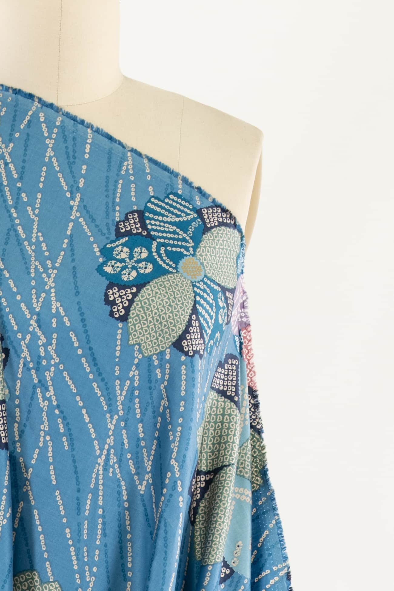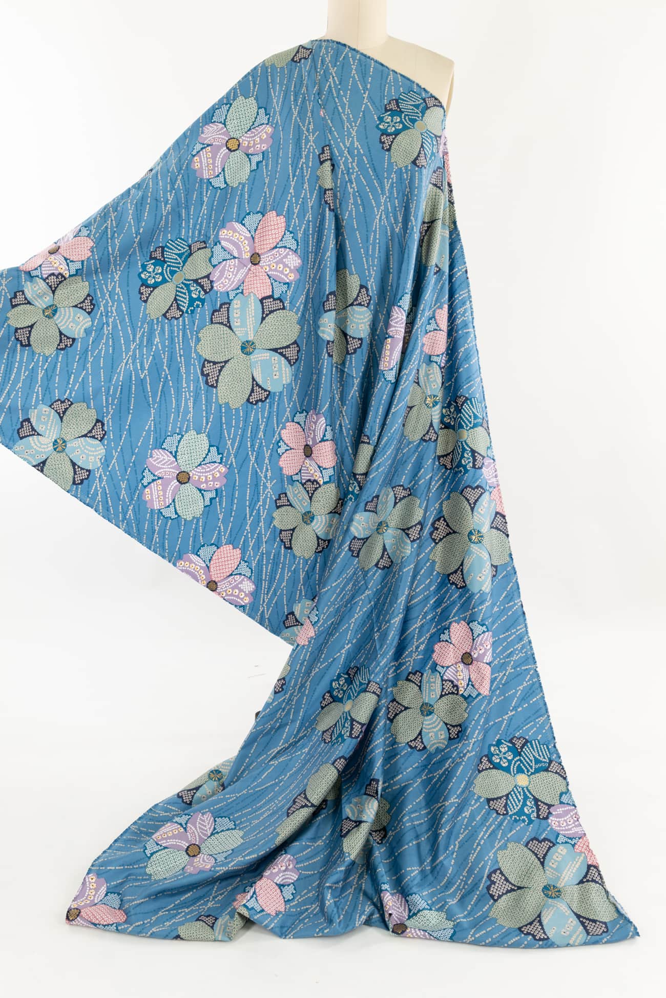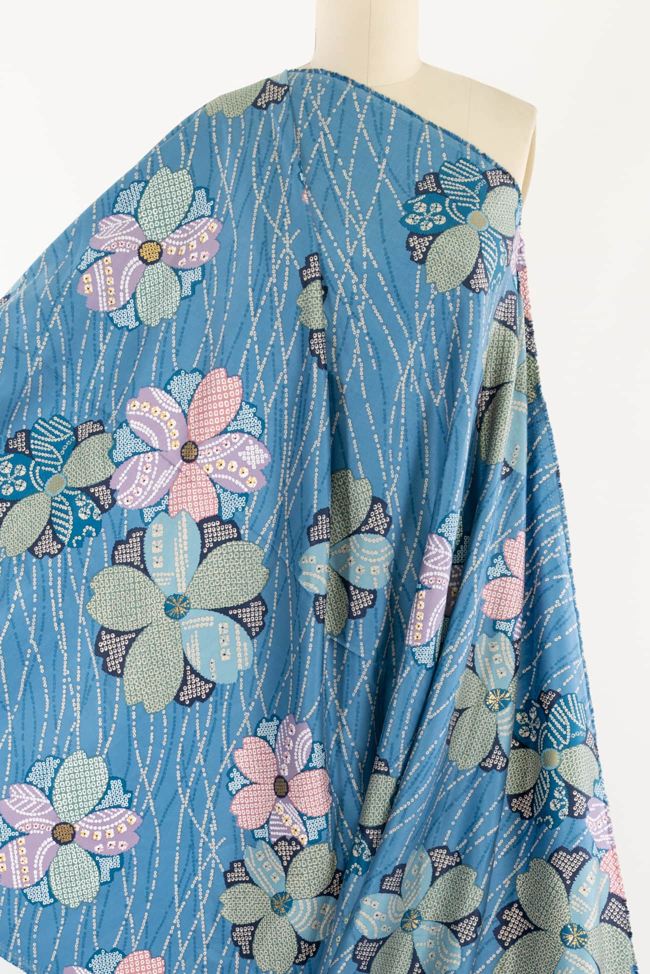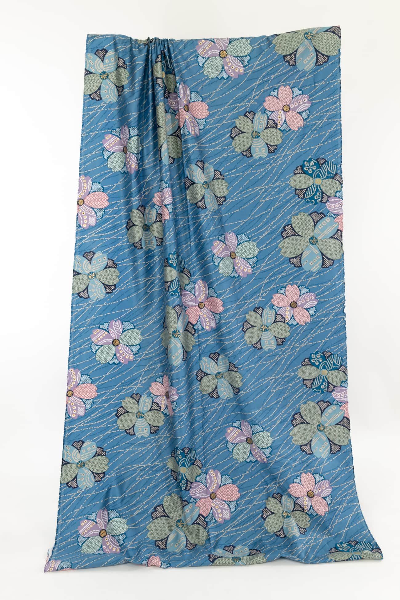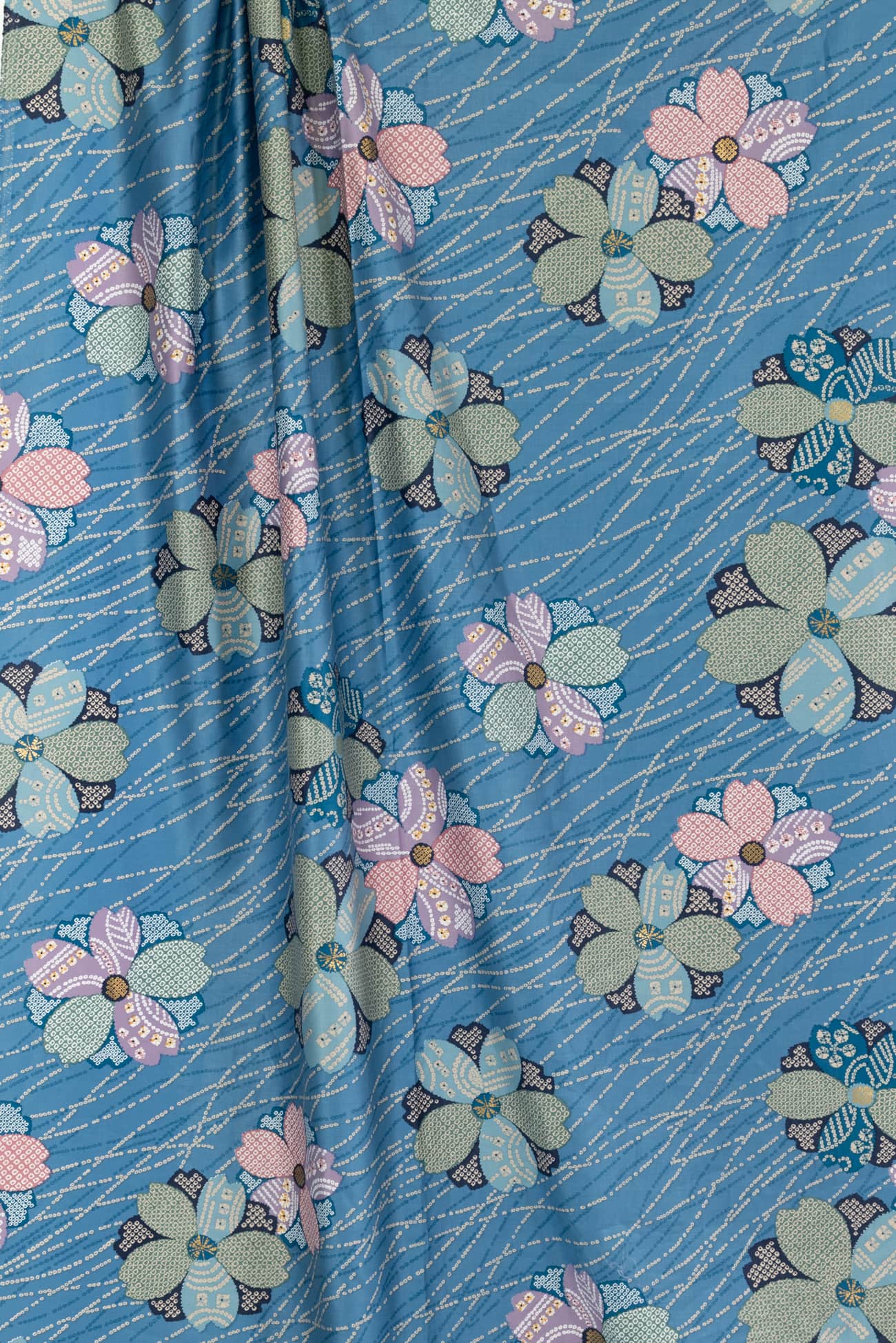 Charming adaptation of a classic floral kimono print in soft blues, deadstock produced for a NYC designer in a Japanese mill on impeccable shirting weight cotton. Lightweight, opaque, fine grained with a smooth hand and soft drape. Right for a dress, shirt, skirt, tunic, kimono, caftan, soft pants, loungewear, children's clothes and for quilting and  home decor projects. One way design, 25" repeat.