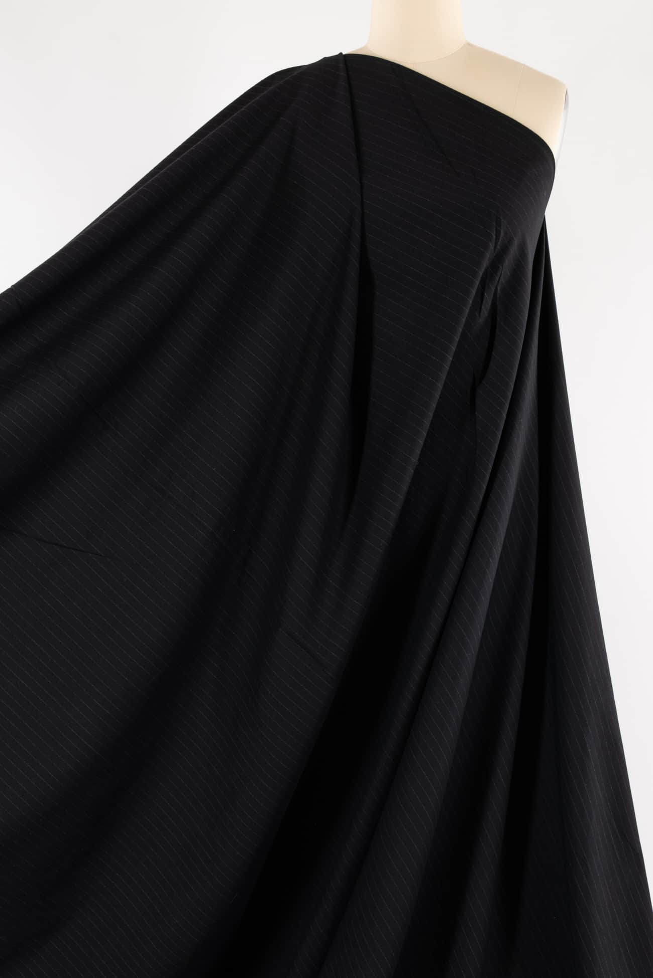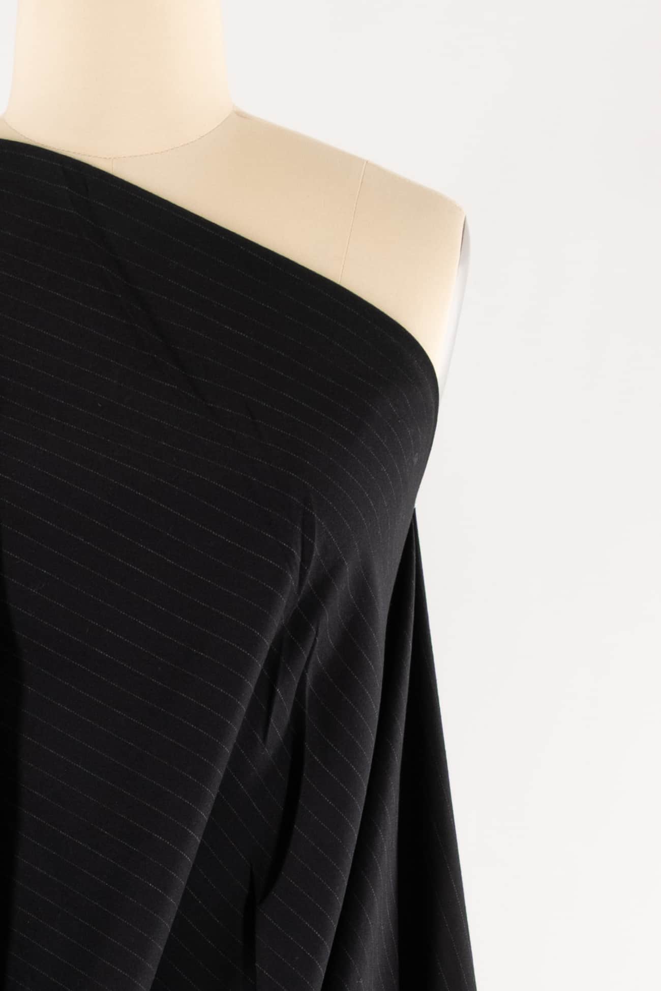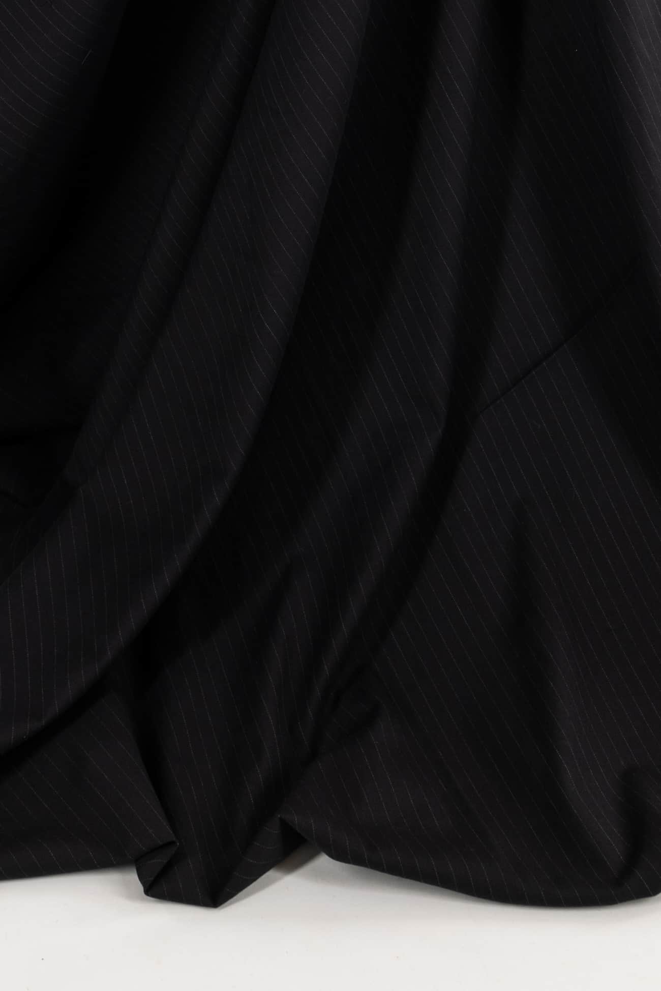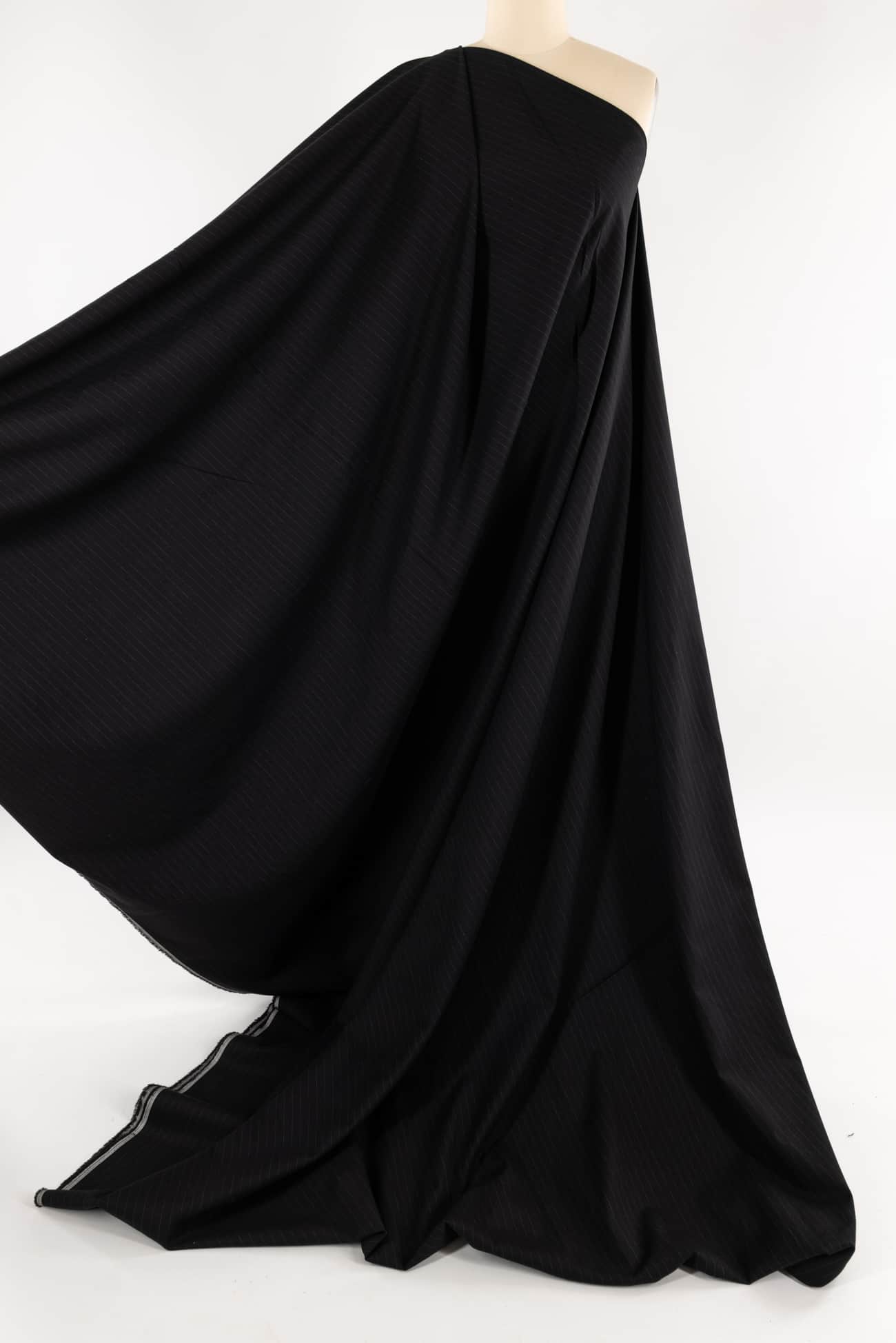 Classic worsted wool in black with a fine line, pale-taupe chalk stripe, deadstock from an LA designer is lightweight with a smooth cool dry hand and supple drape. The weight is right for a dress, blazer, jacket, vest or coat, skirt or pants for men or women. Worsted wool is made from long staple wool fibers that are combed and twisted to make a smooth, fine grained sleek feel, typically used in men's suiting.