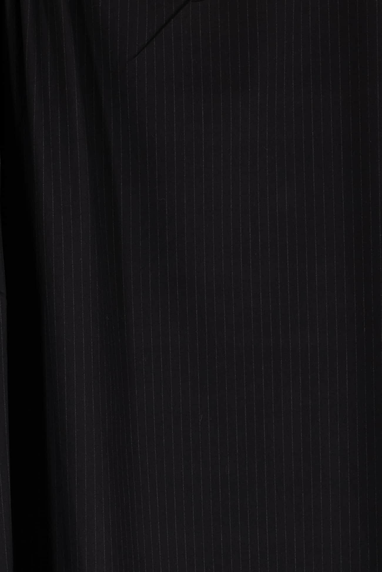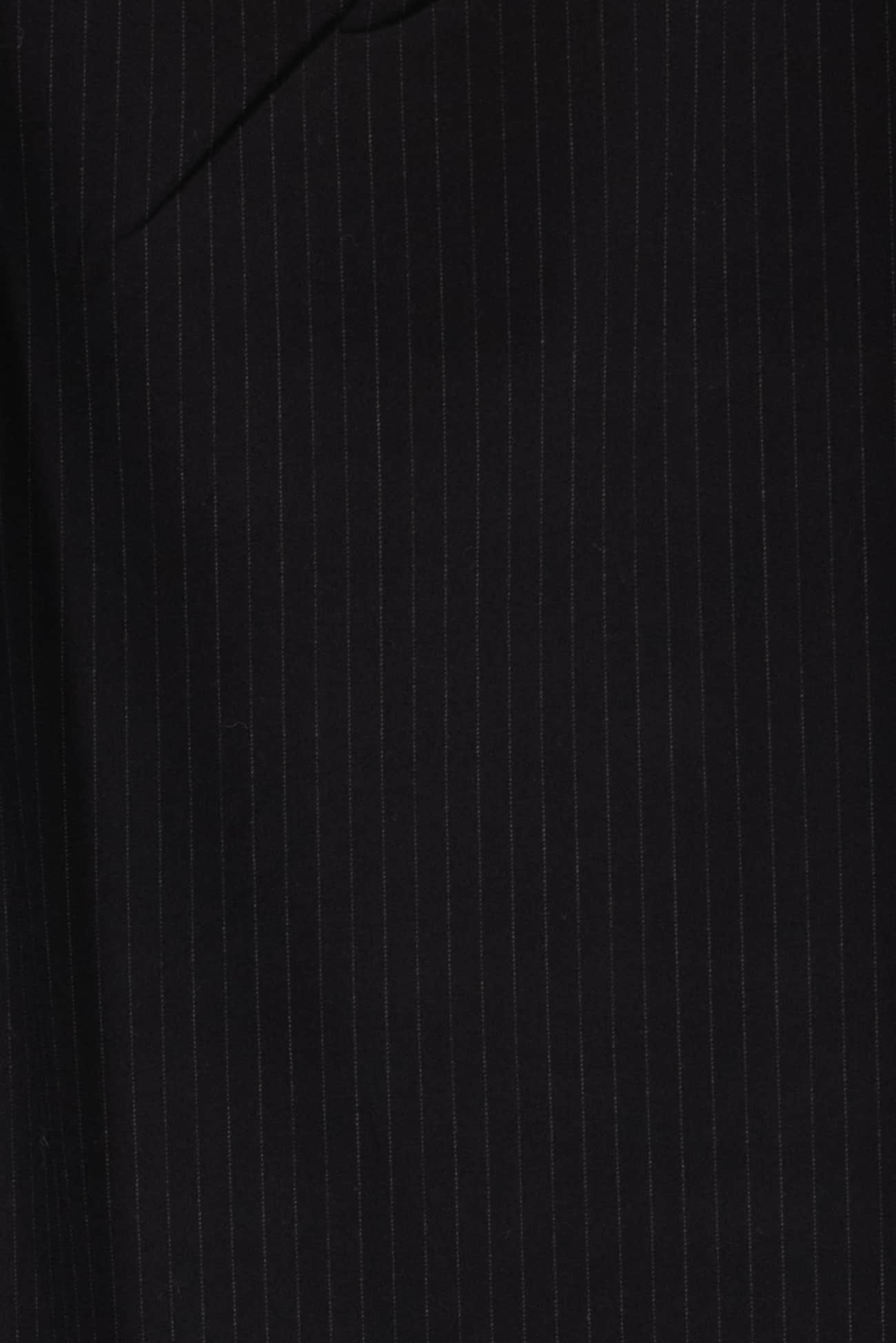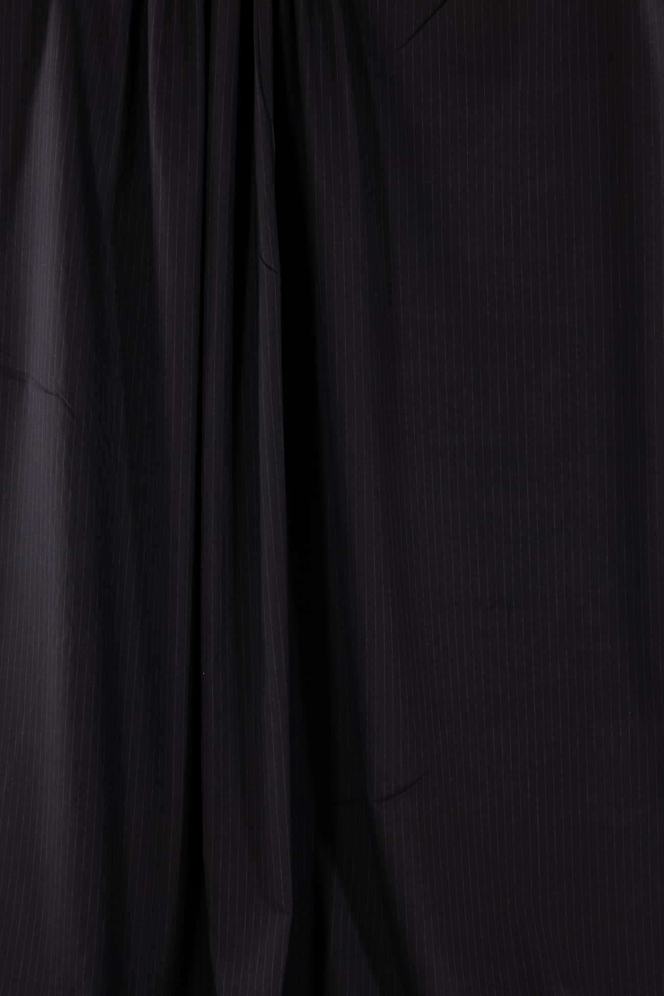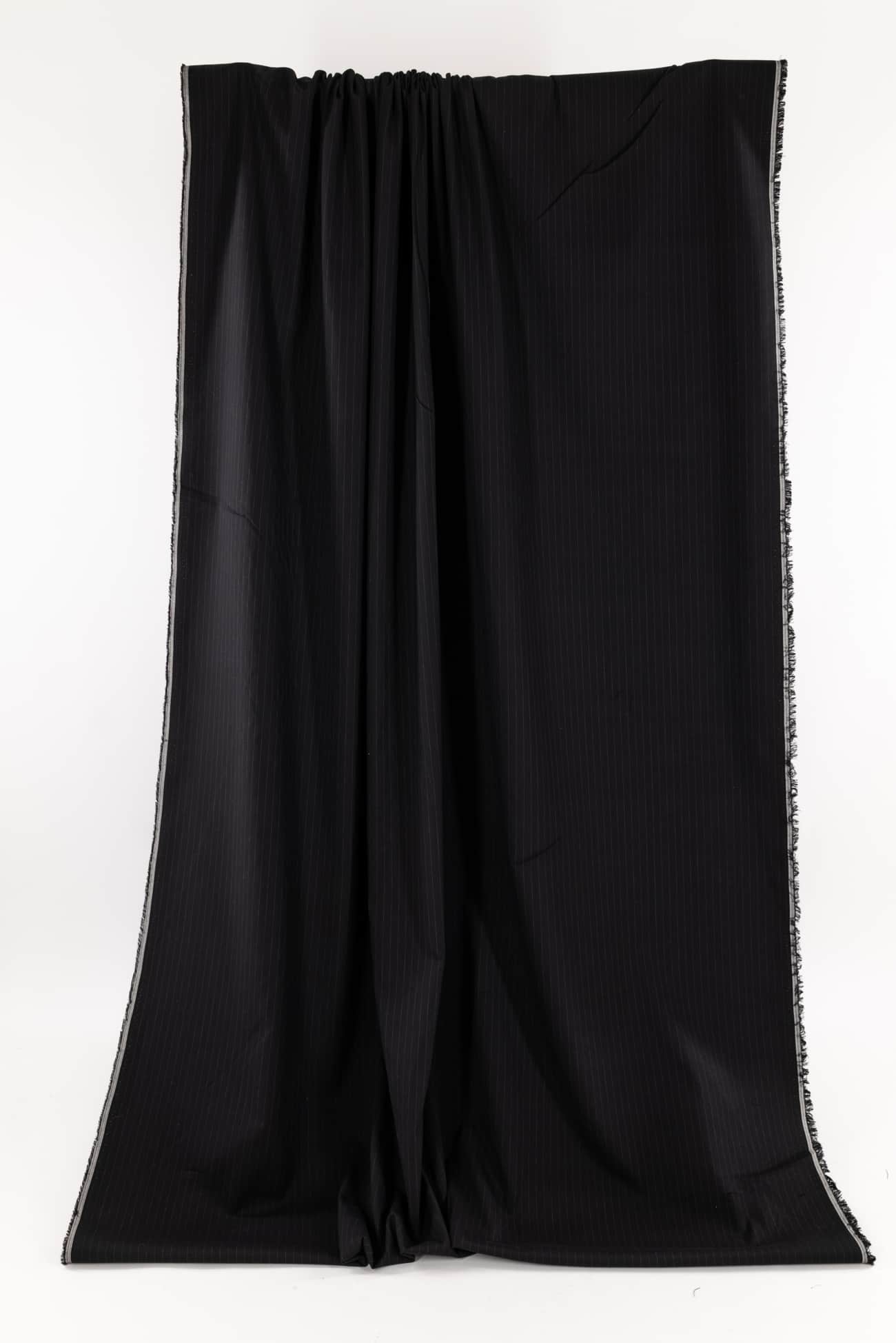 Classic worsted wool in black with a fine line, pale-taupe chalk stripe, deadstock from an LA designer is lightweight with a smooth cool dry hand and supple drape. The weight is right for a dress, blazer, jacket, vest or coat, skirt or pants for men or women. Worsted wool is made from long staple wool fibers that are combed and twisted to make a smooth, fine grained sleek feel, typically used in men's suiting.