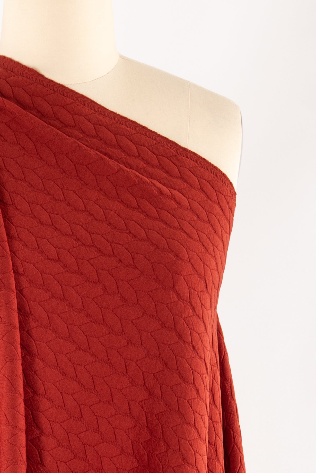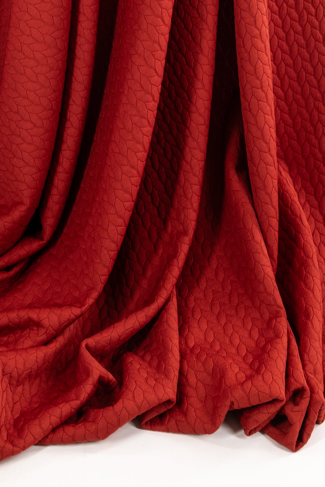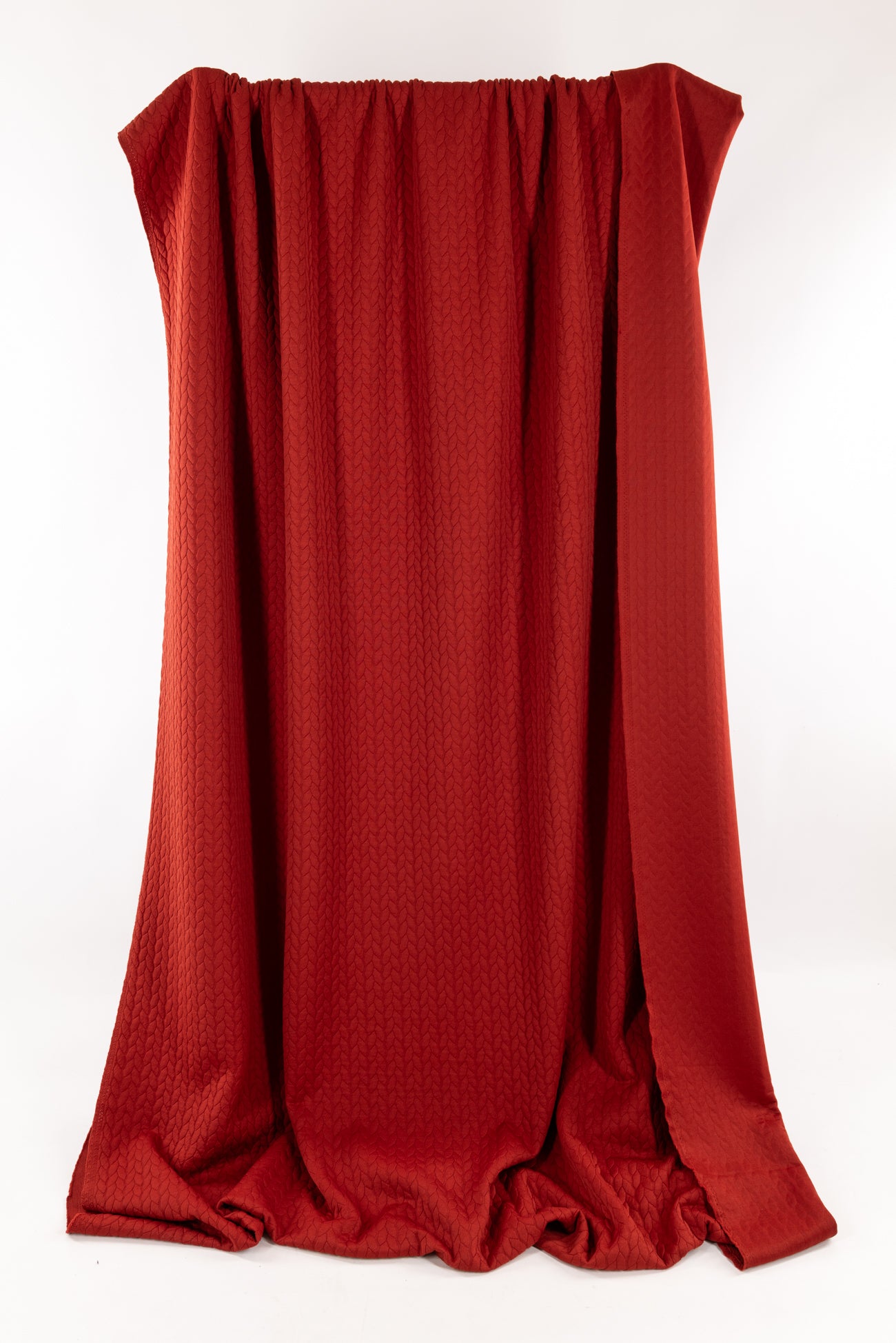 Soft and cozy quilted/padded knit in rich, color-saturated rust has a classic cable-shaped, mechanically stitched quilted effect design. Mid-weight with a touch of loft, but not heavy - this is a weight that will work indoors and out. Uber soft knit front, reversing to a smooth knit back with a shadow of the front design. Has slight crosswise stretch, no rolling at the cut edge. The inner padding is the same color as the fabric; seams will require some finishing to prevent the padding from escaping. Right for a jacket, vest, coat, sweater, hoodie.