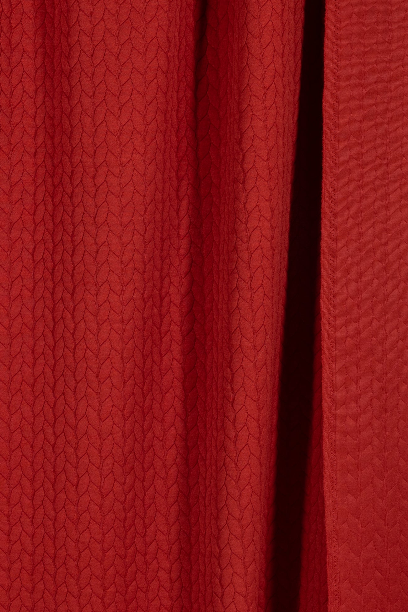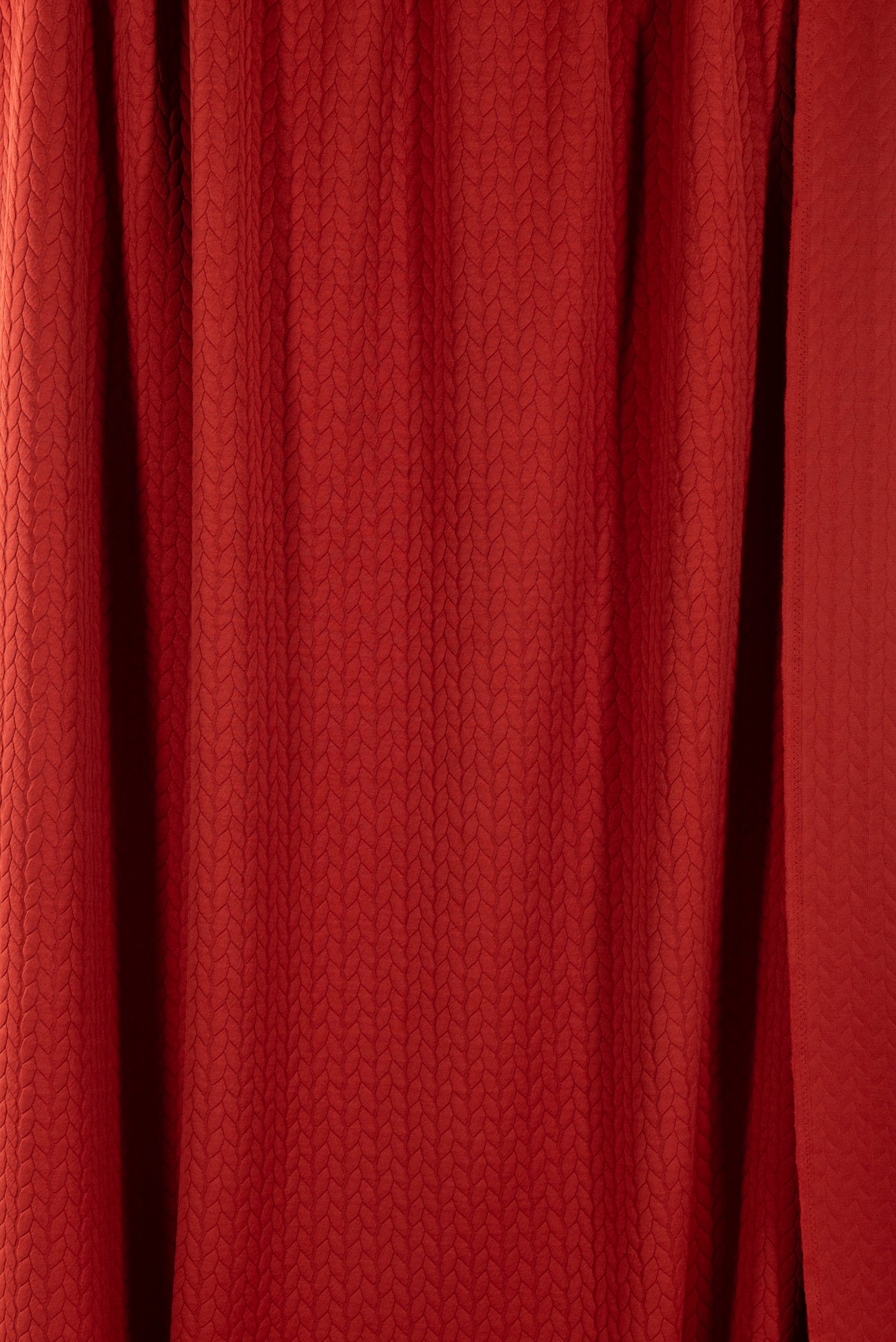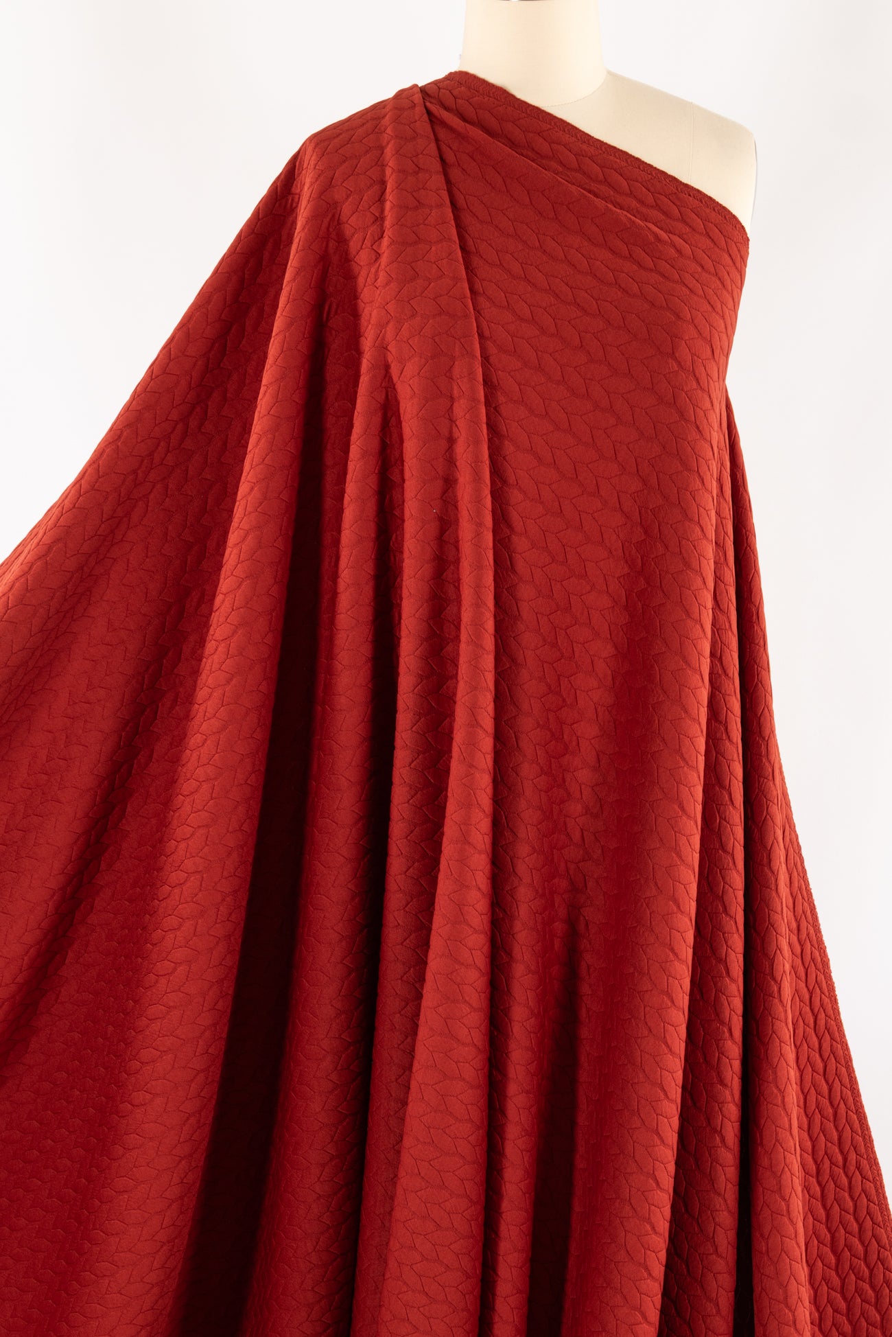 Soft and cozy quilted/padded knit in rich, color-saturated rust has a classic cable-shaped, mechanically stitched quilted effect design. Mid-weight with a touch of loft, but not heavy - this is a weight that will work indoors and out. Uber soft knit front, reversing to a smooth knit back with a shadow of the front design. Has slight crosswise stretch, no rolling at the cut edge. The inner padding is the same color as the fabric; seams will require some finishing to prevent the padding from escaping. Right for a jacket, vest, coat, sweater, hoodie.