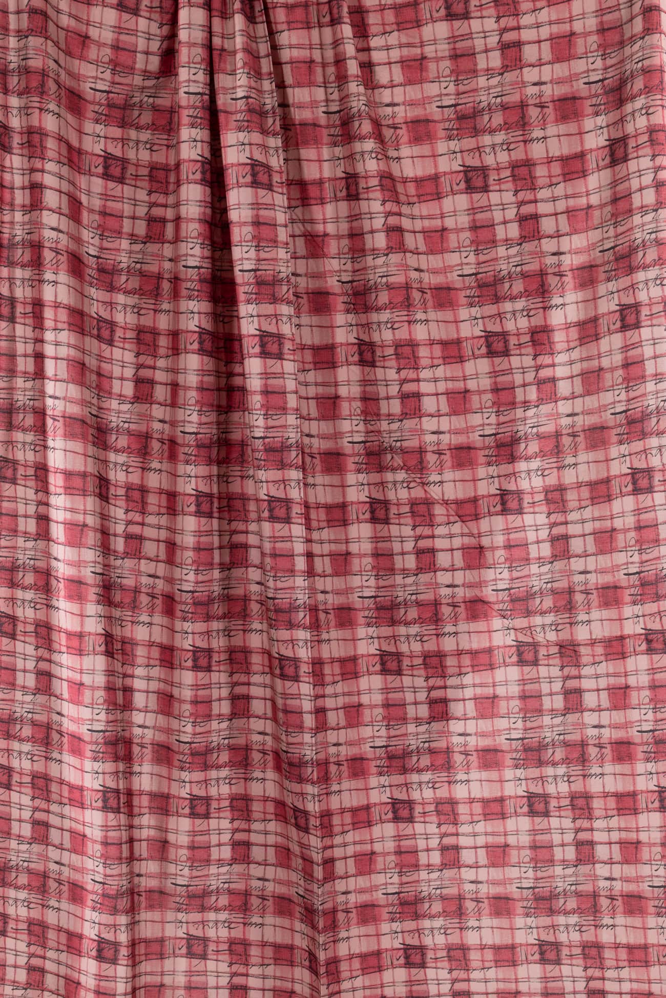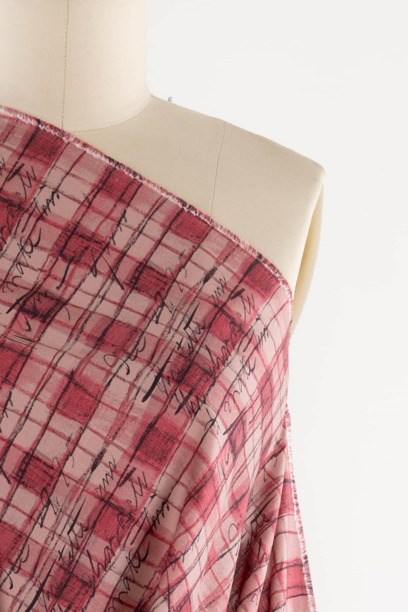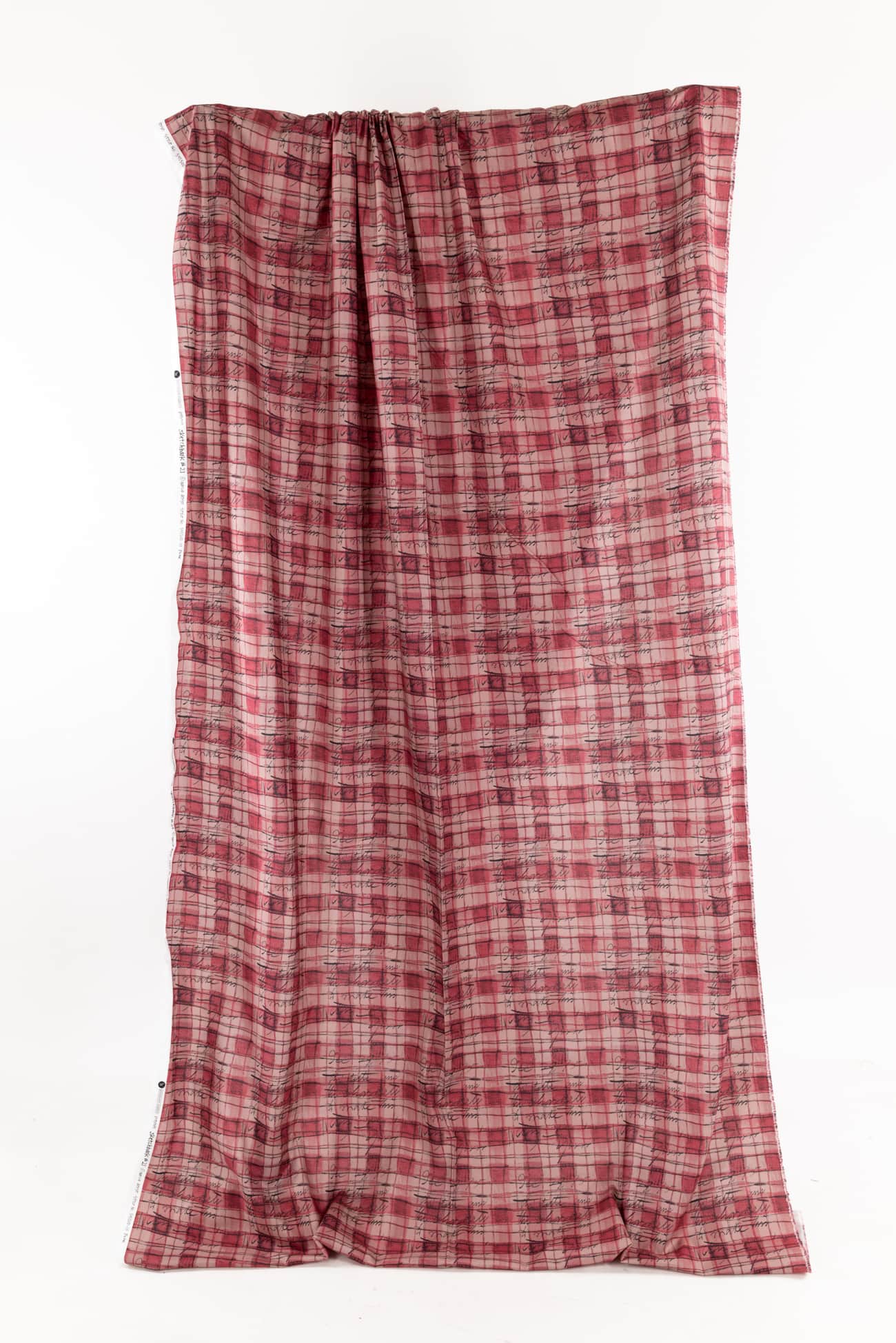 An artful watercolor geometric with cheery checks in shades of raspberry on pinky/gray with black text accents. Lightweight, opaque, with a smooth cool hand, a 6¾" repeat, and soft drape. Right for a dress, skirt, shirt, tunic, caftan, kimono, soft pant, men's, or children's wear.