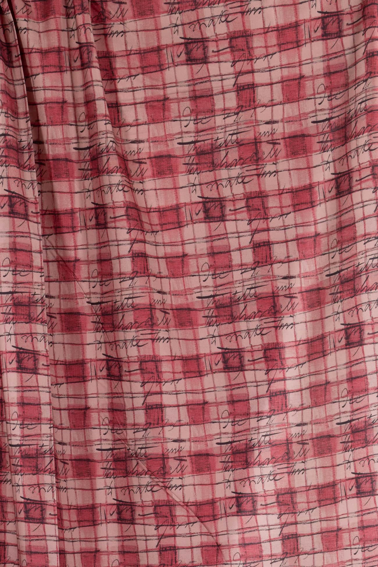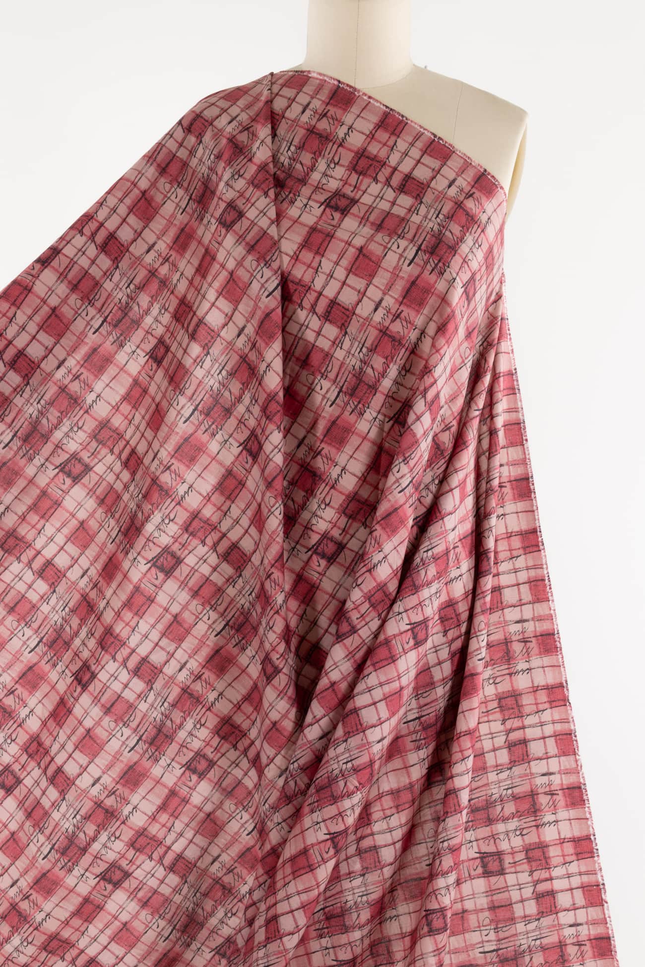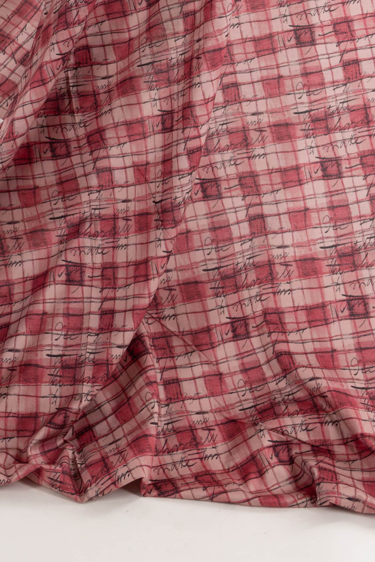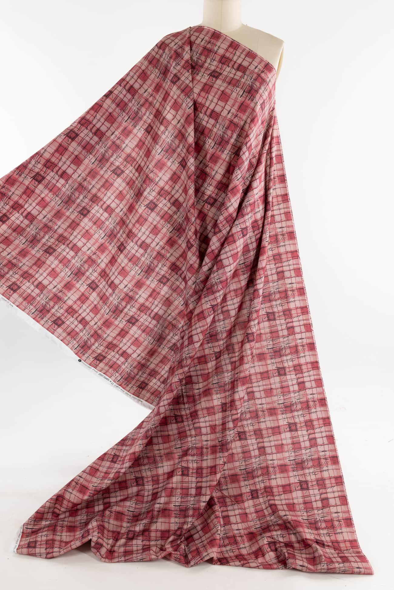 An artful watercolor geometric with cheery checks in shades of raspberry on pinky/gray with black text accents. Lightweight, opaque, with a smooth cool hand, a 6¾" repeat, and soft drape. Right for a dress, skirt, shirt, tunic, caftan, kimono, soft pant, men's, or children's wear.