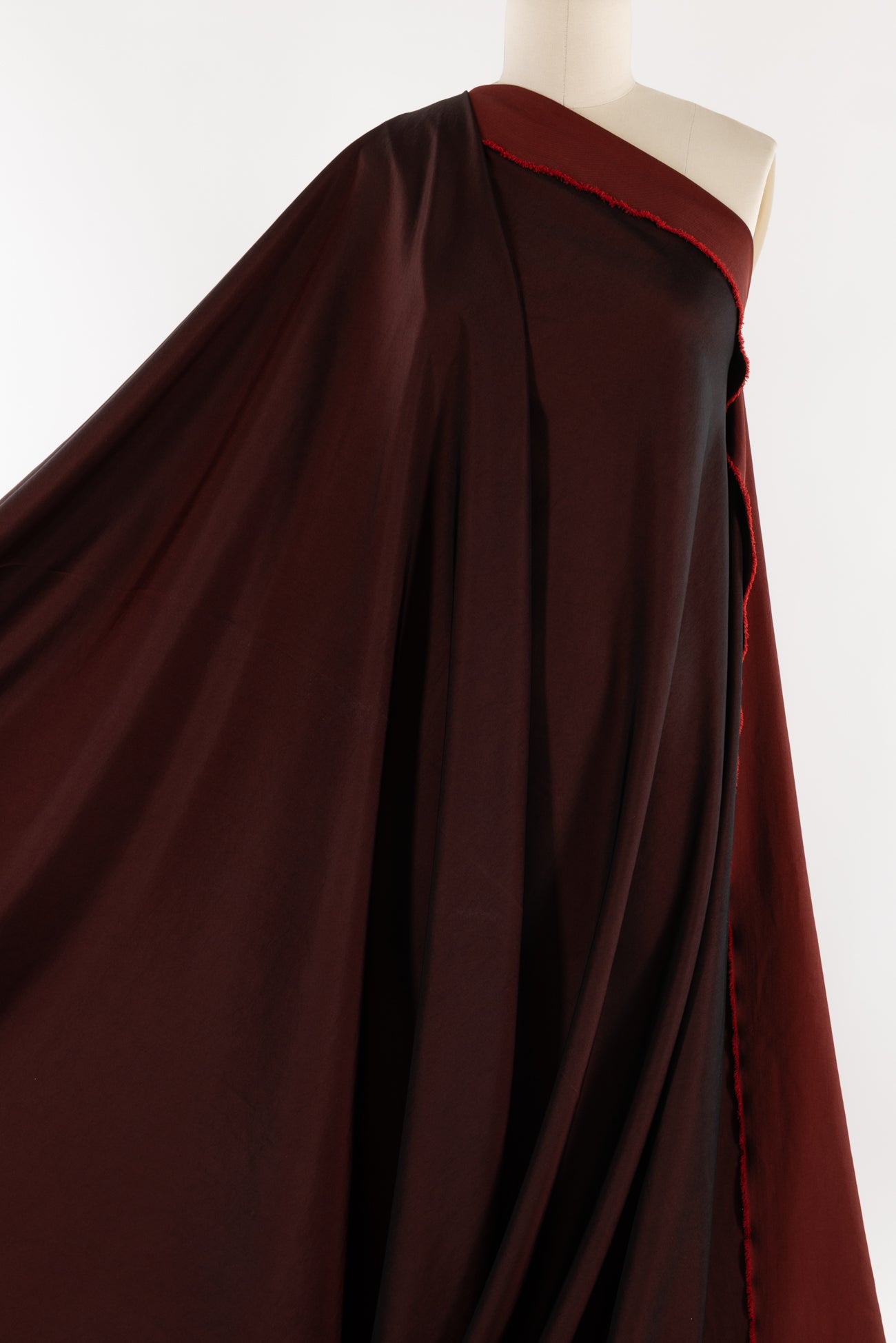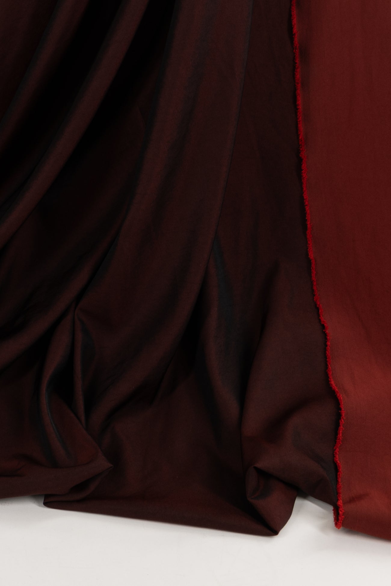 Deep ruby and red water-resistant rainwear, double-sided deadstock from an LA designer. Lightweight, cross-woven with a black warp and red weft so it is deep ruby on one side, red on the other, and will fold up to almost nothing. Beautiful and supple with a malleable smooth hand, softly shimmering surface, dry hand, and liquid drape. Perfect for a coat or jacket, cape or poncho.