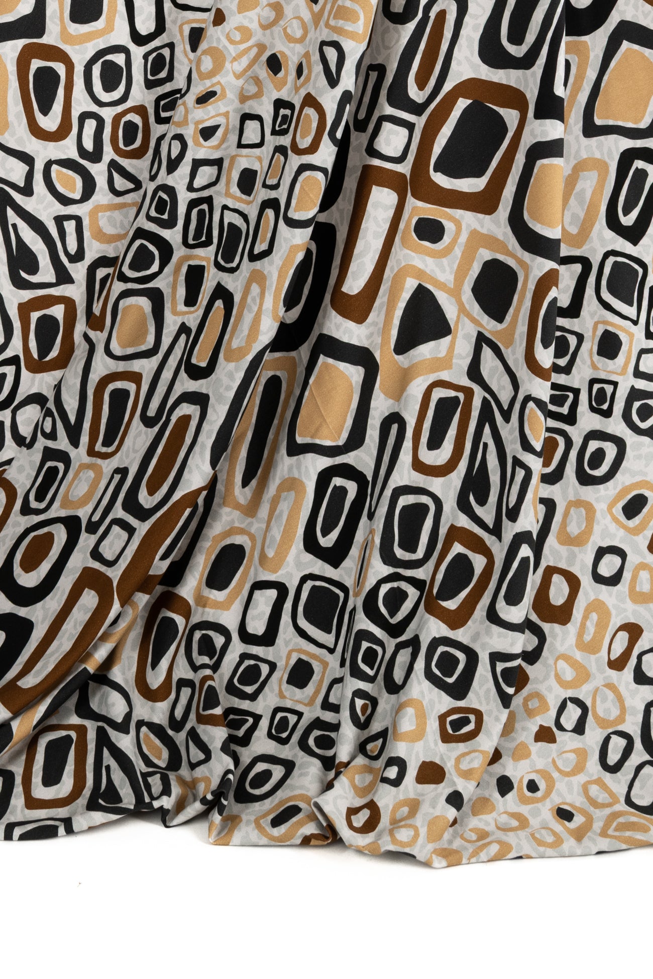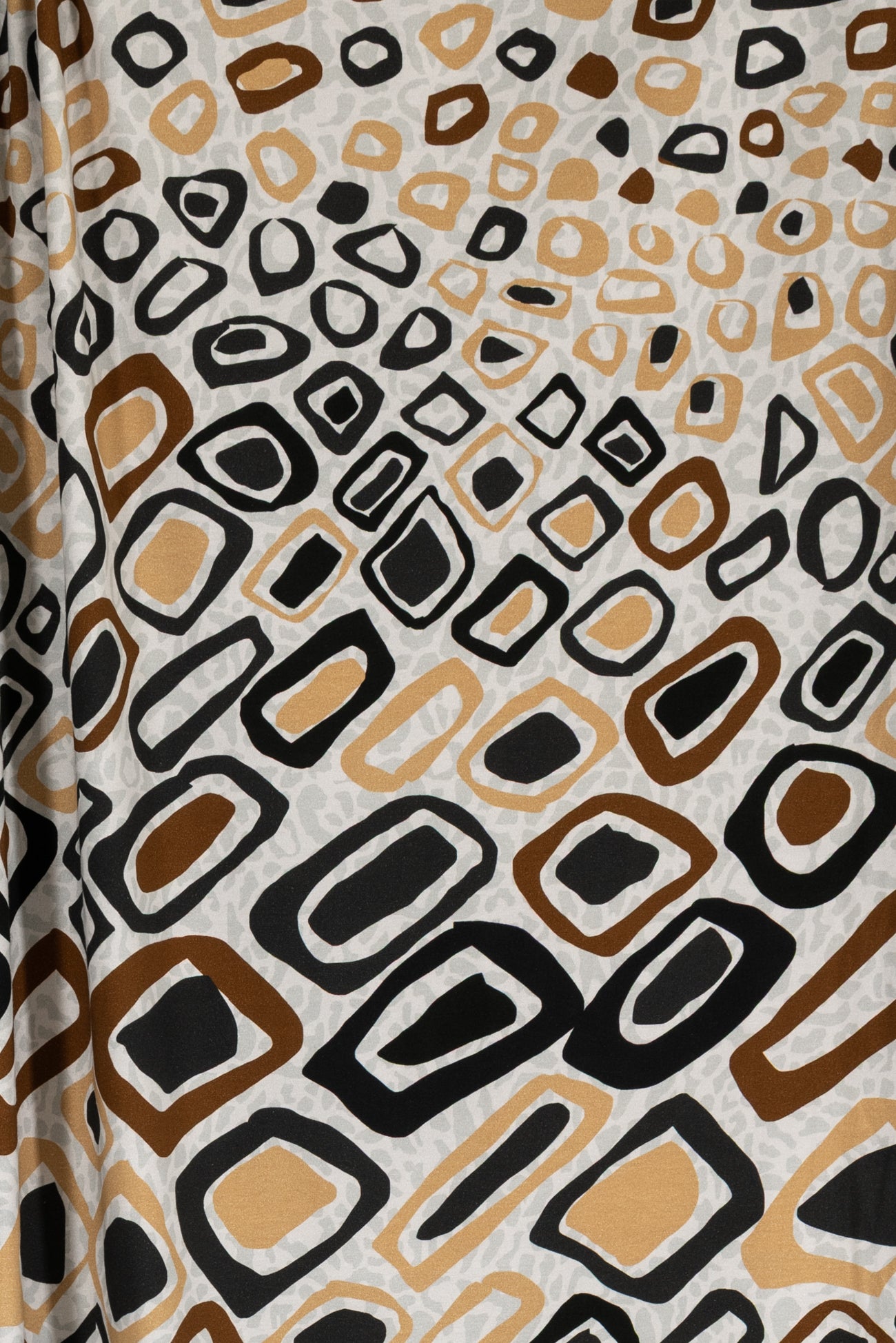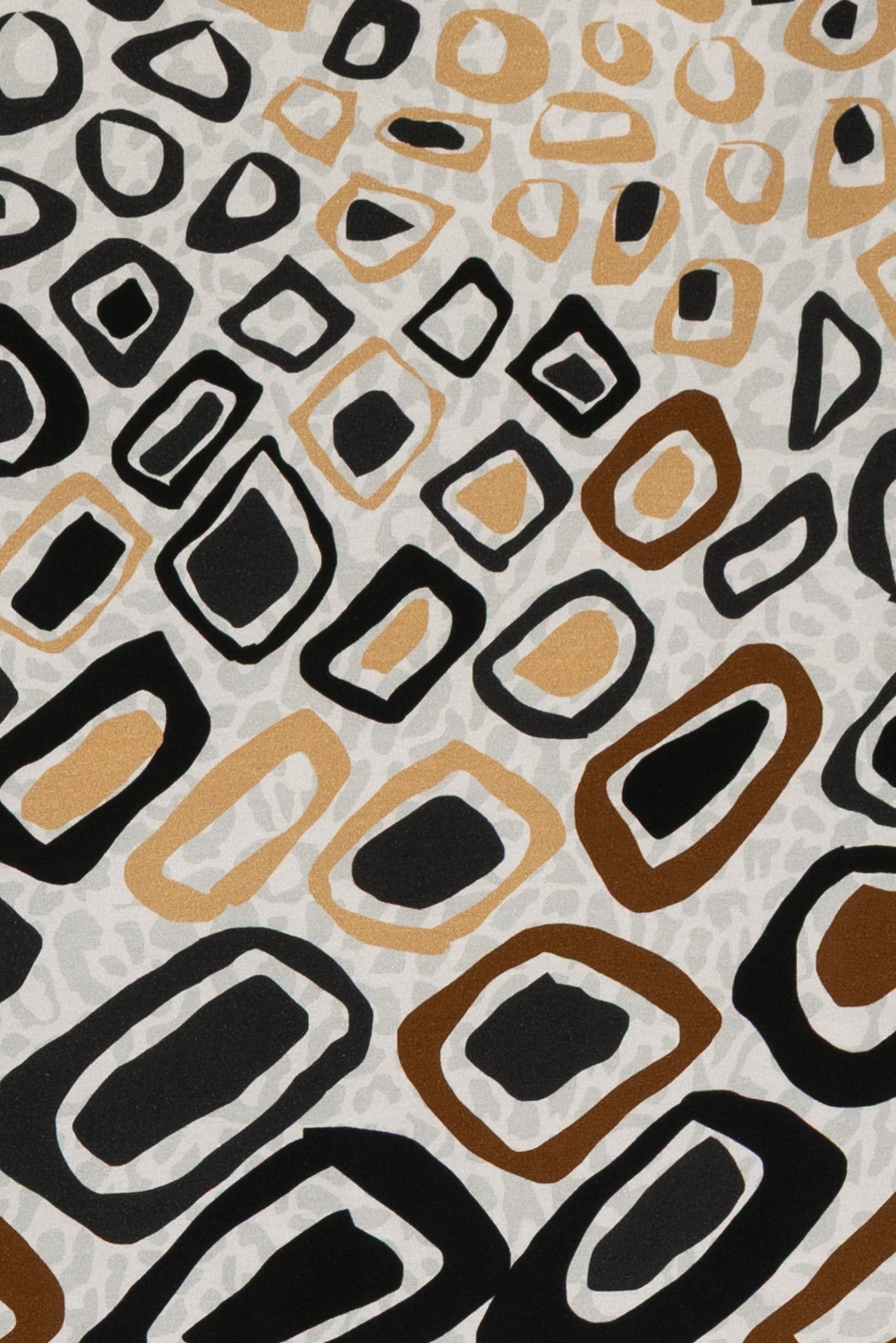 Abstract arty animal print in brown, gold and black on a quiet gray dappled background, in a digital print on impeccable European quality cotton/spandex jersey knit from Denmark. A gorgeous sophisticated take on the classic wild animal print. Light/mid-weight, opaque, and will skim the body in a flattering way. It has a soft, smooth texture, fluid drape, 4-way stretch, a 33" repeat, and some rolling at the cut edge. Right for a t-shirt, tunic, dress, soft pants, leggings, cardigan, skirt, or loungewear, as well as children's or men's clothing. Oeko-Tex® certified.