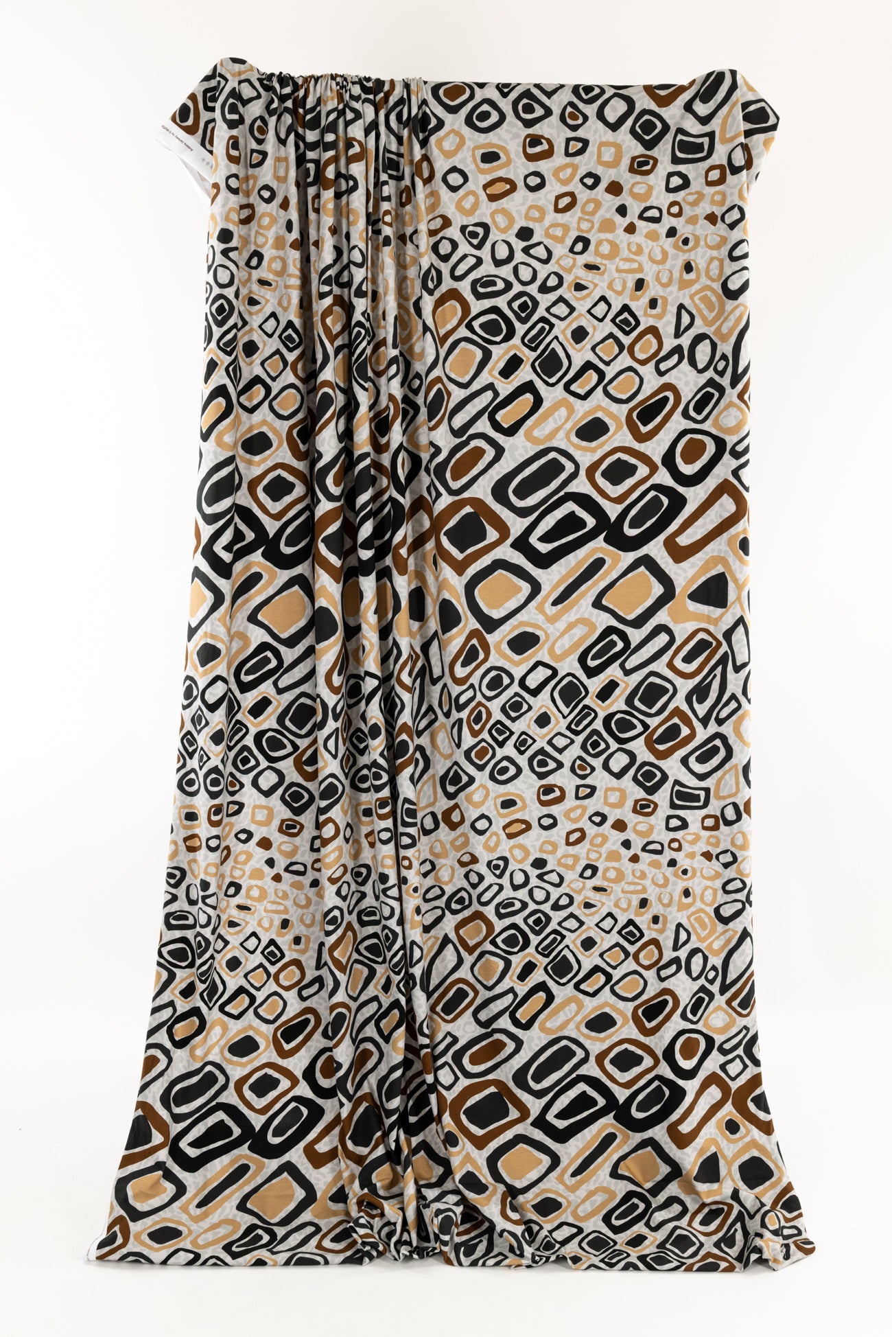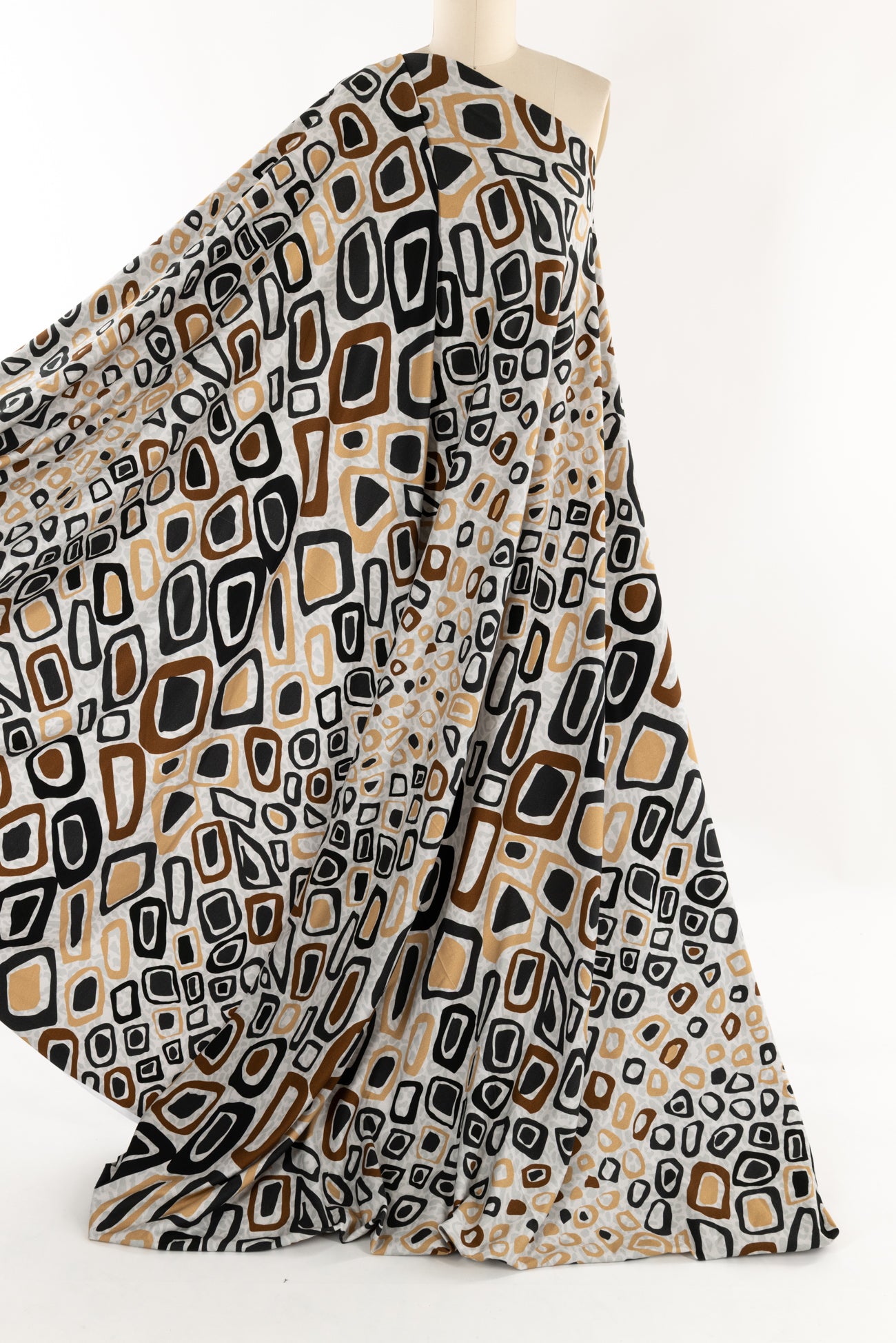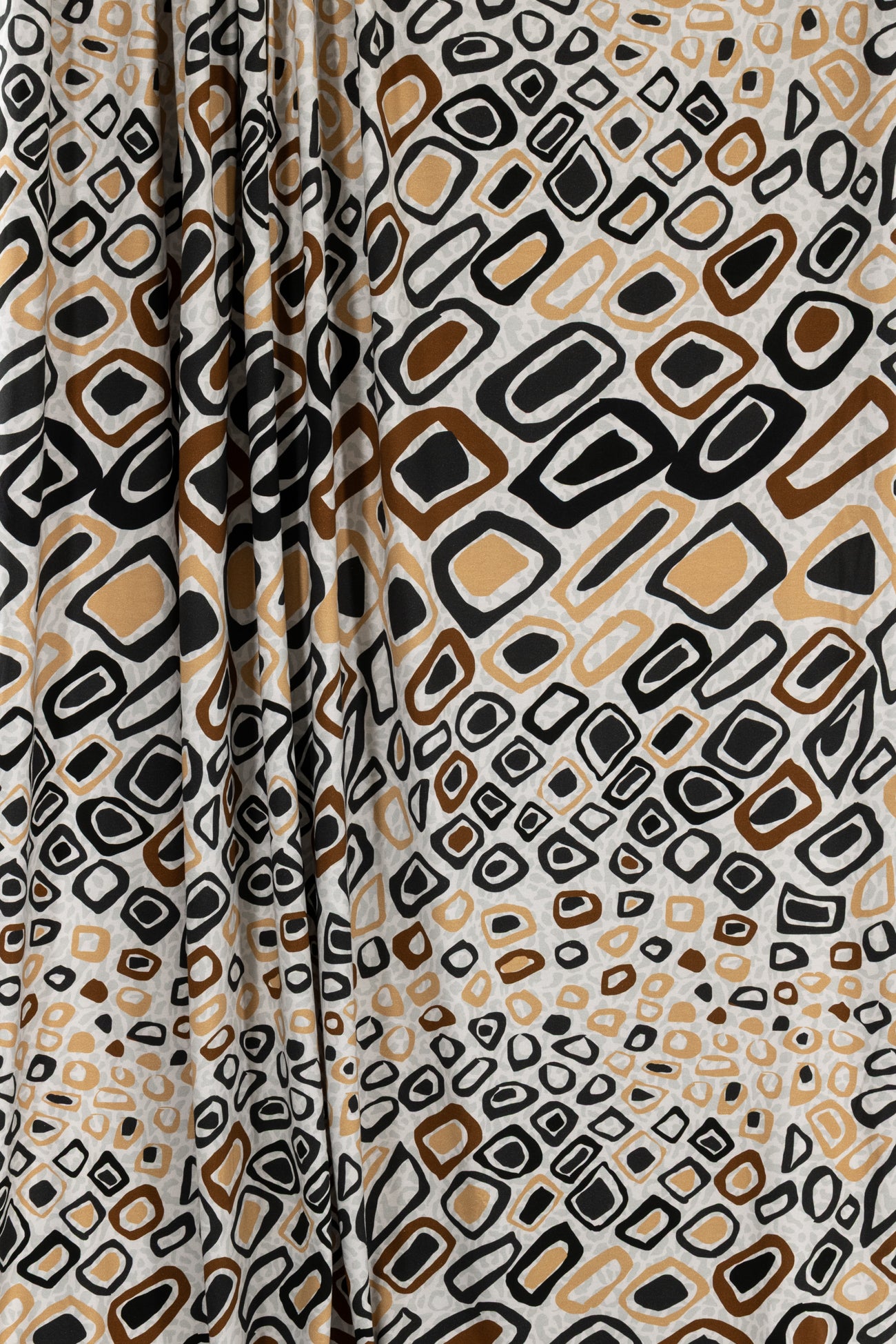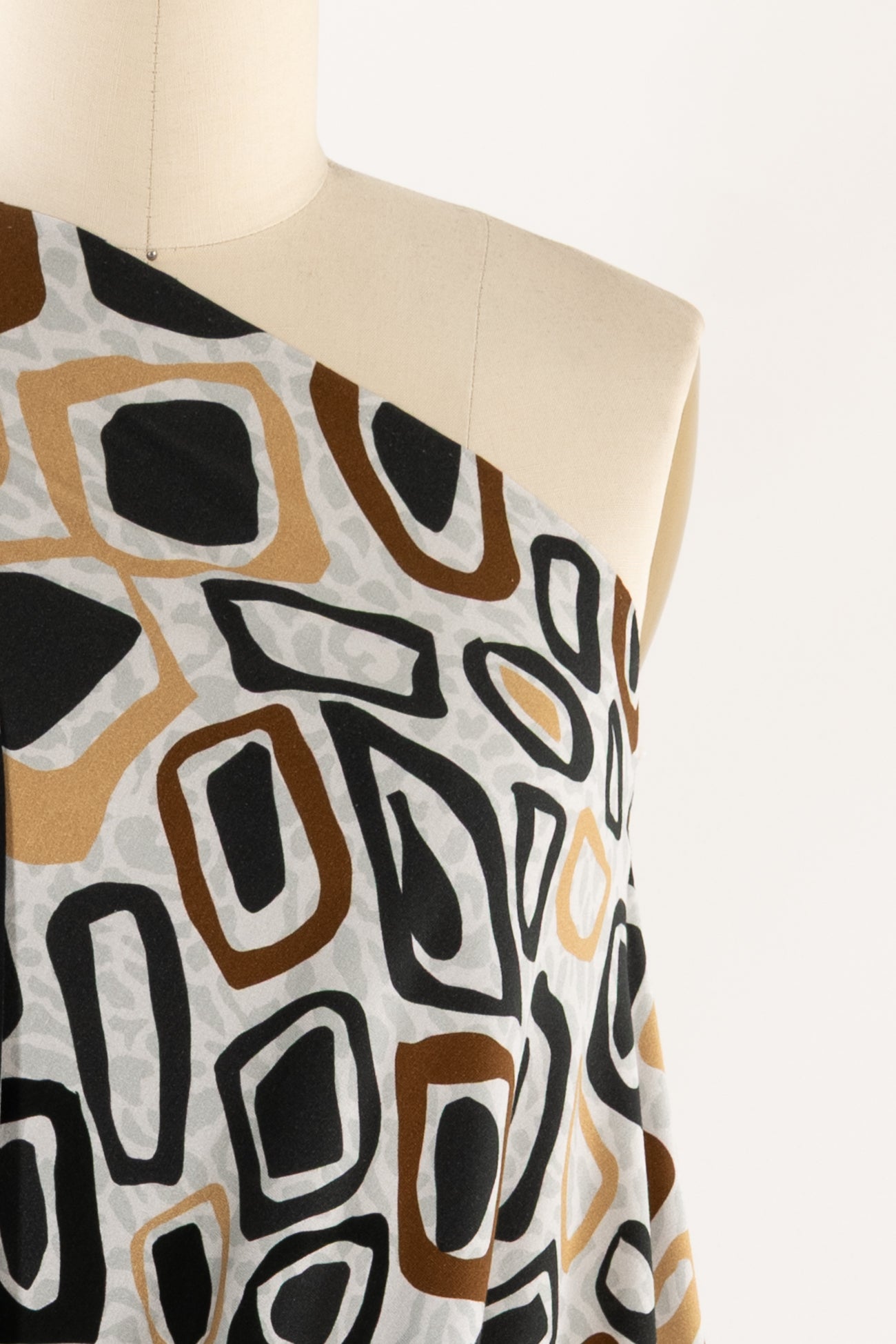 Abstract arty animal print in brown, gold and black on a quiet gray dappled background, in a digital print on impeccable European quality cotton/spandex jersey knit from Denmark. A gorgeous sophisticated take on the classic wild animal print. Light/mid-weight, opaque, and will skim the body in a flattering way. It has a soft, smooth texture, fluid drape, 4-way stretch, a 33" repeat, and some rolling at the cut edge. Right for a t-shirt, tunic, dress, soft pants, leggings, cardigan, skirt, or loungewear, as well as children's or men's clothing. Oeko-Tex® certified.