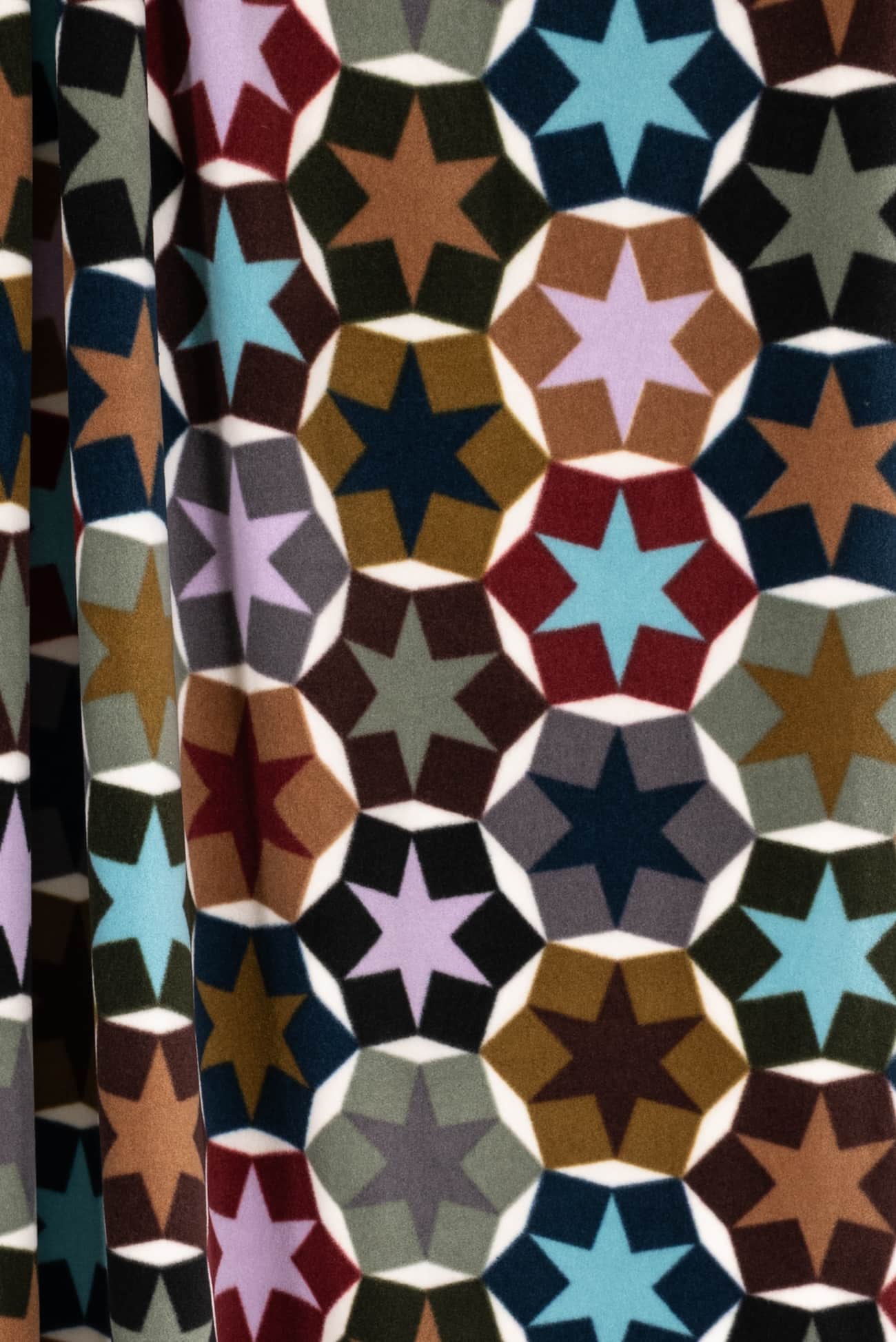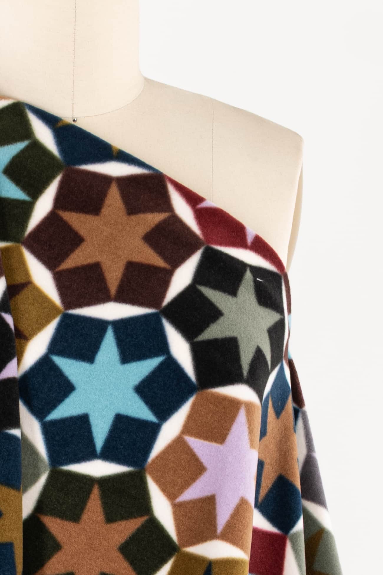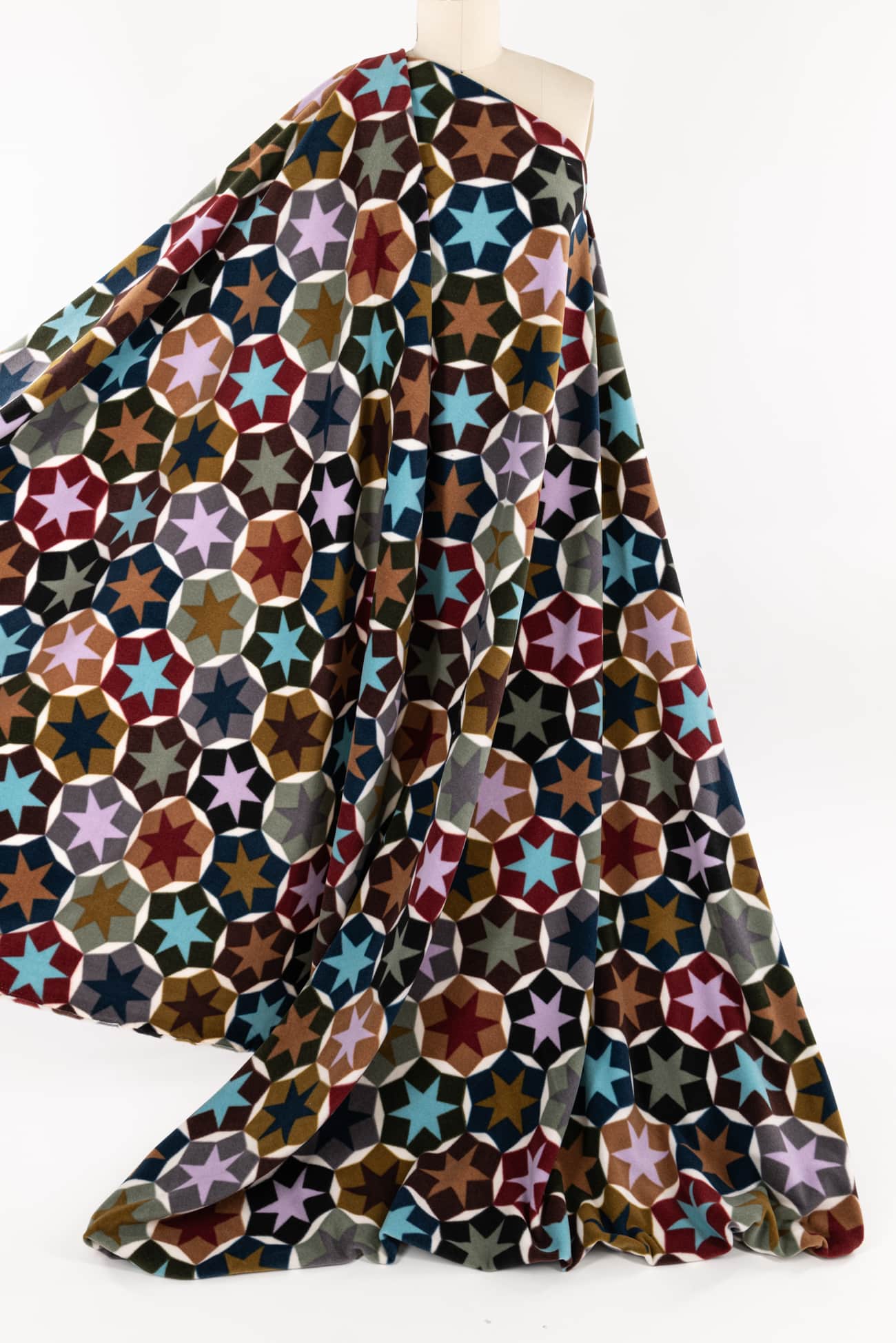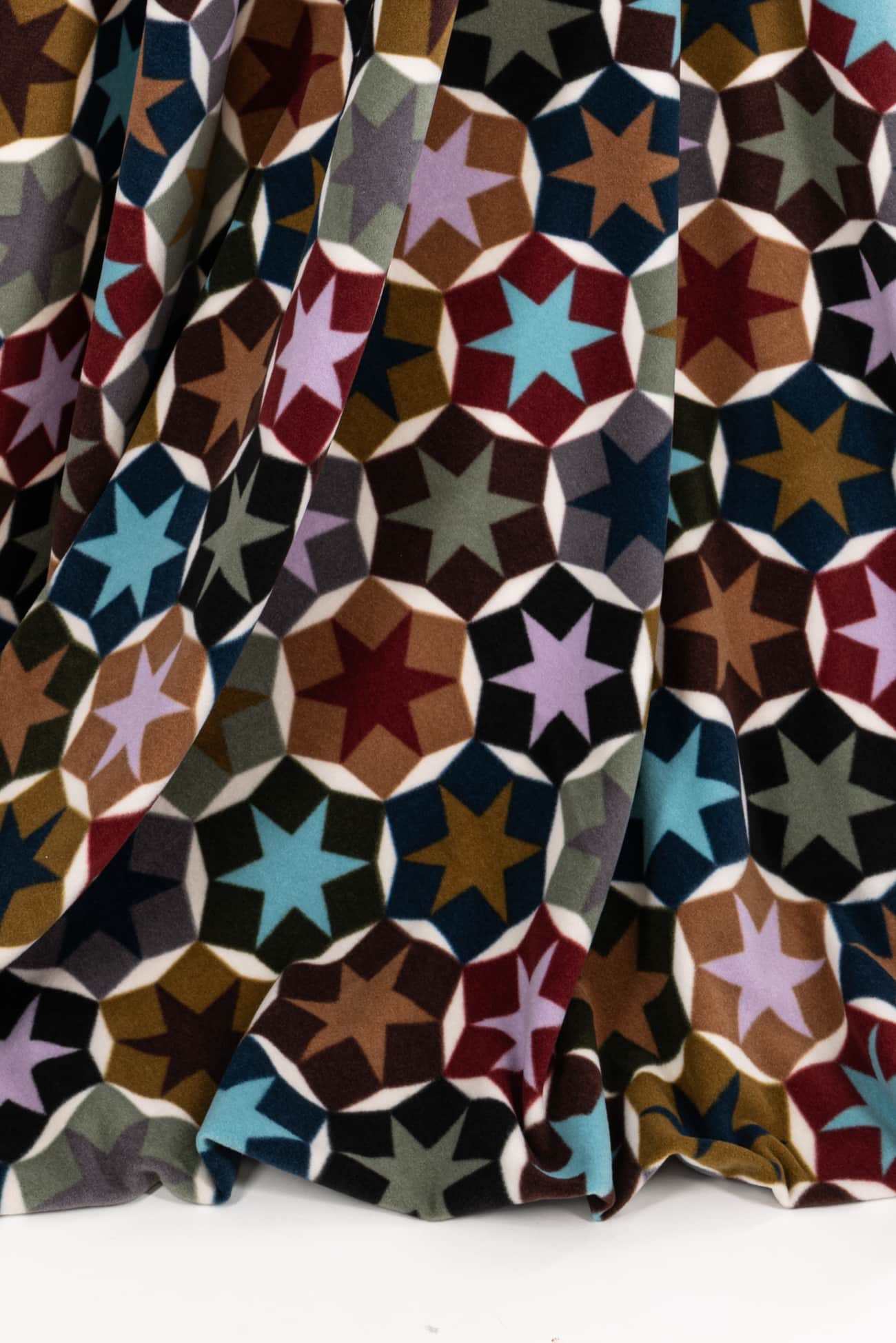 Soft and cozy fleece knit with an overall multicolored star-quilt themed print etched in black. Think P@tagonia with a cool print. Softly brushed fleece on the front, flat and smooth on the reverse and no raveling so no seam finish needed. Mid-weight with crosswise stretch, a touch of rolling at the cut edge and a 24" repeat. Perfect for cozying up in a top, t-shirt, tunic, hoodie, jacket, vest, joggers or a throw.