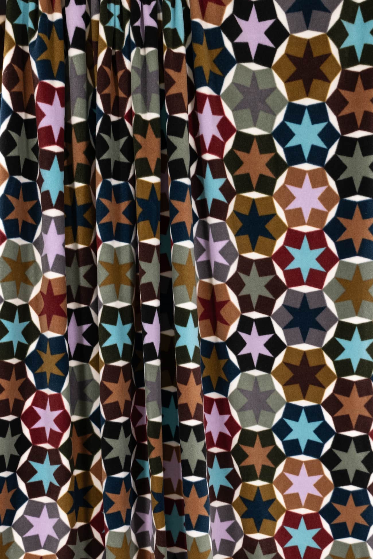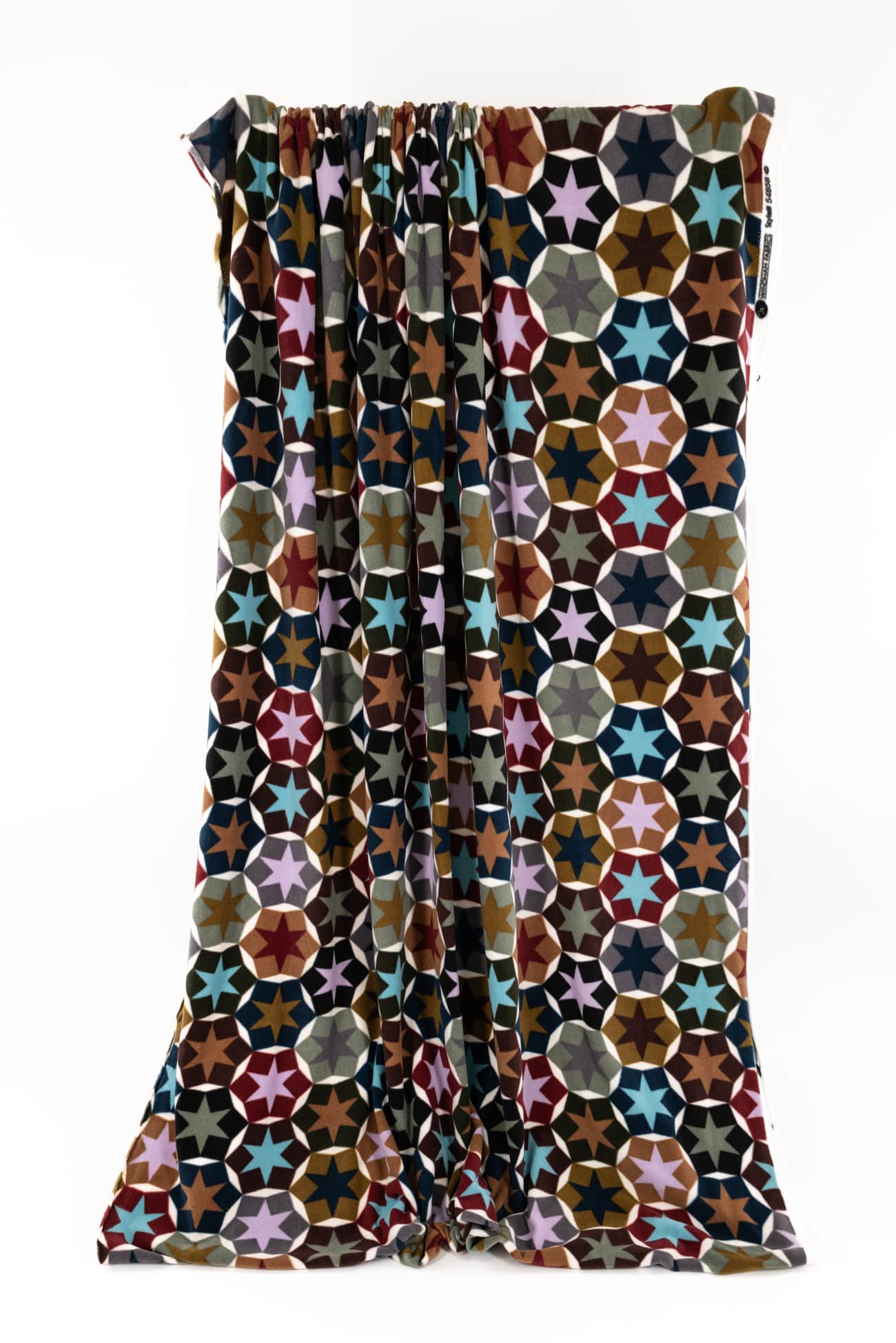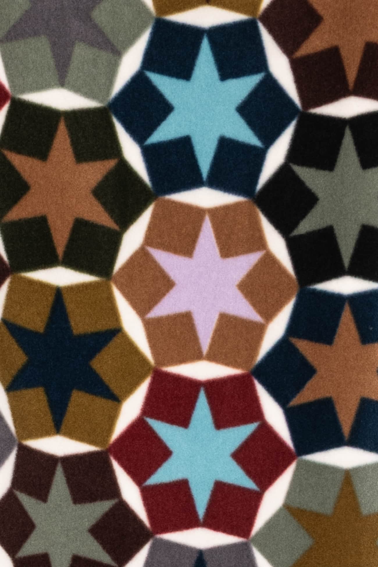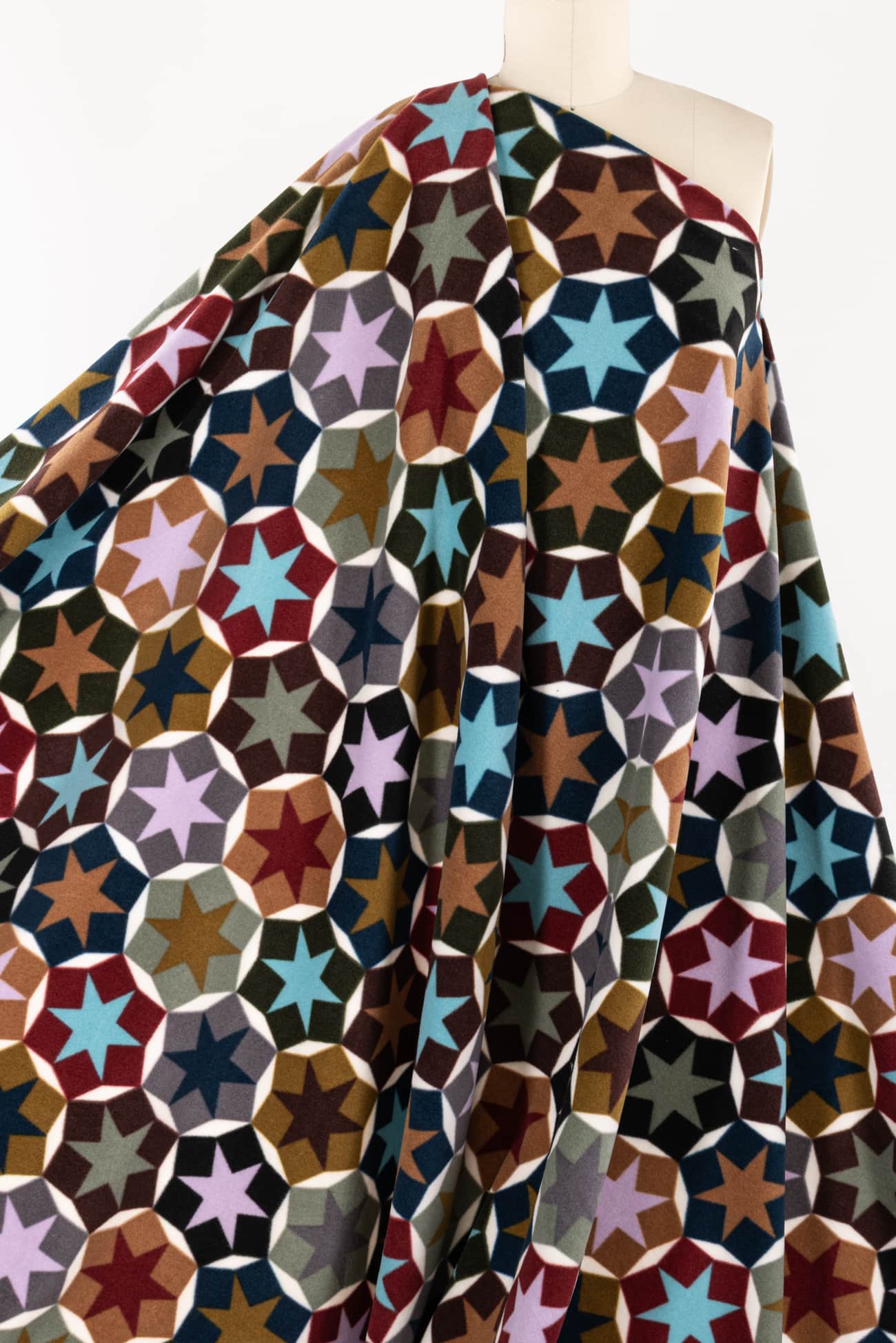 Soft and cozy fleece knit with an overall multicolored star-quilt themed print etched in black. Think P@tagonia with a cool print. Softly brushed fleece on the front, flat and smooth on the reverse and no raveling so no seam finish needed. Mid-weight with crosswise stretch, a touch of rolling at the cut edge and a 24" repeat. Perfect for cozying up in a top, t-shirt, tunic, hoodie, jacket, vest, joggers or a throw.