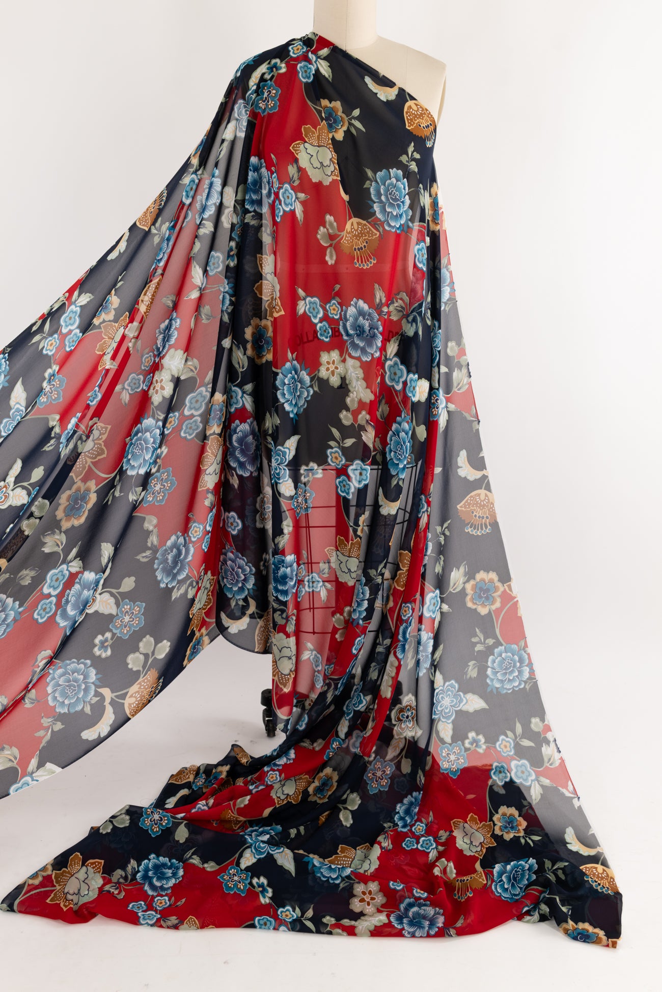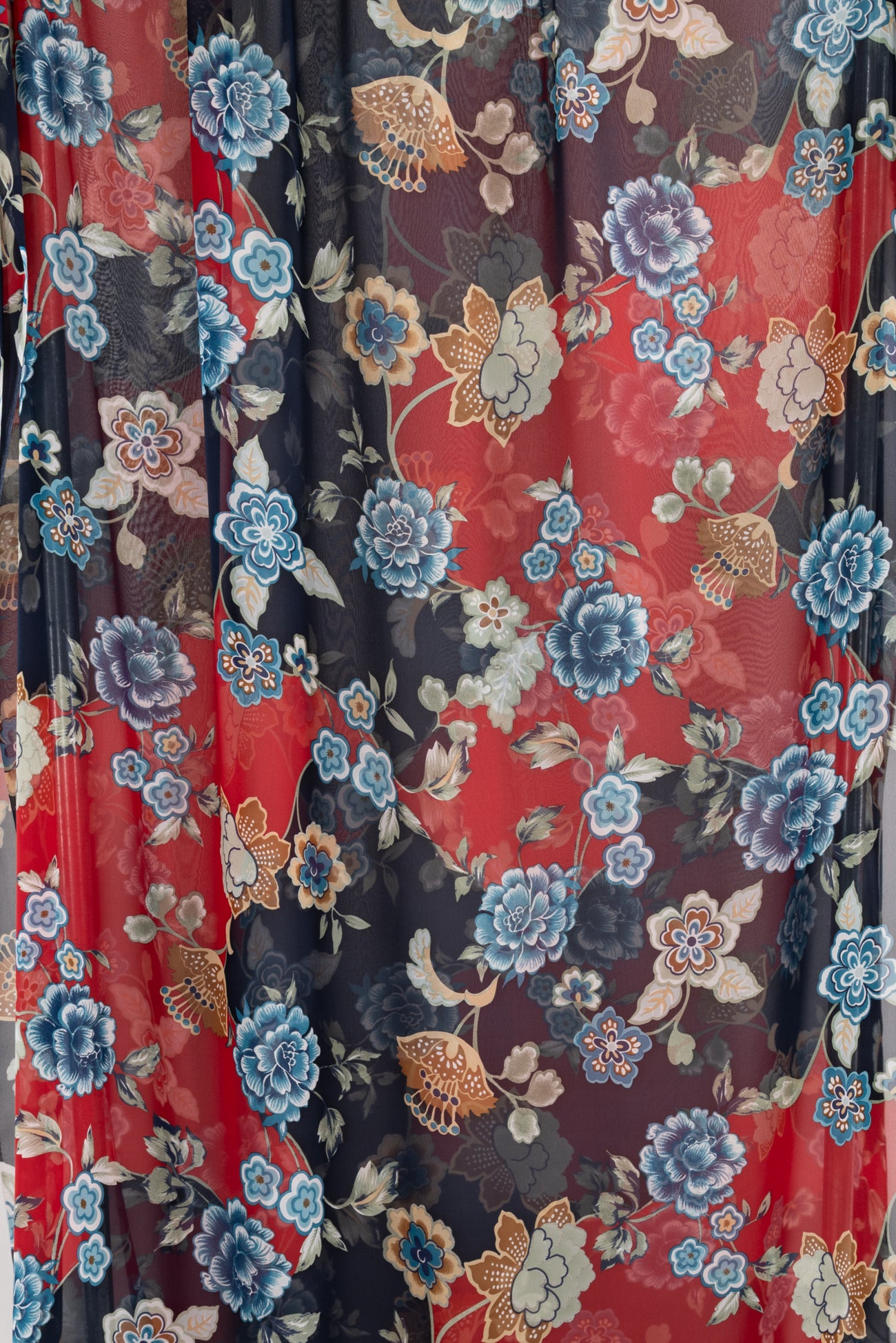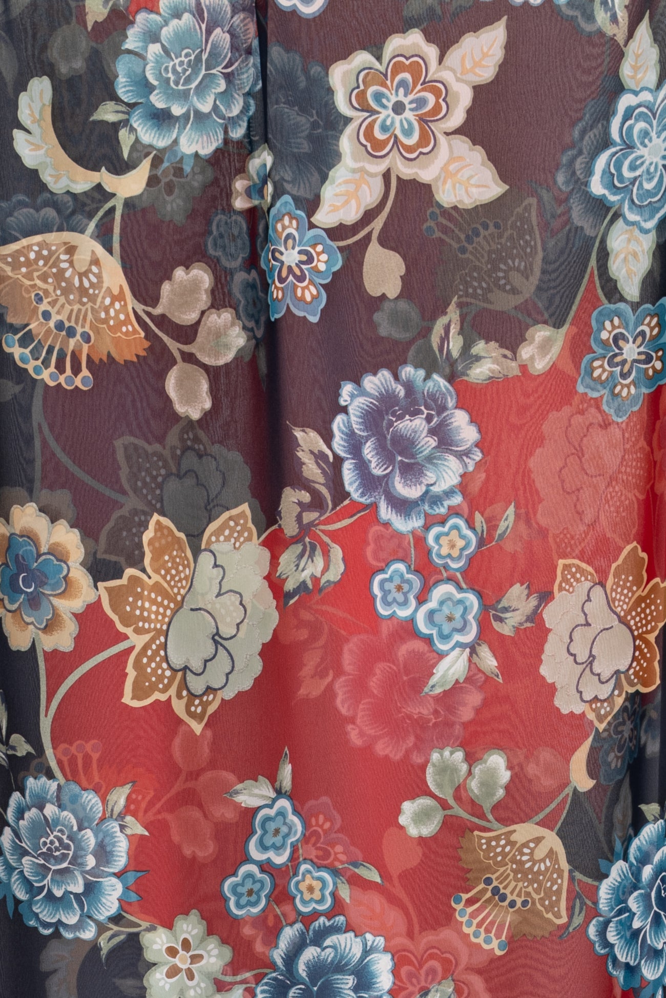 Elegant ethereal floral with blue and white, and beige and brown flowers on a navy and crimson background in a light and airy silk chiffon. Fine quality deadstock from an Italian mill is semi-sheer, with a cool smooth hand, fluid liquid drape, and 29¼" repeat. Right for blouse, tunic, dress, skirt, to layer over another garment, or line.