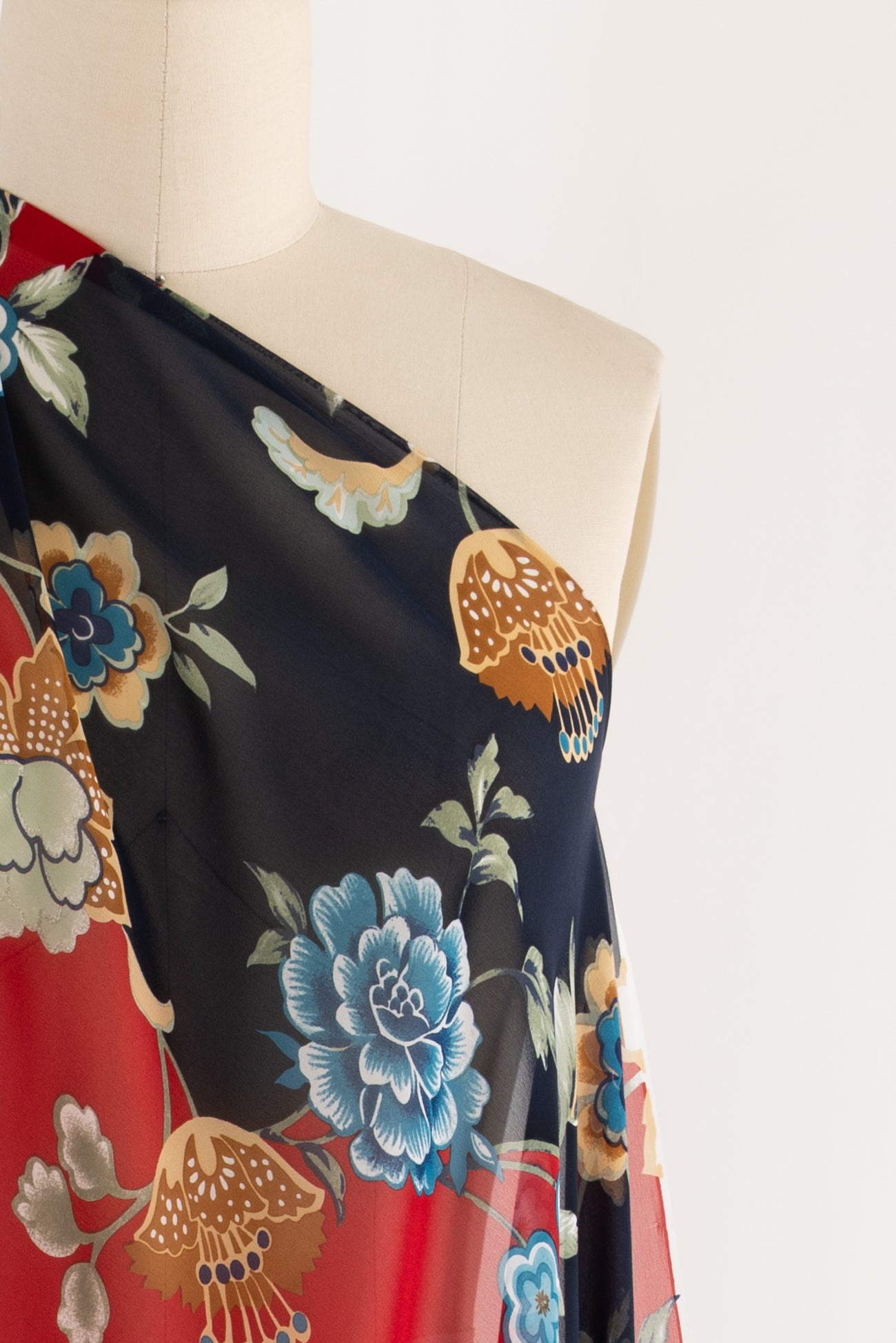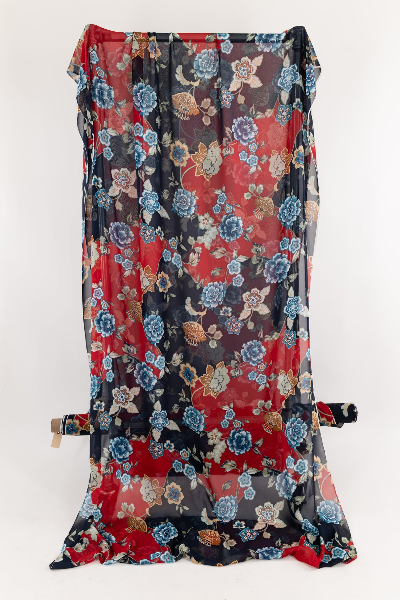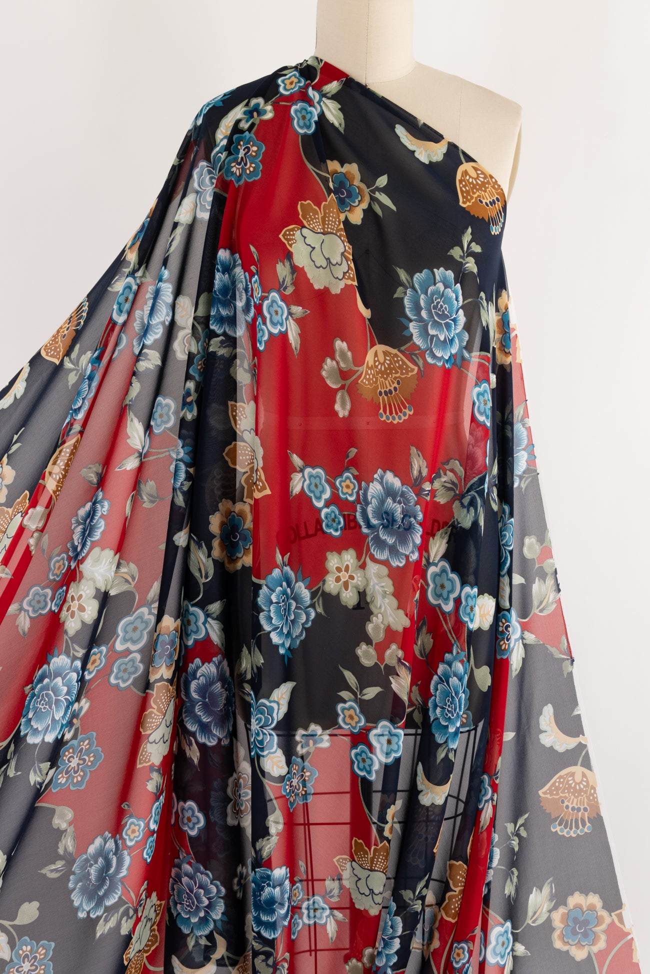 Elegant ethereal floral with blue and white, and beige and brown flowers on a navy and crimson background in a light and airy silk chiffon. Fine quality deadstock from an Italian mill is semi-sheer, with a cool smooth hand, fluid liquid drape, and 29¼" repeat. Right for blouse, tunic, dress, skirt, to layer over another garment, or line.