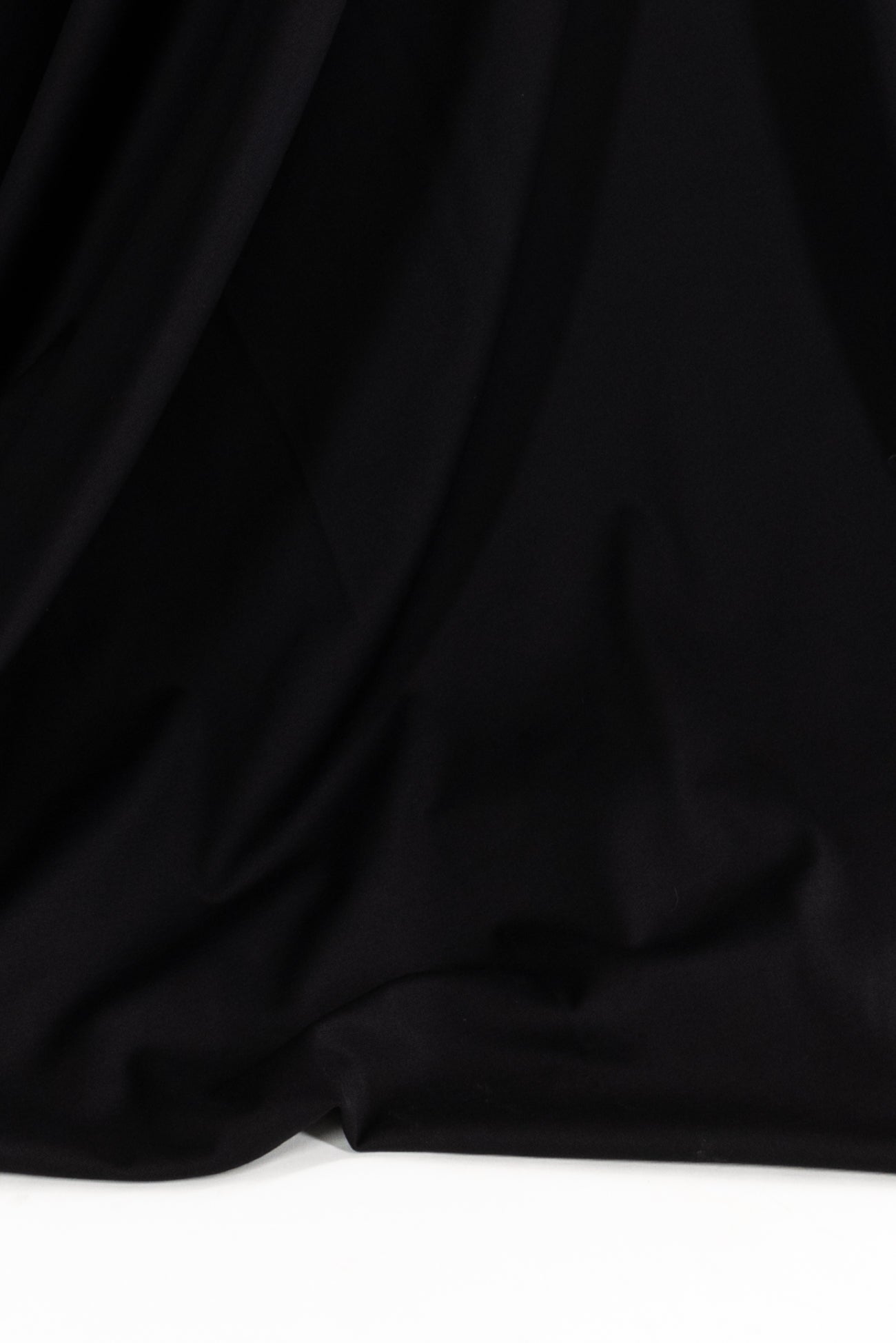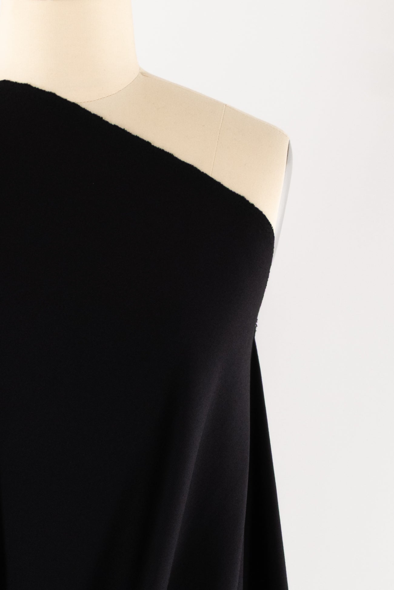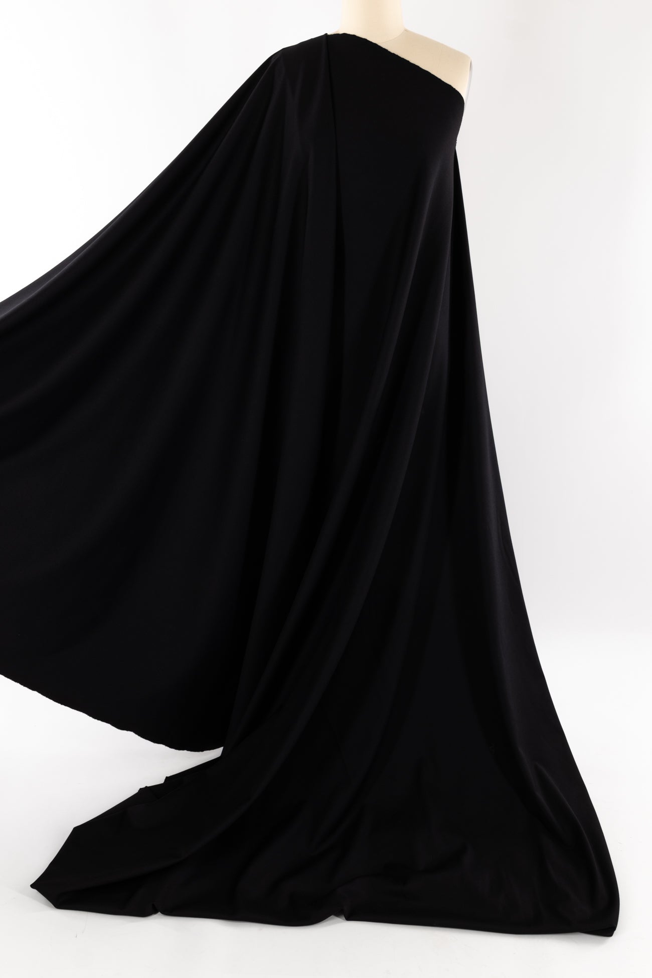 Classic black ponte knit found in response to requests for 'Eileen Fisher' type ponte. Beefy, but not thick, mid-weight, with a smooth hand, sculptural drape, 4-way stretch, made in the USA. Top quality in the ideal rayon/nylon/lycra blend that is perfect for both tops and bottoms: pants, top, t-shirt, jacket, vest, coat, structured dress or skirt. A natural for wardrobing and travel. Mix tops and bottoms in this fabric to wear together or as separates. PLUS, it has such a nice, smooth hand that other garments will slip on easily over and under. This is a workhorse fabric that will work in many interpretations!
