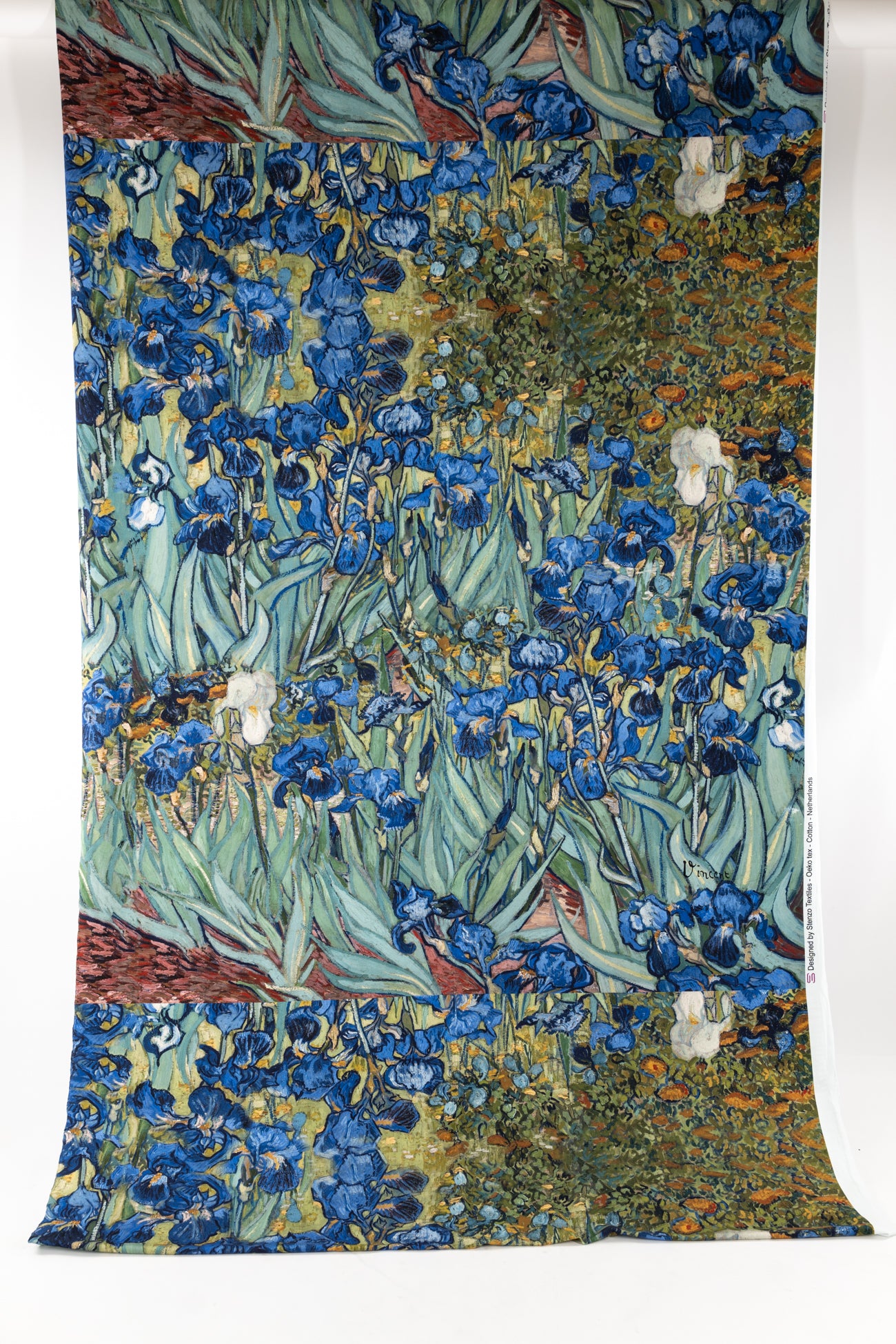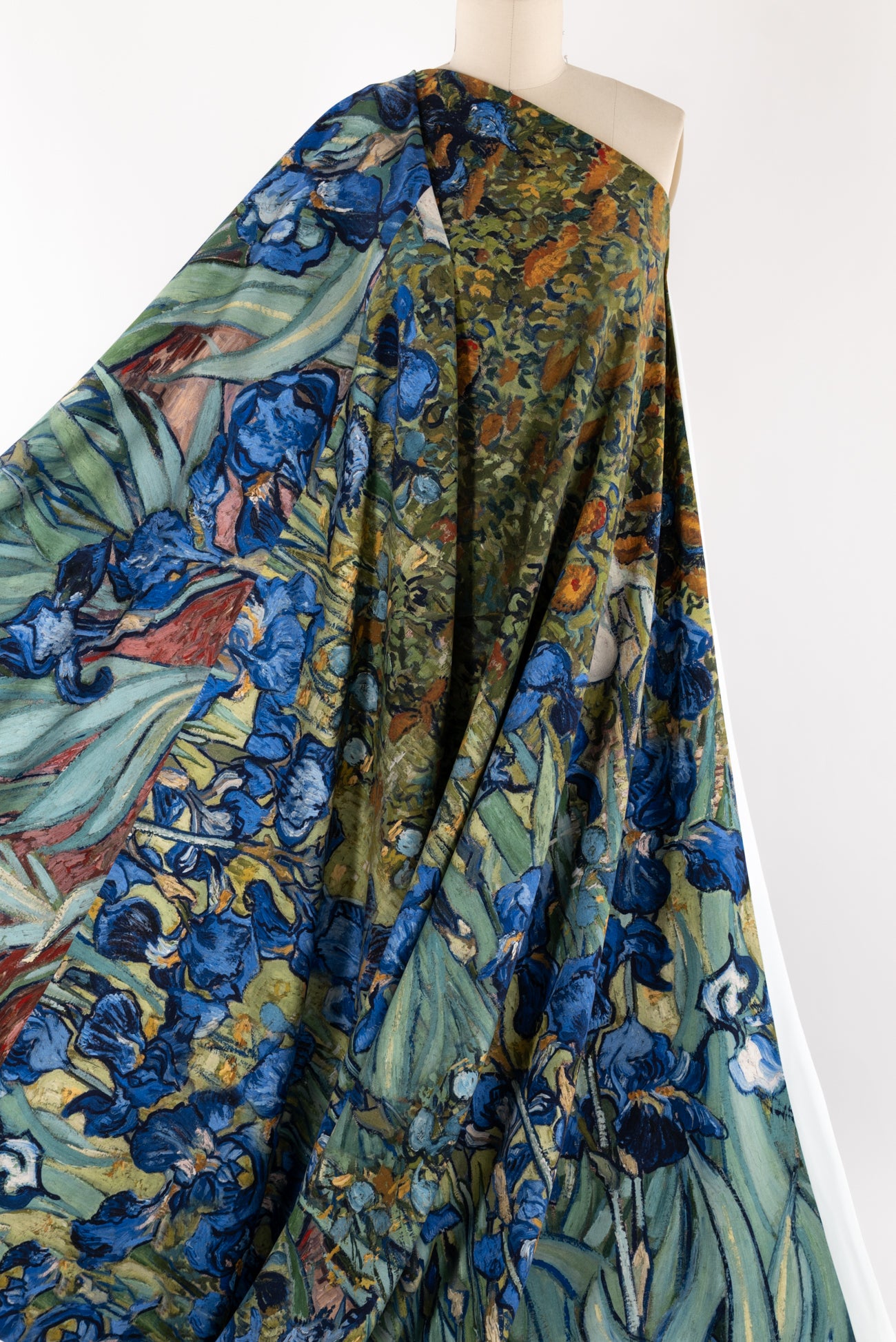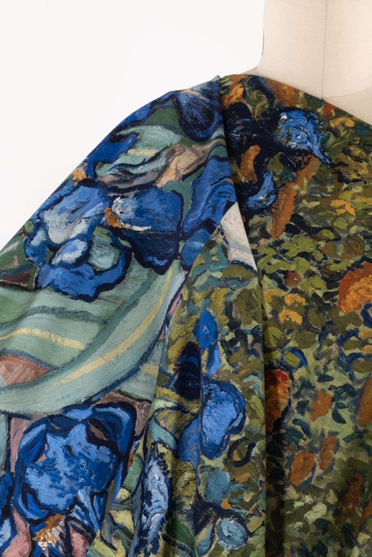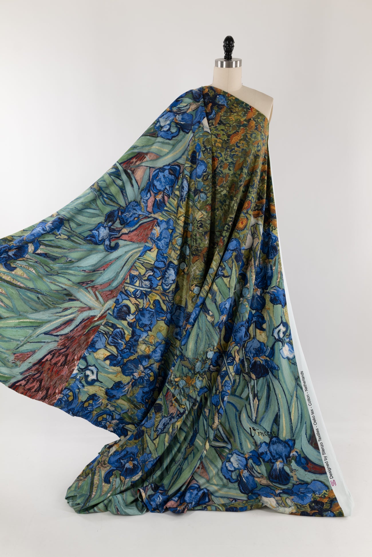 Stunning interpretation of a richly colored Van Gogh Irises painting, PRODUCED in the Netherlands and digitally printed on a luxurious cotton French Terry knit. Reverses to a white, super soft, and cozy brushed back side. Impeccable quality, light to mid-weight, flattering, body-skimming flow, with a smooth appealing surface, fluid drape, crosswise stretch (with a bit of lengthwise stretch), and a slight rolling at the cut edge. One way design, 64" repeat.  Right for T-shirts, tunics, dresses, skirts, soft pants, loungewear, caftans, kimonos, as well as children's and men's clothing. A line of demarcation exists between the panels; if you purchase multiple panels, we will cut them in one piece. Oeko-Tex® certified. Marcy says, 'SO beautiful, you can see the brush strokes in the print.'