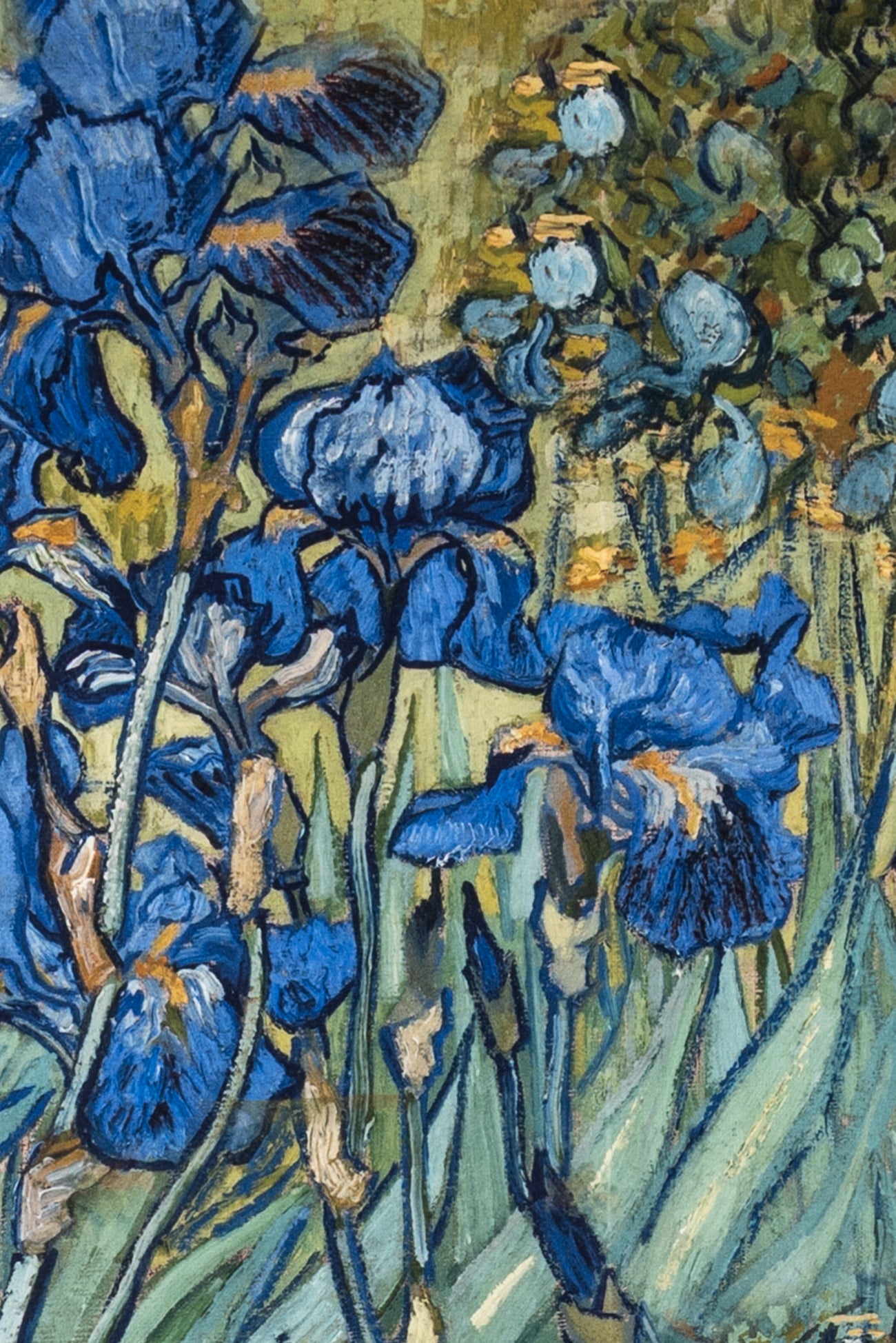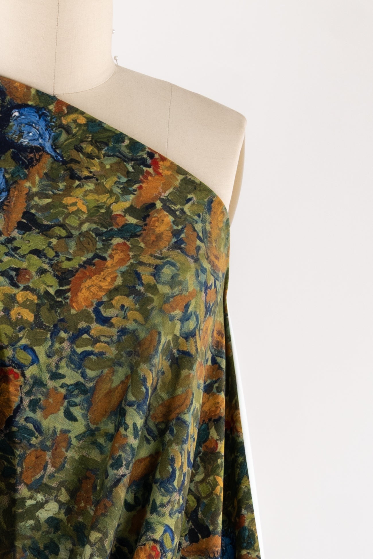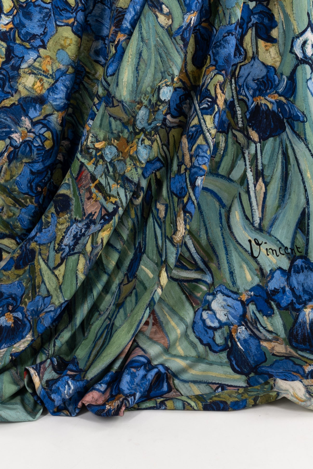 Stunning interpretation of a richly colored Van Gogh Irises painting, PRODUCED in the Netherlands and digitally printed on a luxurious cotton French Terry knit. Reverses to a white, super soft, and cozy brushed back side. Impeccable quality, light to mid-weight, flattering, body-skimming flow, with a smooth appealing surface, fluid drape, crosswise stretch (with a bit of lengthwise stretch), and a slight rolling at the cut edge. One way design, 64" repeat.  Right for T-shirts, tunics, dresses, skirts, soft pants, loungewear, caftans, kimonos, as well as children's and men's clothing. A line of demarcation exists between the panels; if you purchase multiple panels, we will cut them in one piece. Oeko-Tex® certified. Marcy says, 'SO beautiful, you can see the brush strokes in the print.'