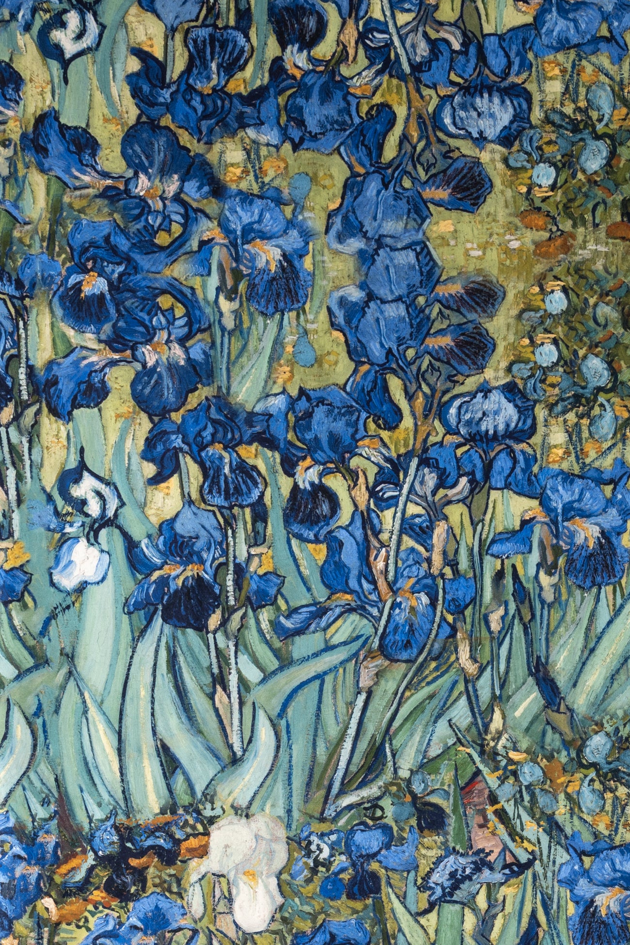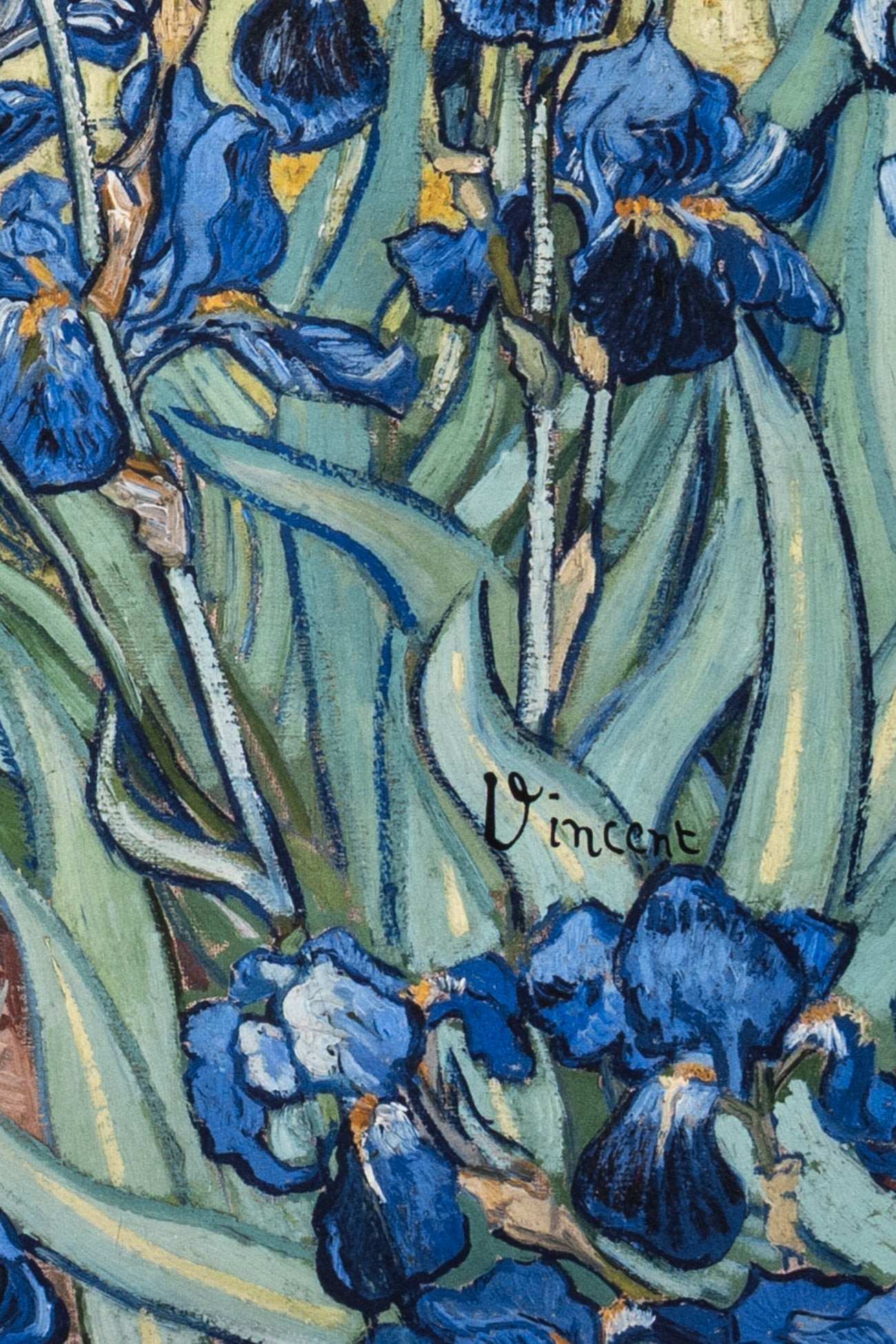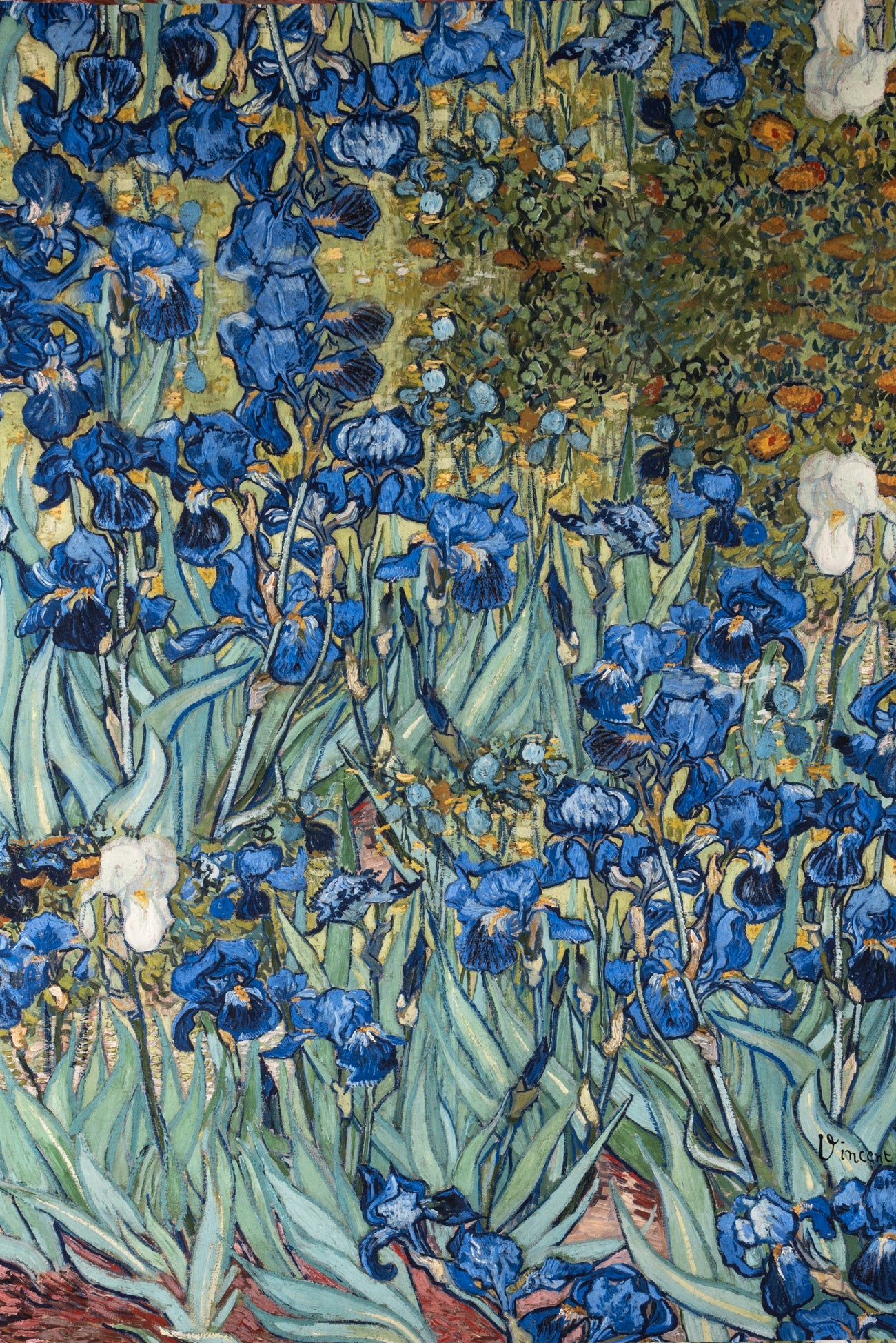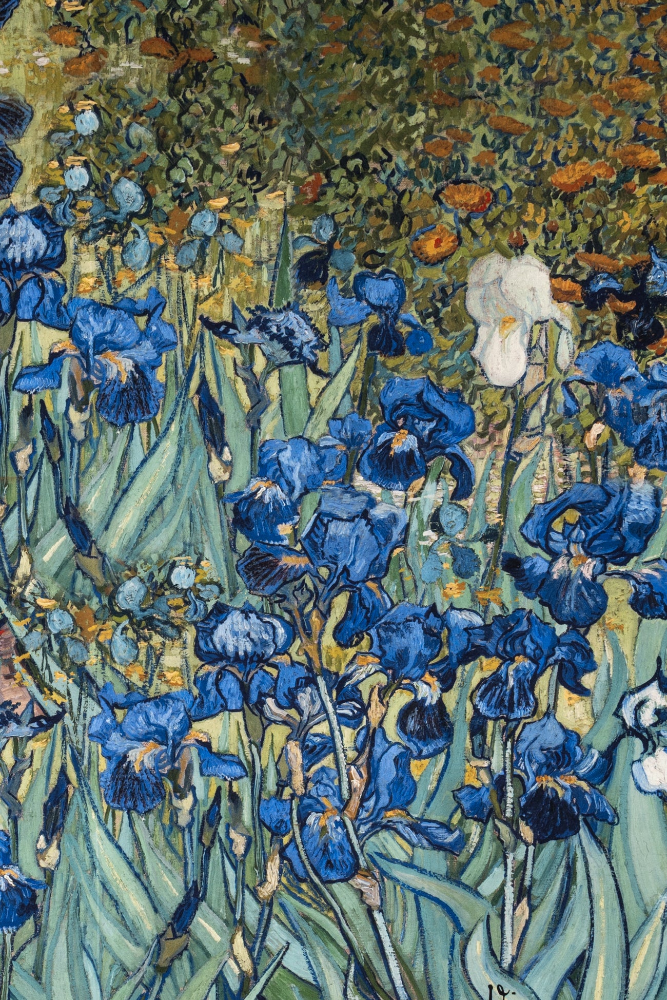 Stunning interpretation of a richly colored Van Gogh Irises painting, PRODUCED in the Netherlands and digitally printed on a luxurious cotton French Terry knit. Reverses to a white, super soft, and cozy brushed back side. Impeccable quality, light to mid-weight, flattering, body-skimming flow, with a smooth appealing surface, fluid drape, crosswise stretch (with a bit of lengthwise stretch), and a slight rolling at the cut edge. One way design, 64" repeat.  Right for T-shirts, tunics, dresses, skirts, soft pants, loungewear, caftans, kimonos, as well as children's and men's clothing. A line of demarcation exists between the panels; if you purchase multiple panels, we will cut them in one piece. Oeko-Tex® certified. Marcy says, 'SO beautiful, you can see the brush strokes in the print.'