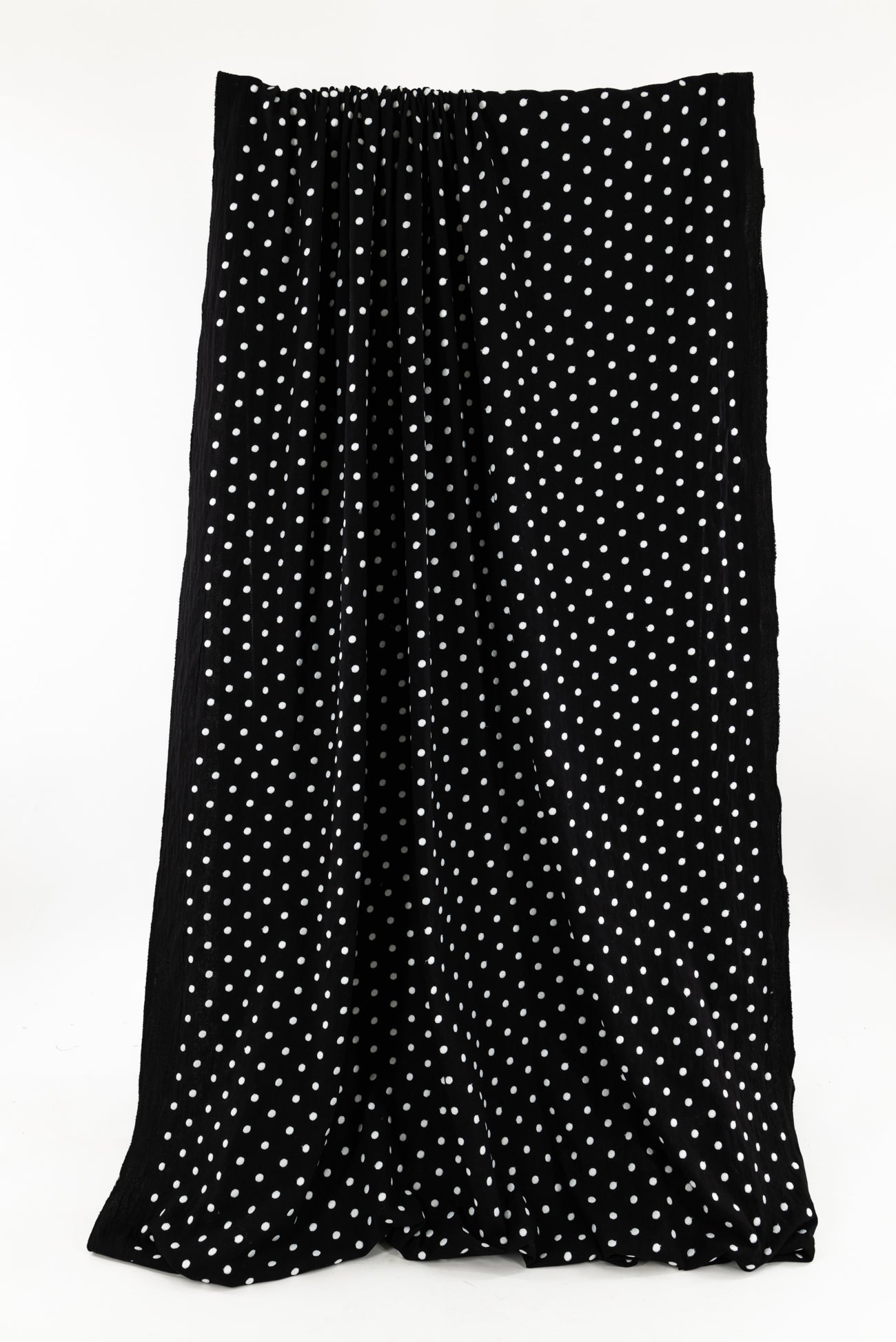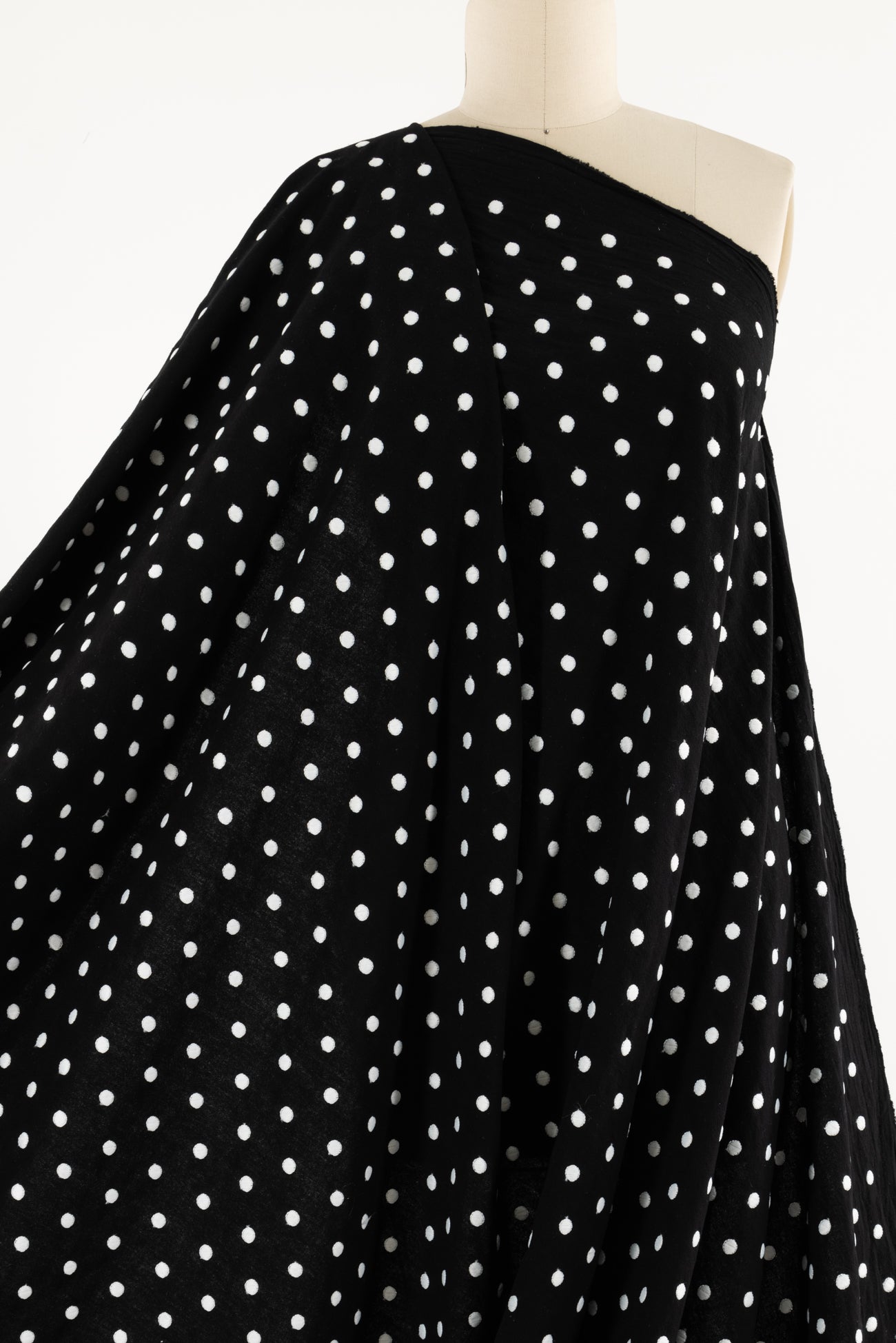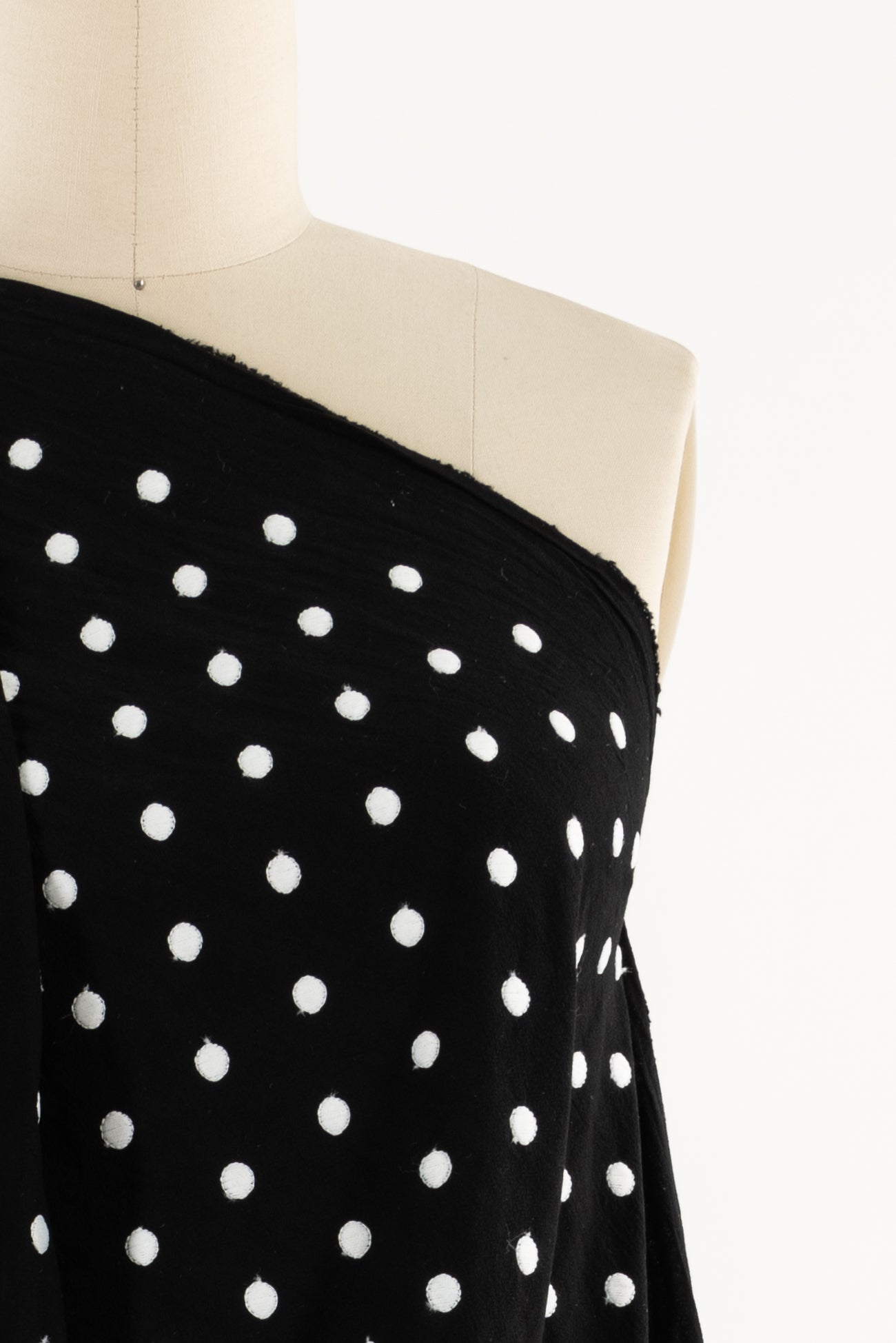 Deep black cotton embroidered all over with softly dimensional white dots. Deadstock from an Italian mill. Light/mid-weight cotton is opaque, with a lightly textured cool matte hand, soft embroidered dots, a 1½" repeat and light drape. Right for a shirt, top, tunic, dress, caftan, kimono, soft pant, vest, menswear, or children's.