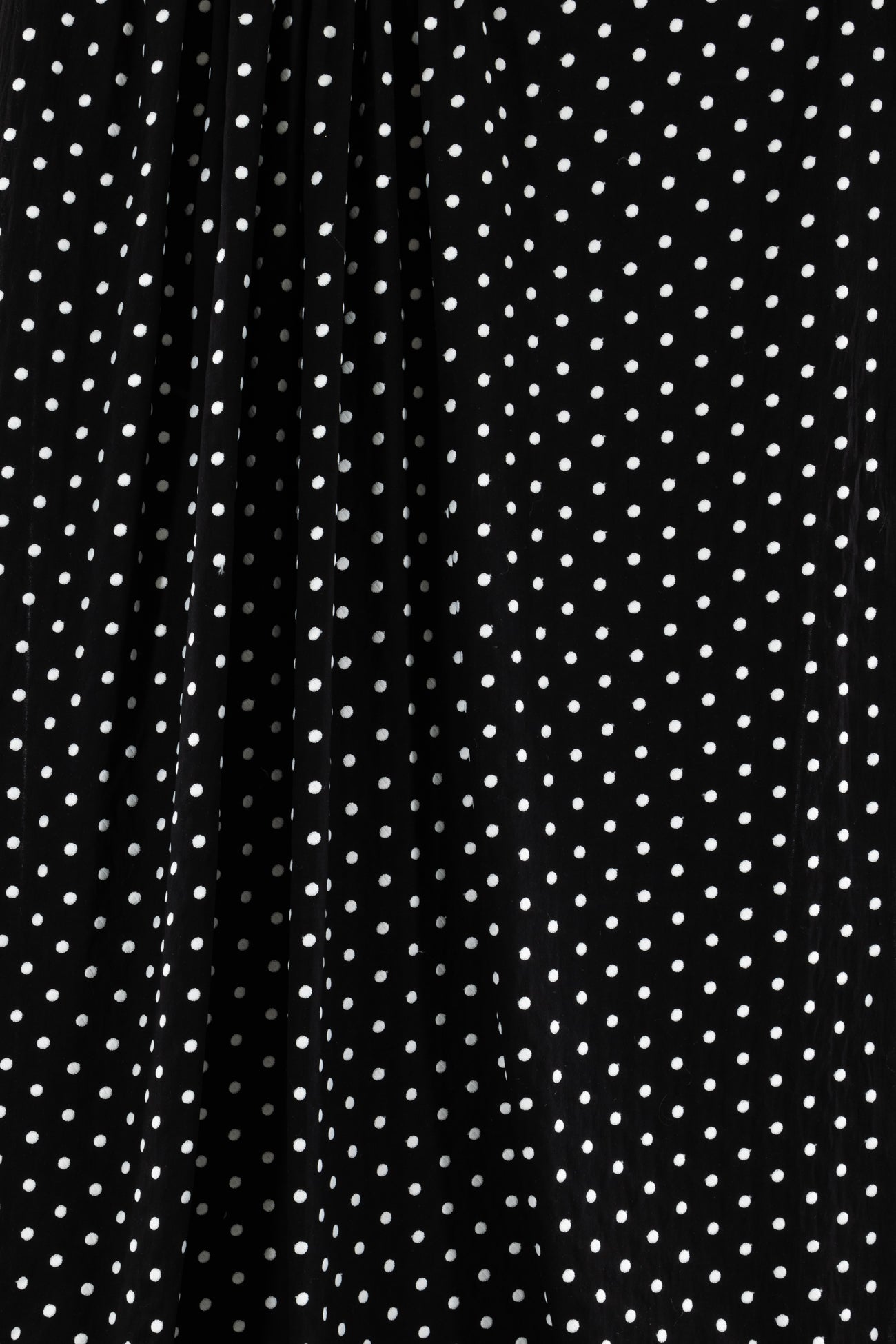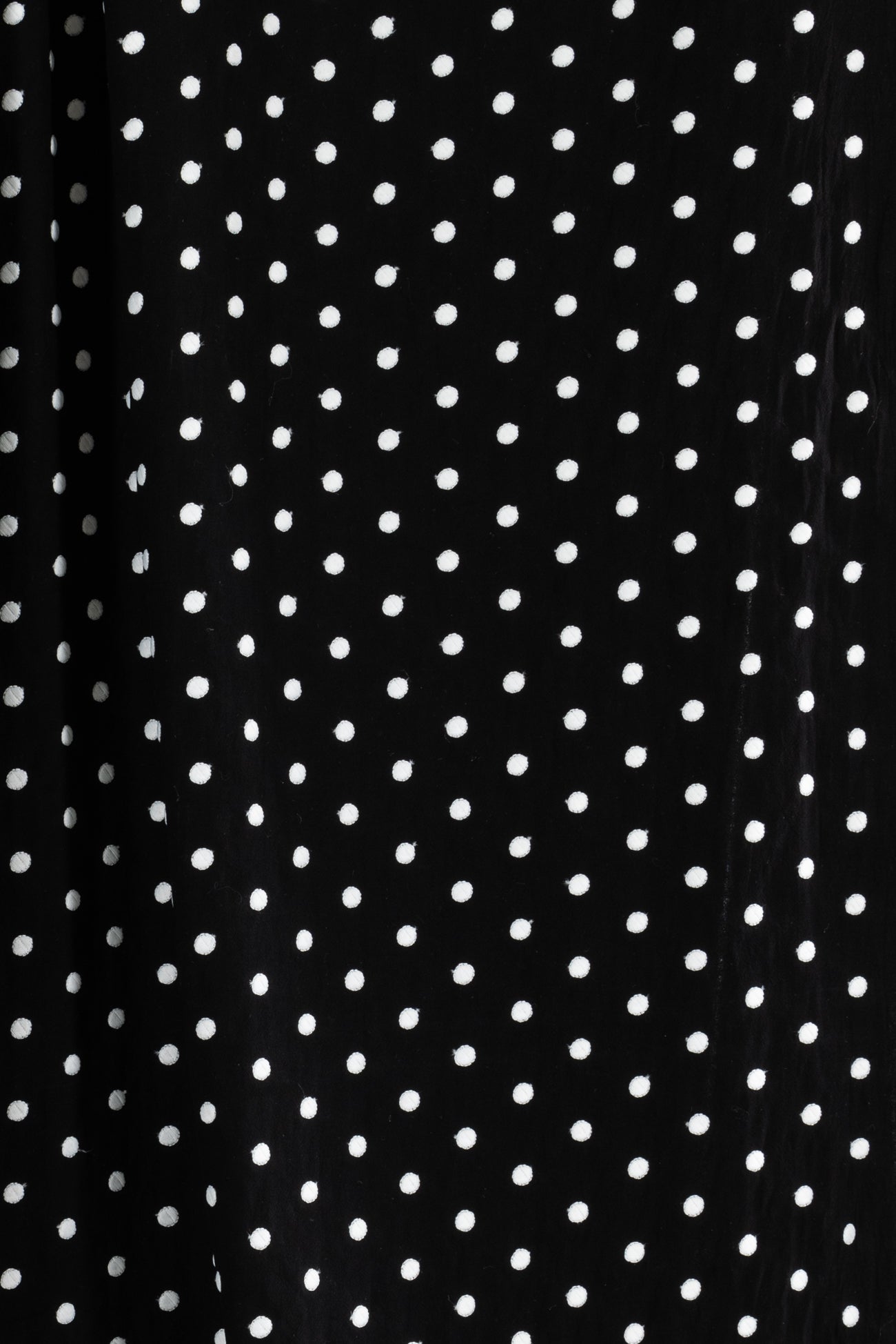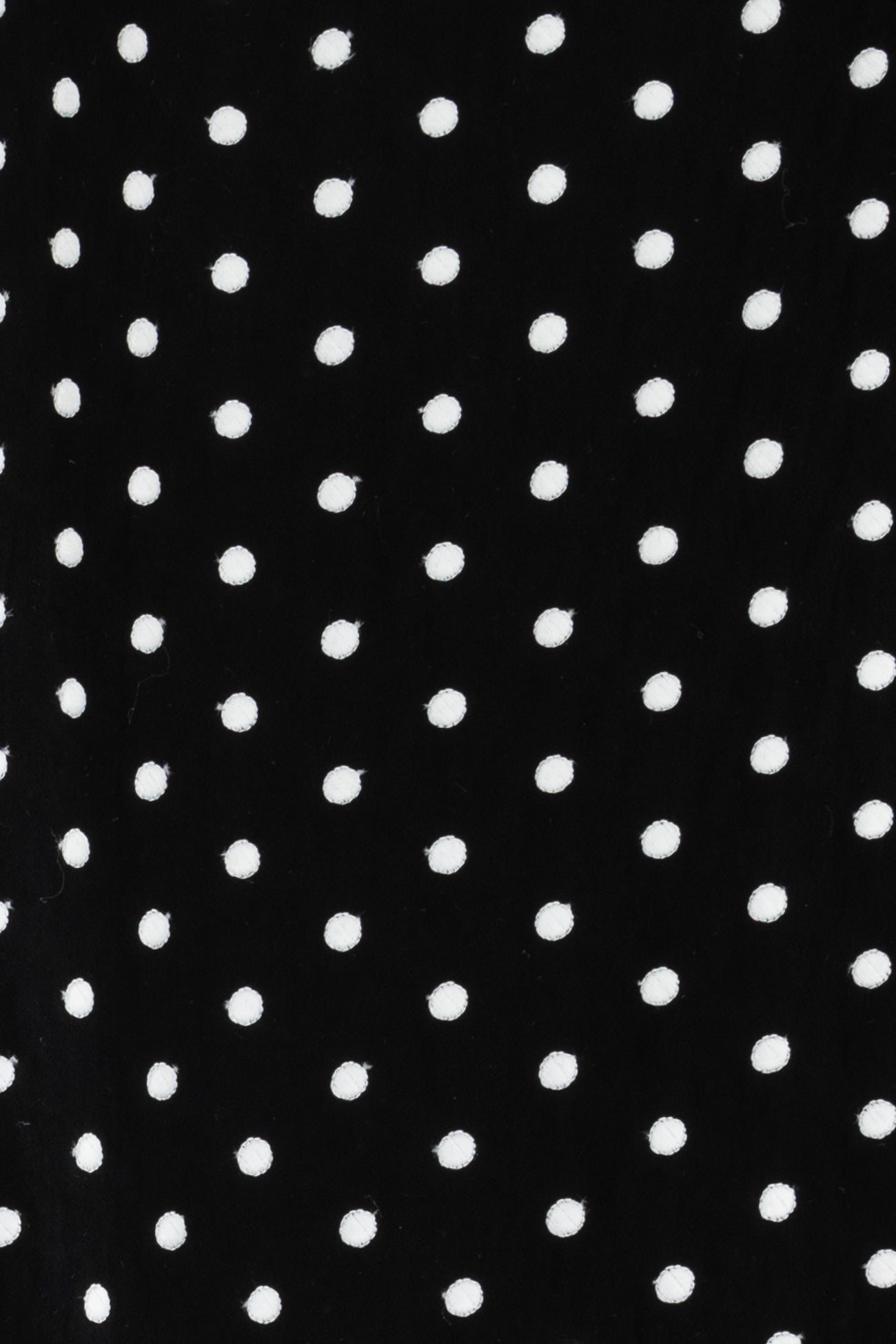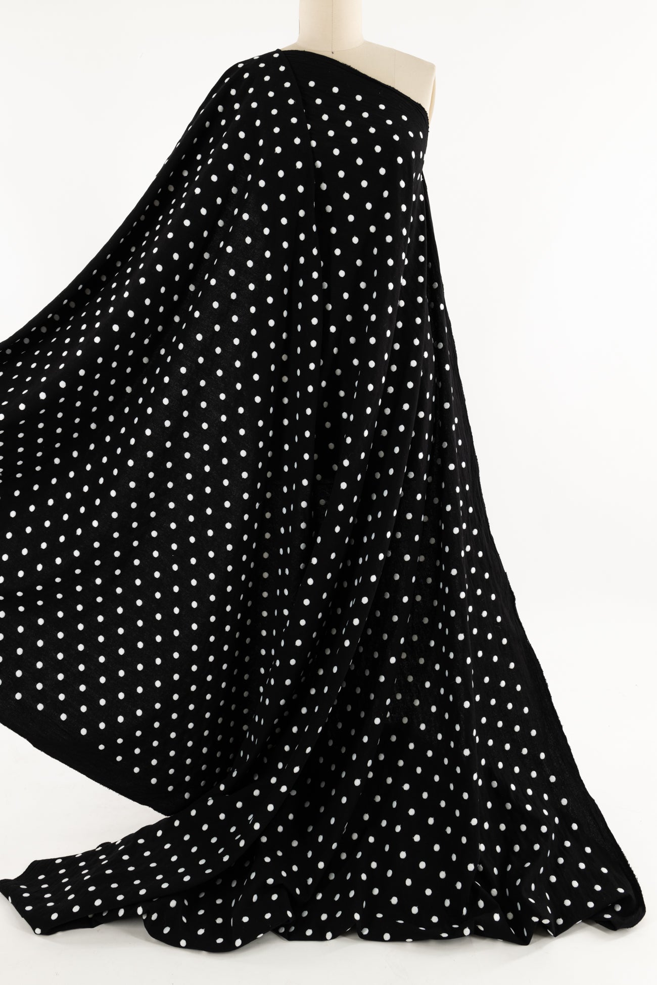 Deep black cotton embroidered all over with softly dimensional white dots. Deadstock from an Italian mill. Light/mid-weight cotton is opaque, with a lightly textured cool matte hand, soft embroidered dots, a 1½" repeat and light drape. Right for a shirt, top, tunic, dress, caftan, kimono, soft pant, vest, menswear, or children's.