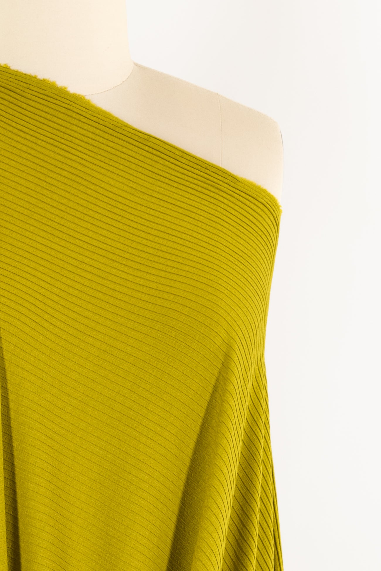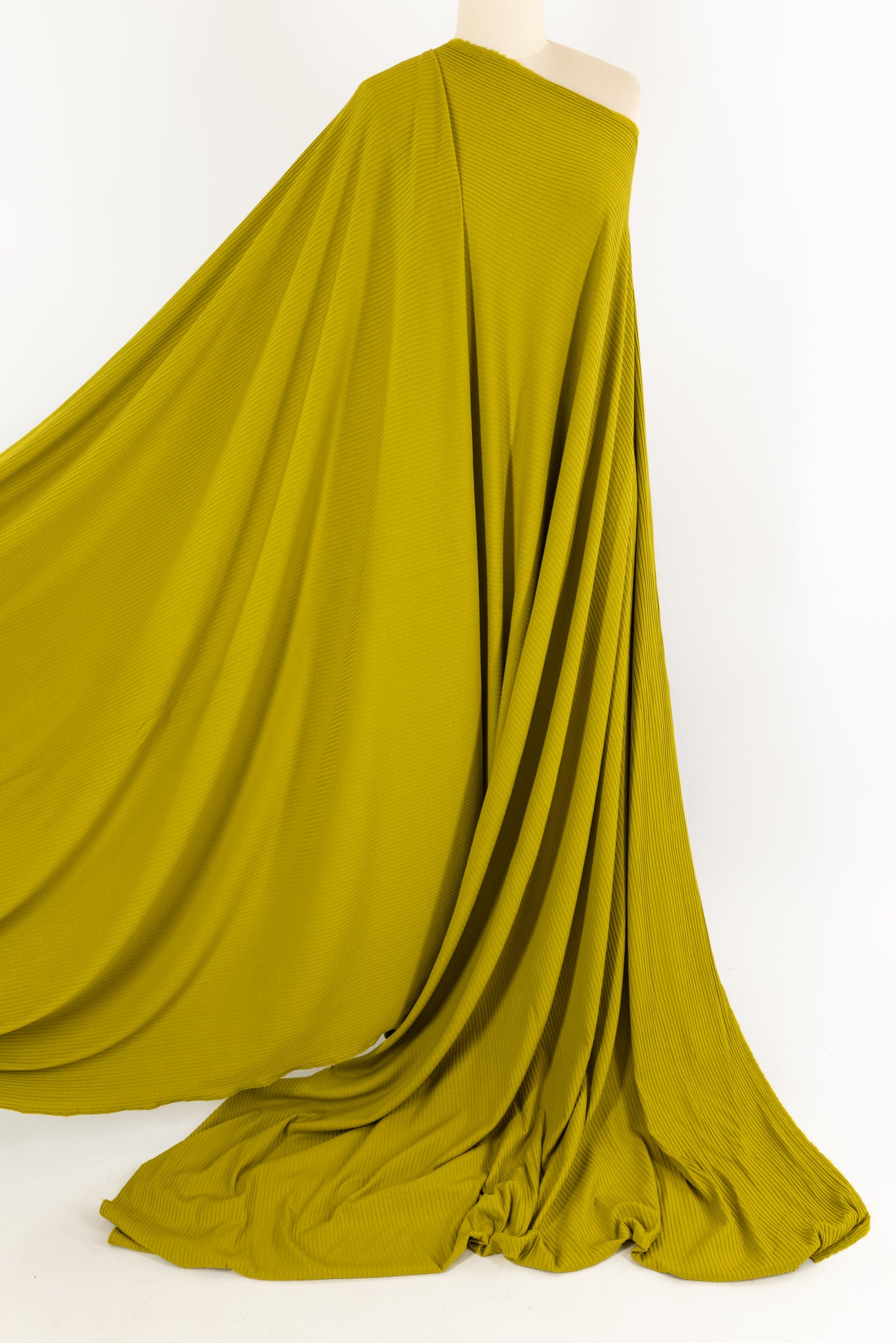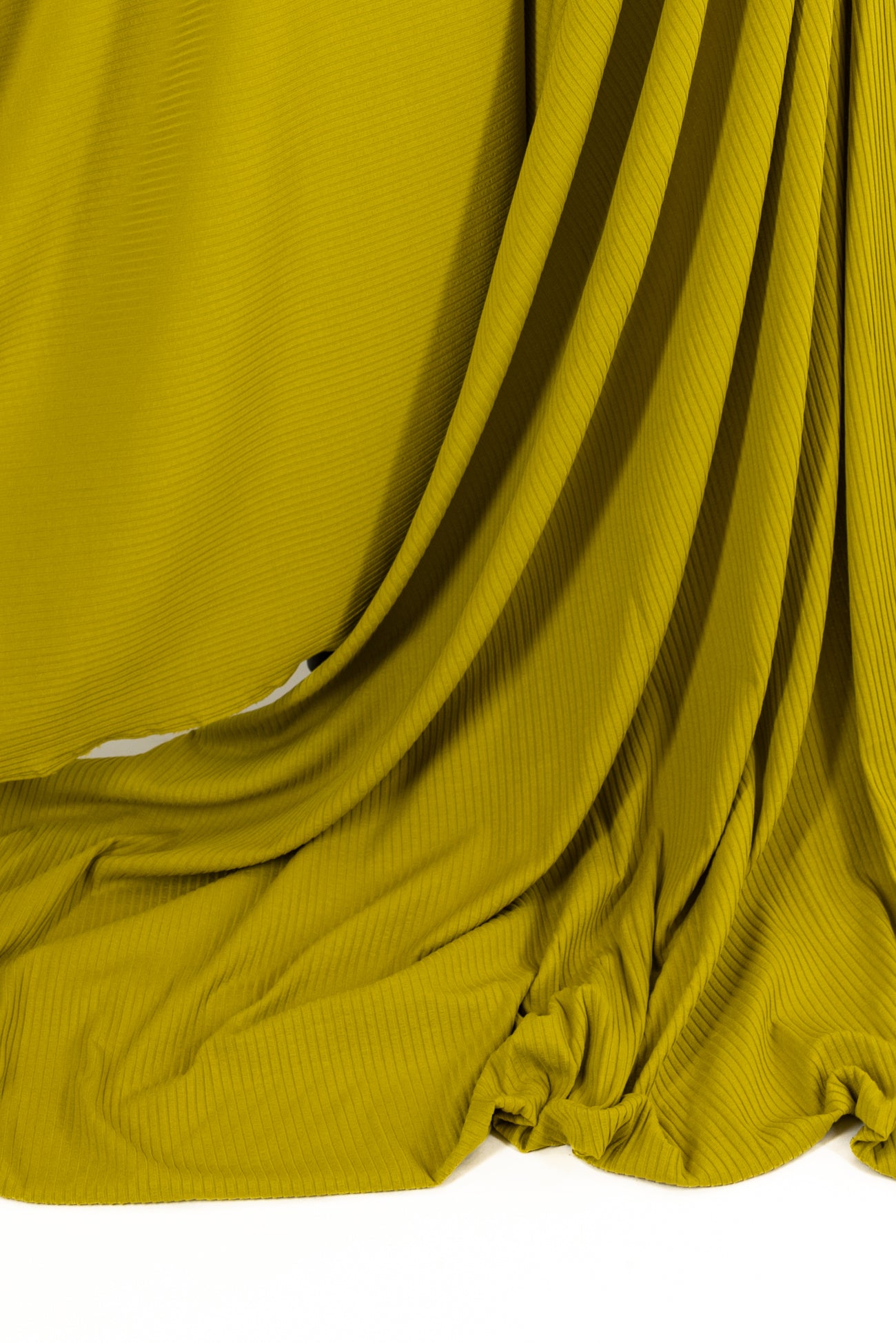 Appealing acid green ribbed knit in a fine quality rayon spandex knit. Mid-weight with a soft malleable drape and hand, 3/16" vertical repeat, 4-way stretch with great recovery and no rolling at the cut edge. It will move on the body without clinging. Great for an on-trend turtleneck, t-shirt, tunic, leggings, a cardi, hoodie, or sweater.