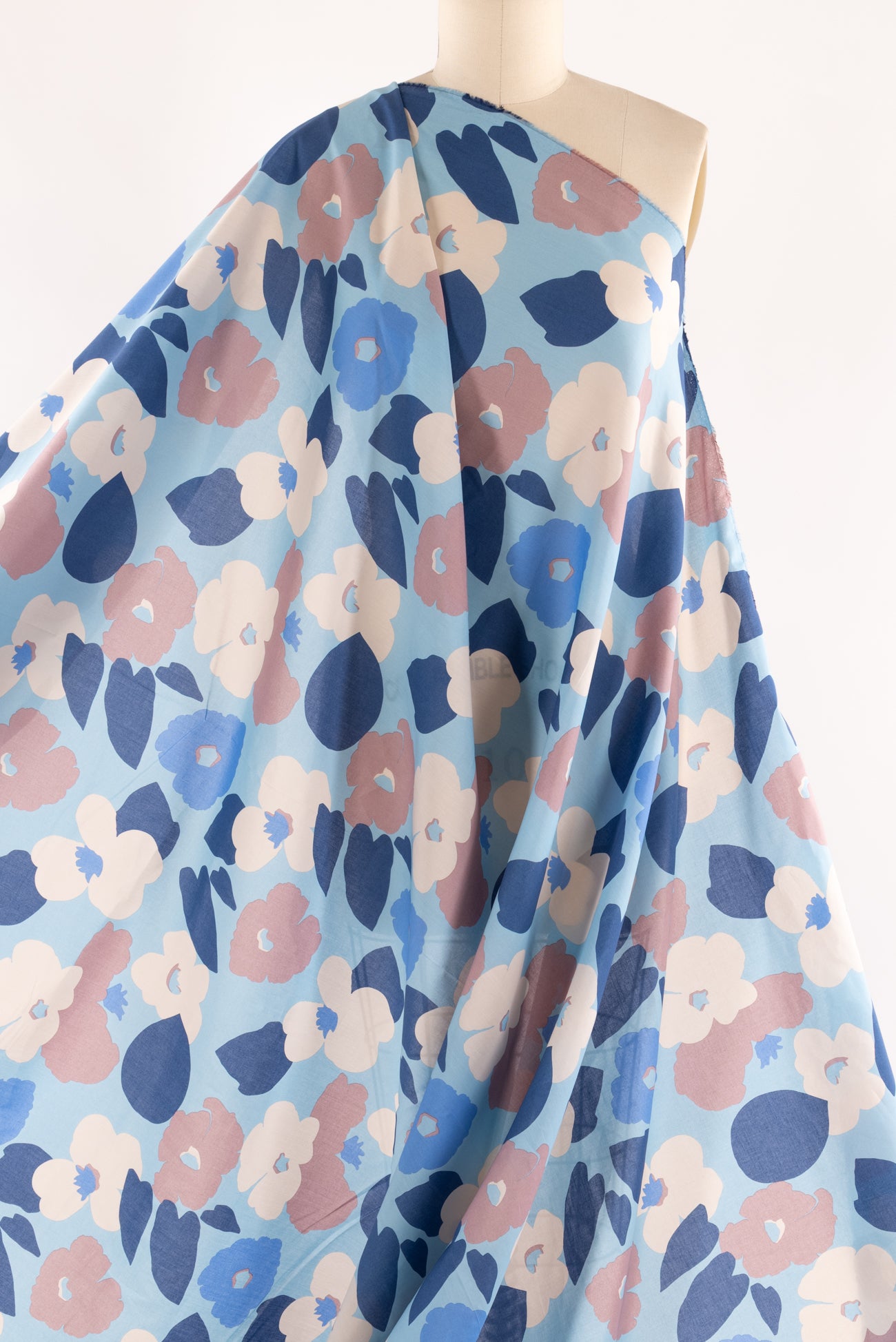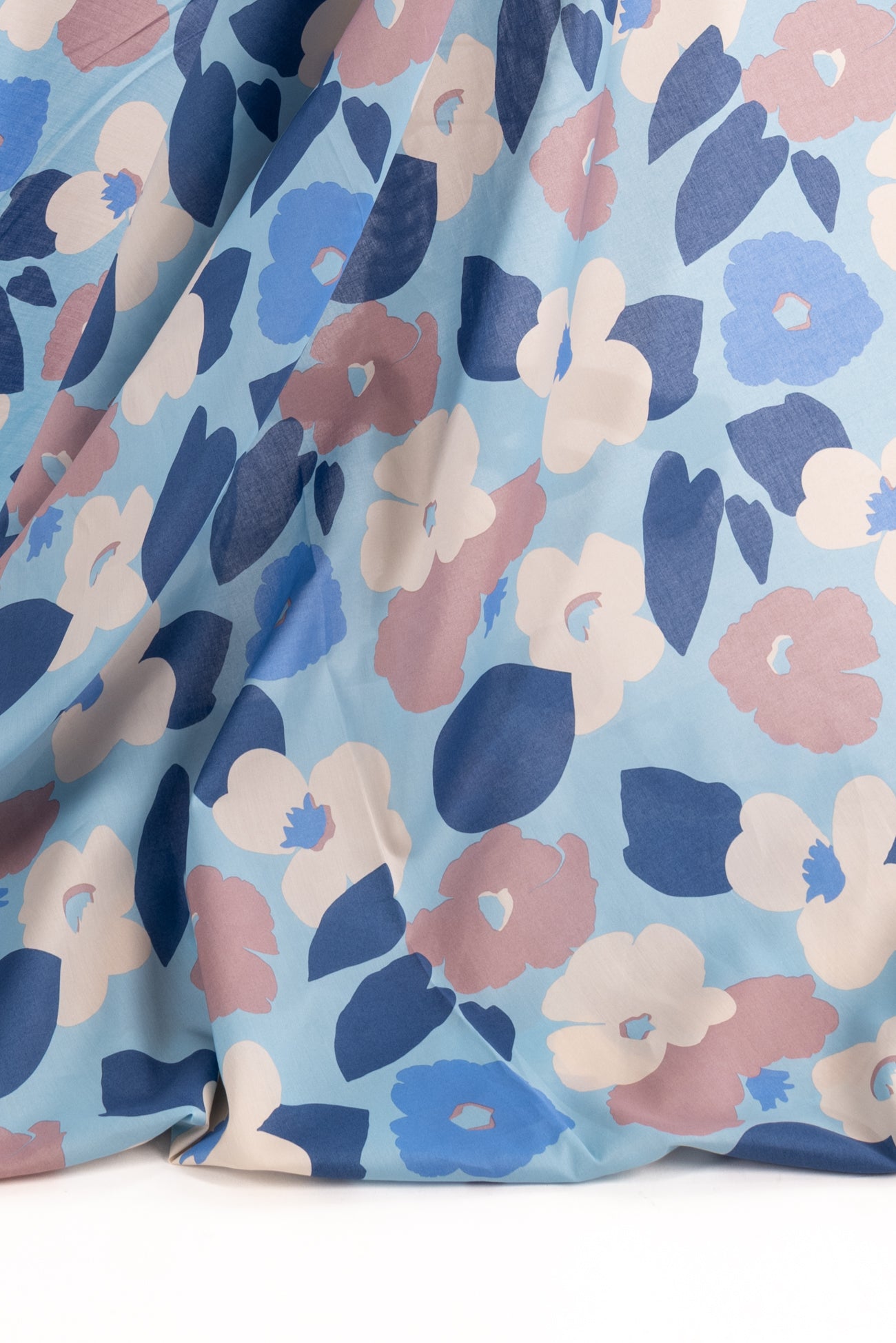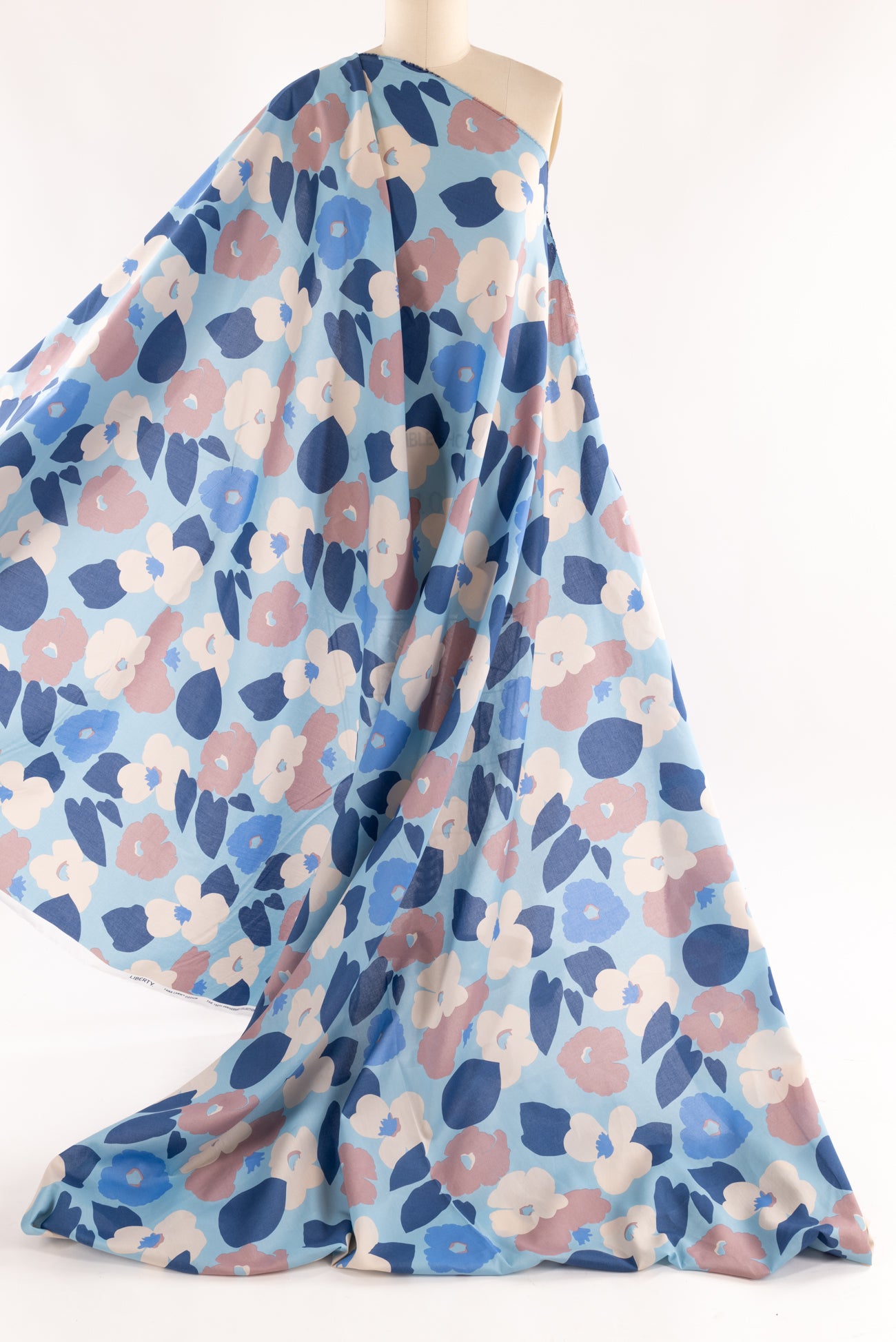 Modern liberty floral in tones of blue, off pink, and ivory on a pale blue background. Deadstock from a NYC designer, produced in Northern Italy for Liberty of London, printed on the renowned and exceptional Tana Lawn, the cotton that behaves and feels like silk. Fine-grained, with a cool, smooth, soft hand, fluid drape, depth of color. Perfect for a shirt, dress, skirt, tunic, soft pant, caftan, loungewear, children or men, accessories or home decor. Right to wear everyday or for statement pieces. OEKO-TEX® certified. One-way design, 8" repeat