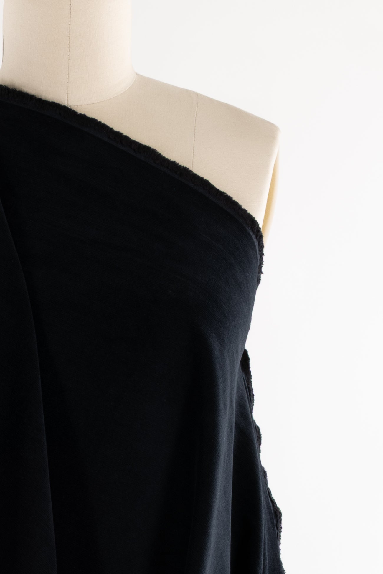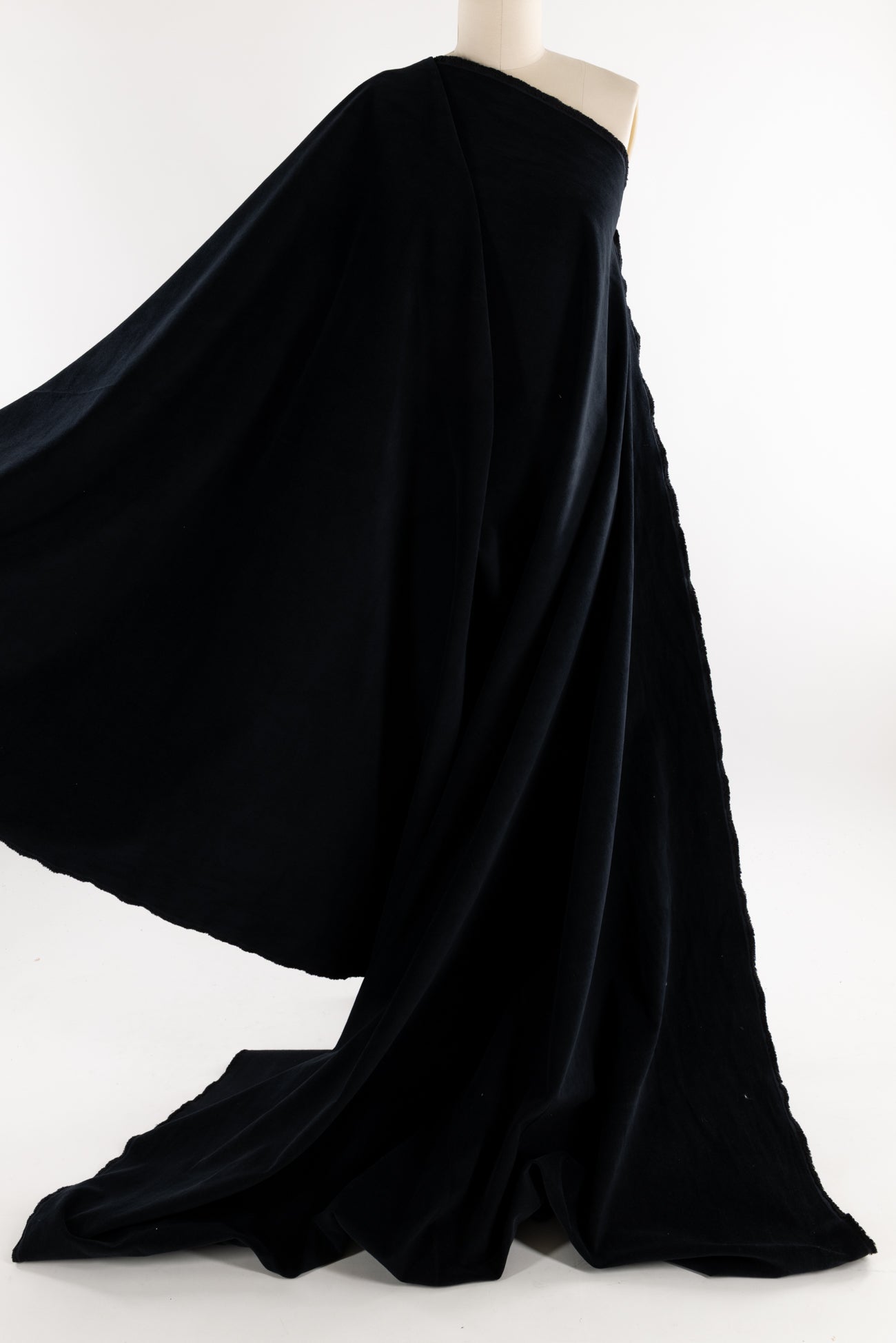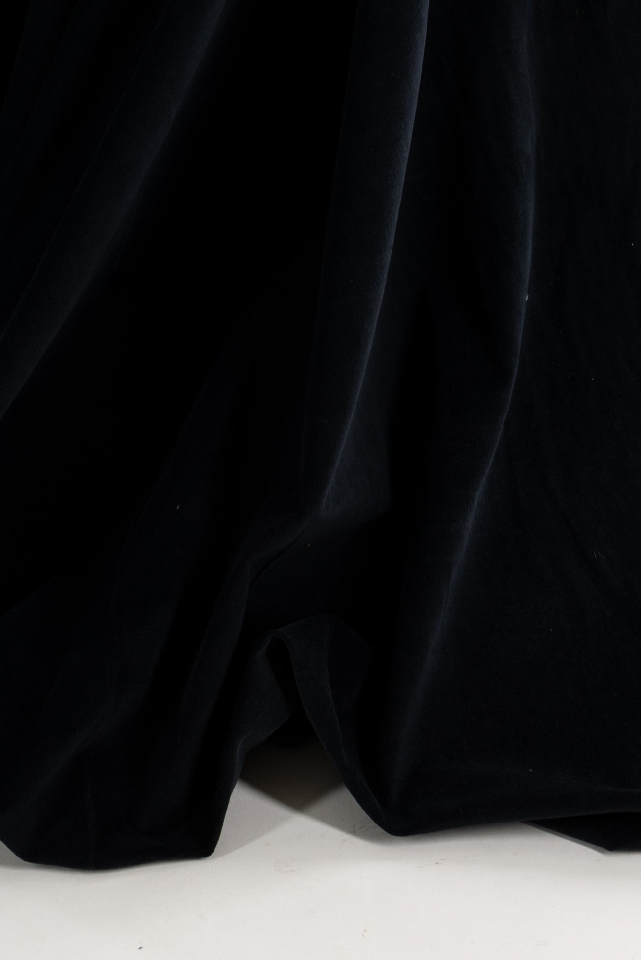 Basic black stretch cotton corduroy, fine quality deadstock from an LA designer. Mid-weight, lightly ribbed with a malleable soft drape, good crosswise stretch and recovery. Right for a jacket, vest, dress, skirt, pants, or jumpsuit.