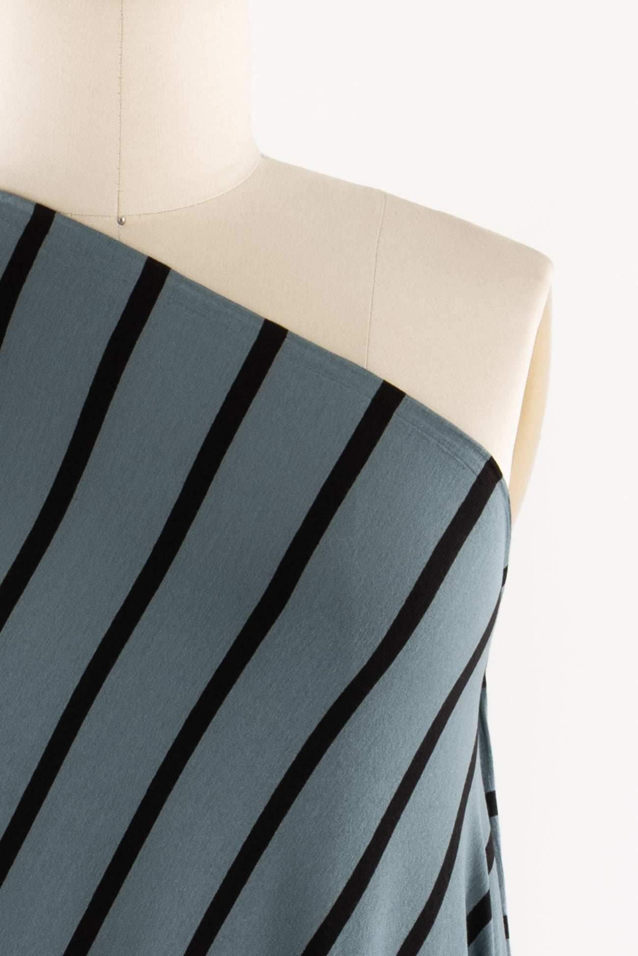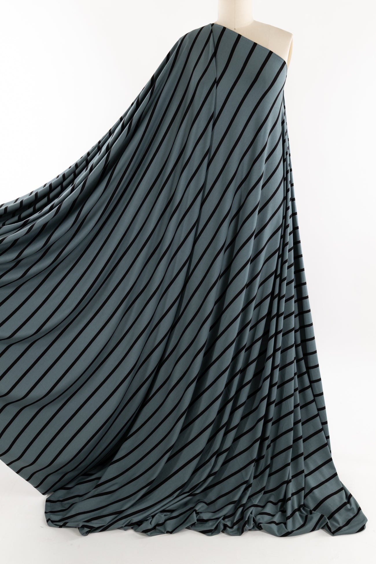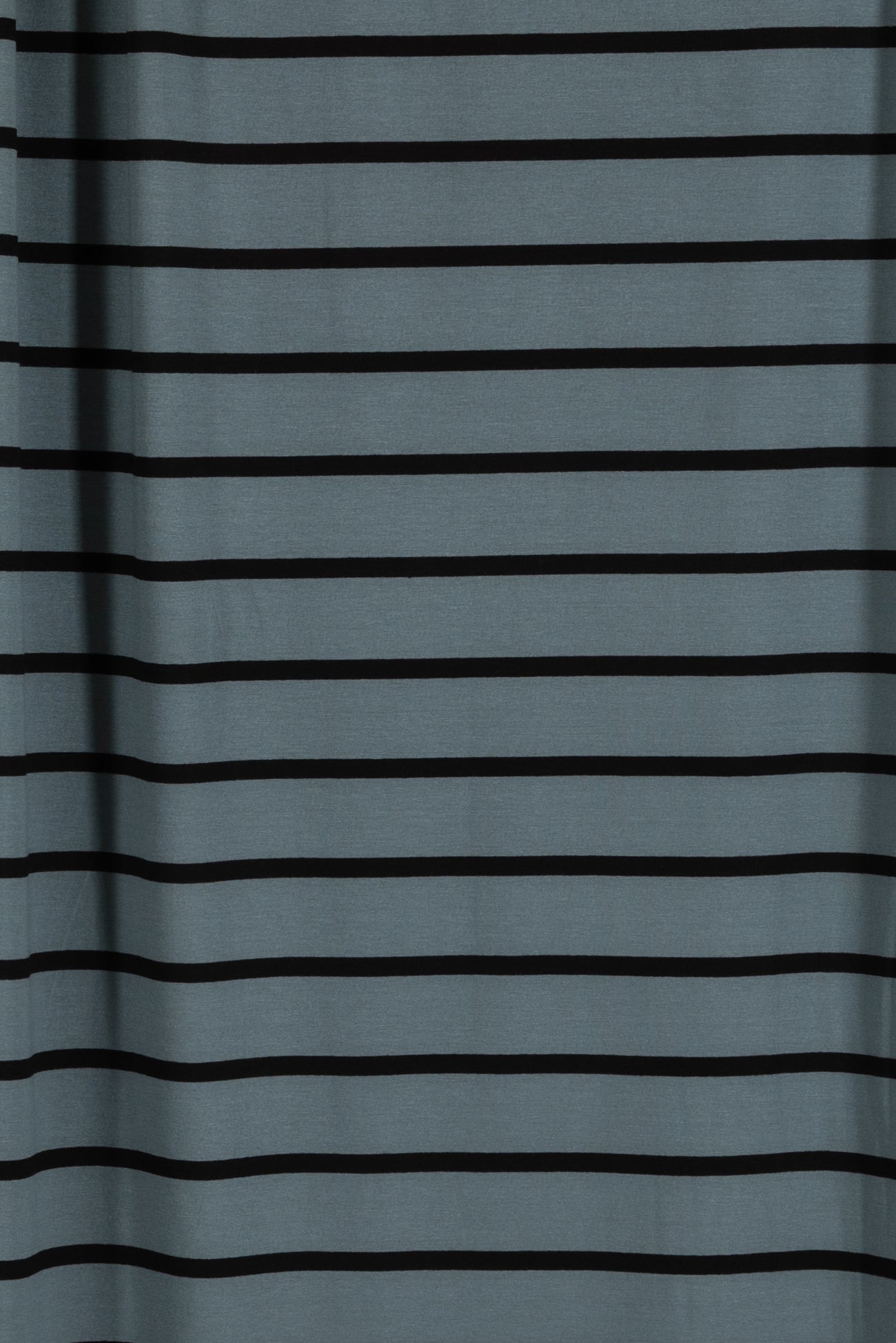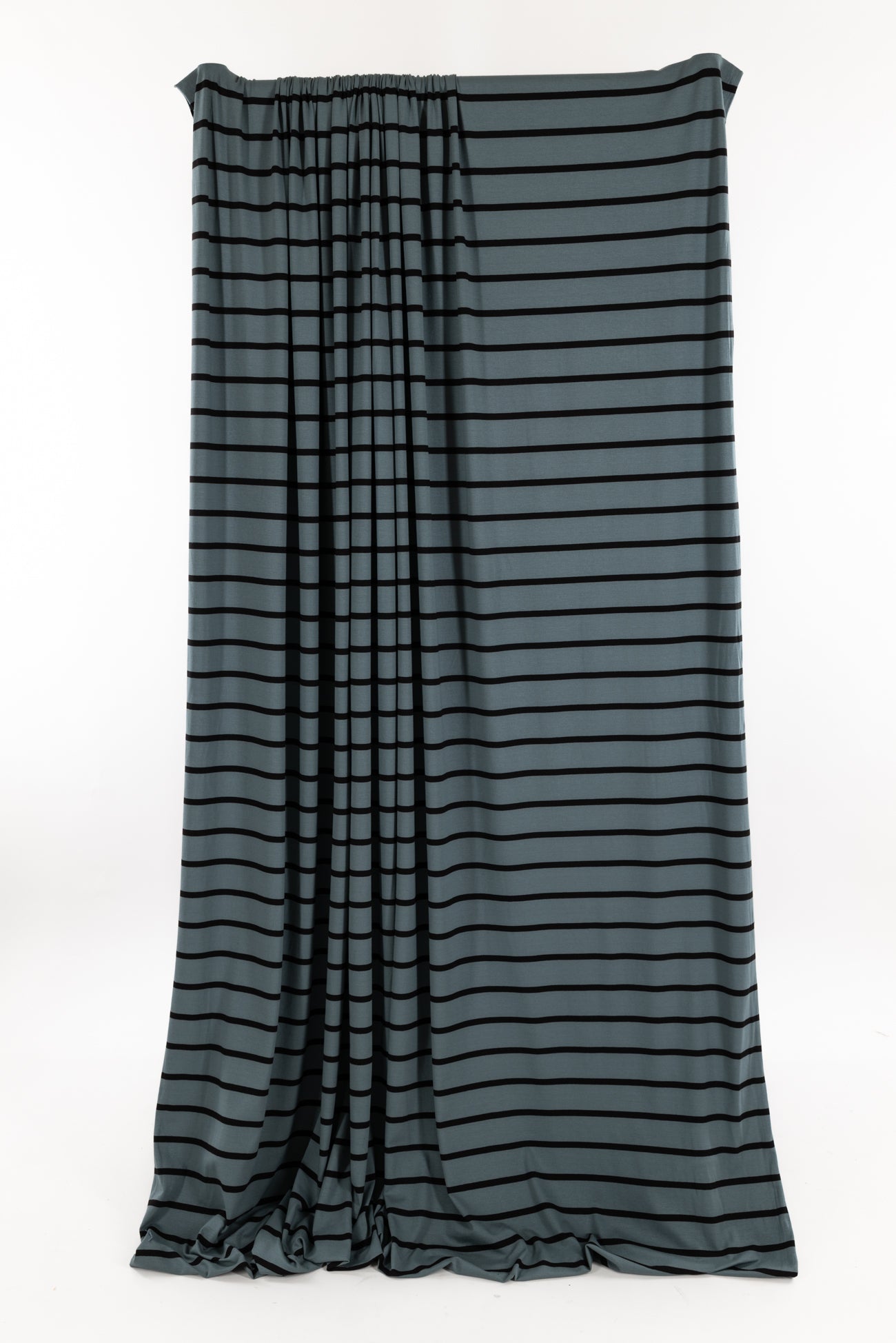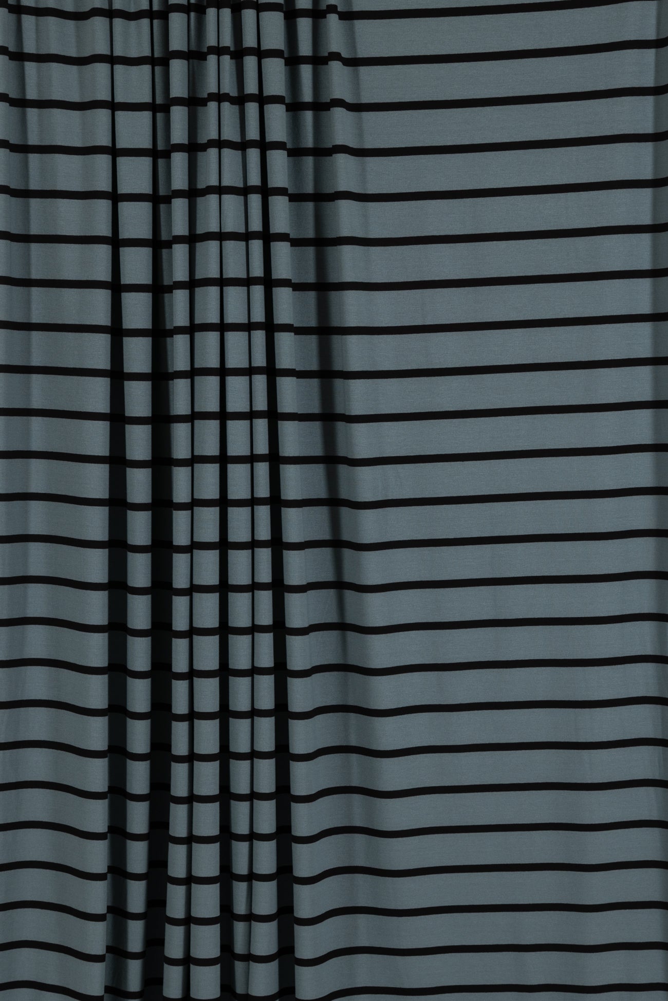 Splendid stripes in dusty blue and black in a gorgeous knit. Manufactured in the USA, this is a perfect light/mid-weight jersey with enough substance and stability to skim the body in the most flattering way. Opaque, with 4-way stretch, 5/16" black stripes, 1-5/16" dusty blue stripes, and some rolling at the cut edge. A beautiful knit with a soft hand and drape and a smooth matte finish. Just right for t-shirts, tunics, dresses, soft pants, leggings, a cardi, skirt, men's, or children's. Also great for trims, bindings, and contrast pieces.
