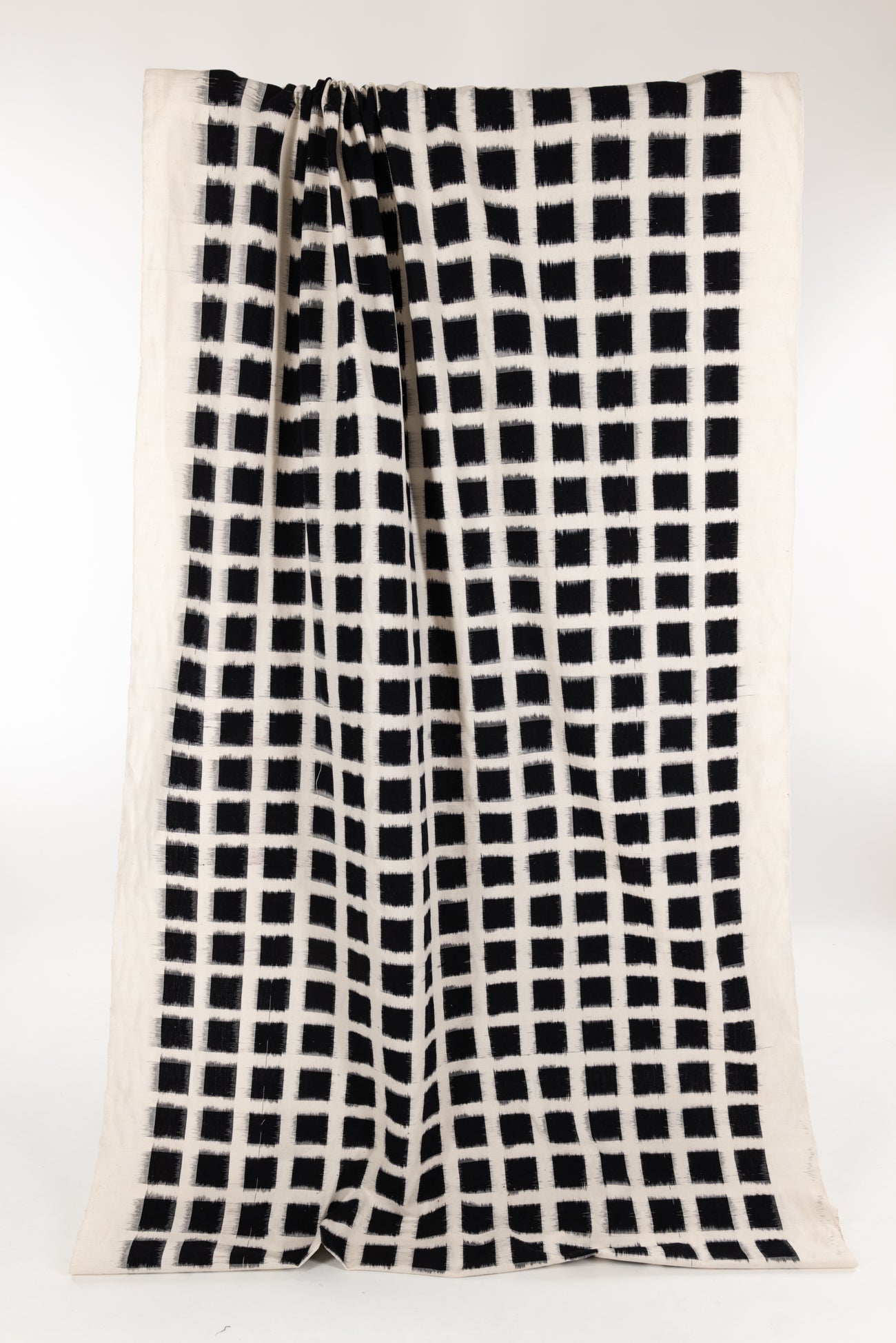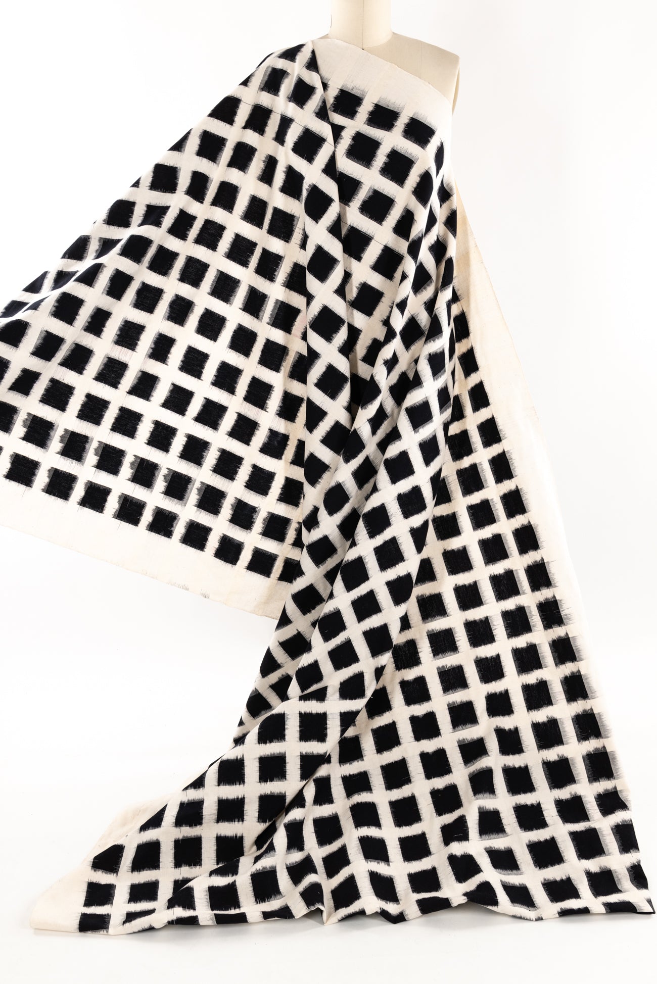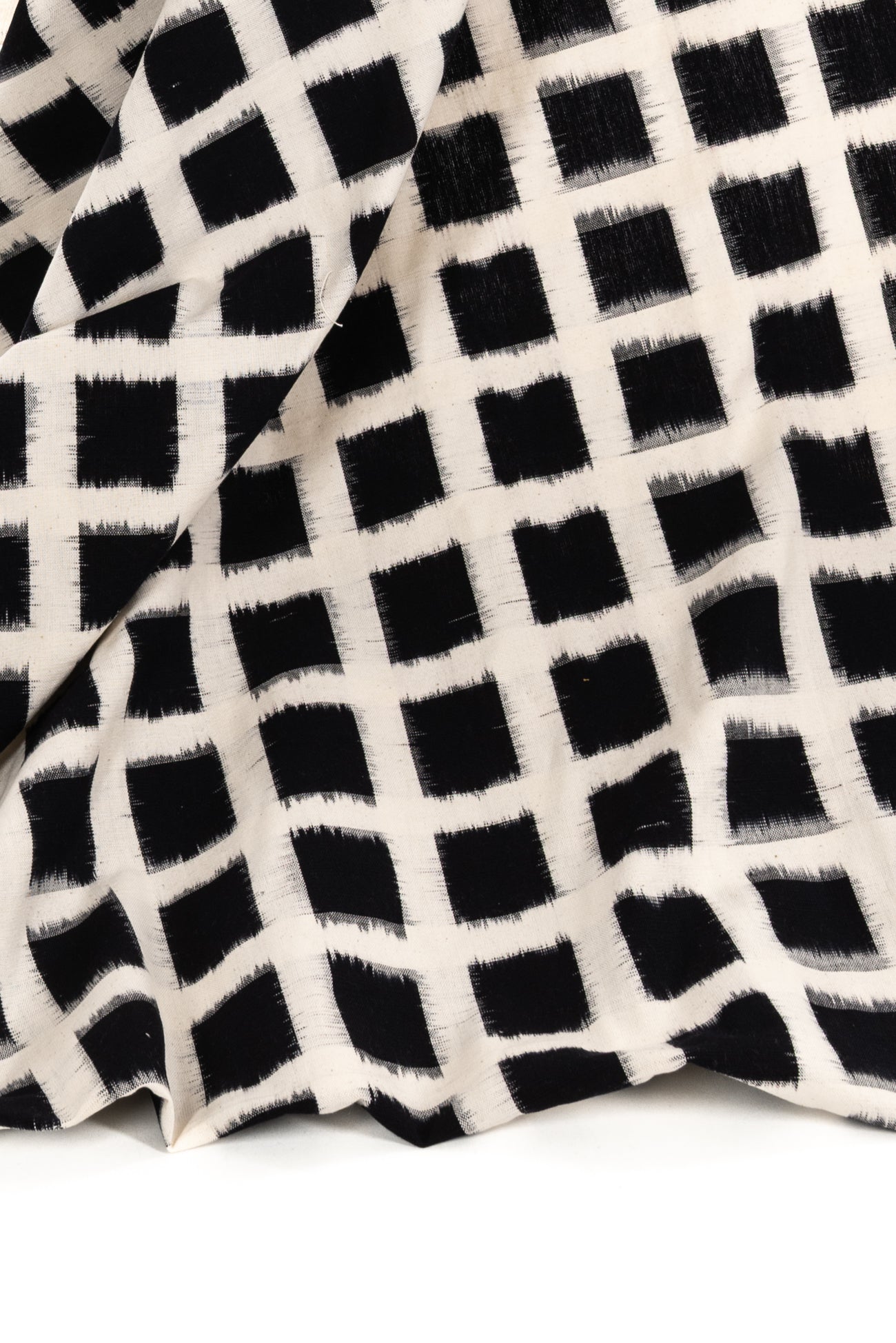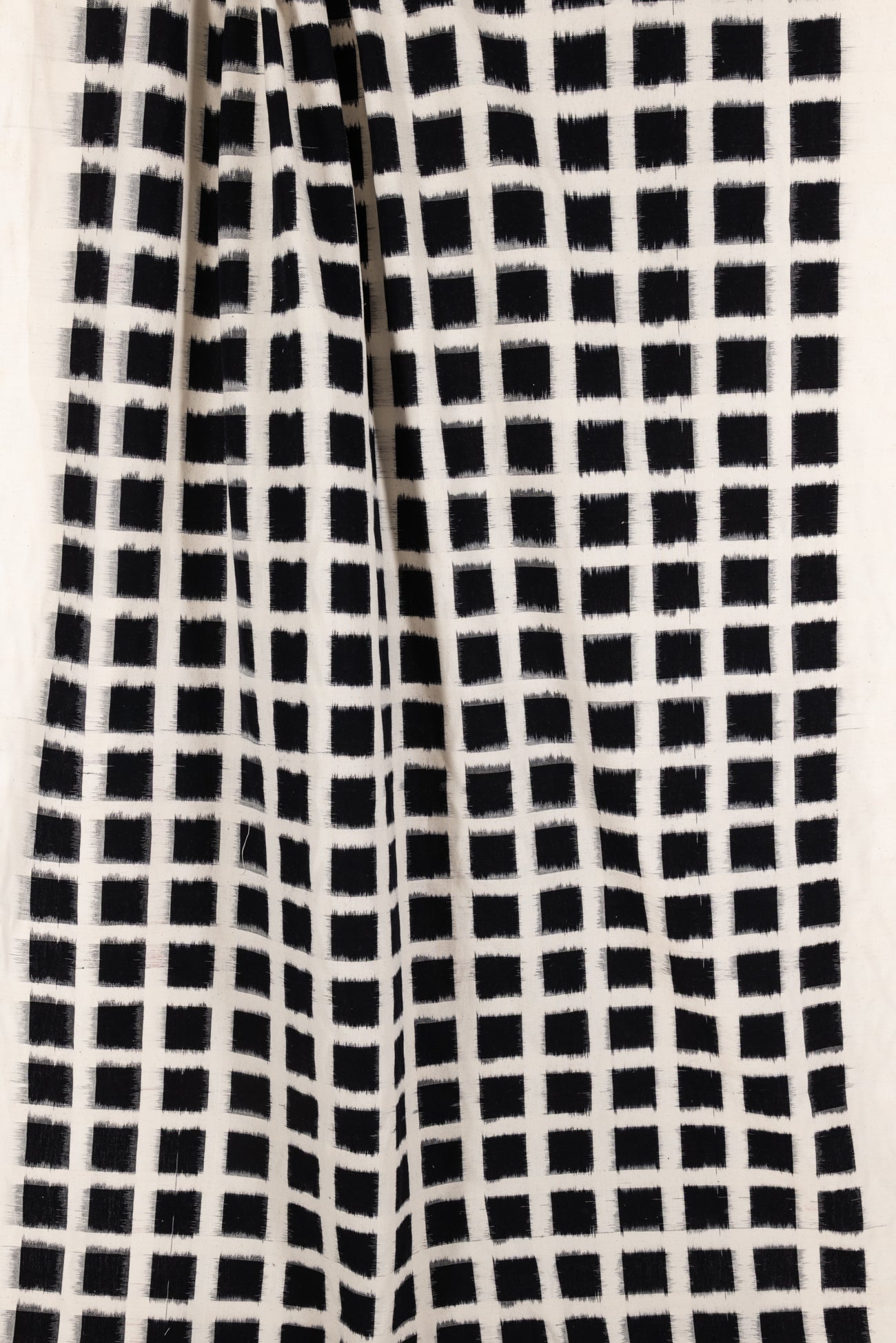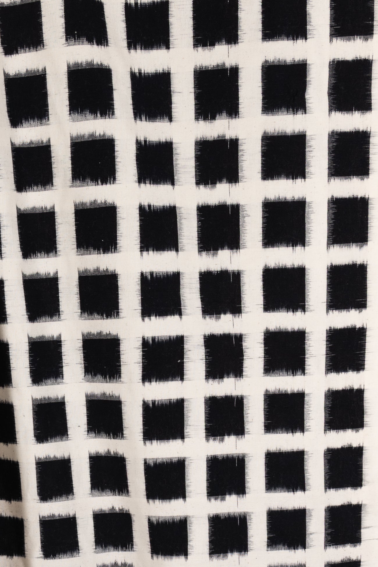 A grid of black on warm white double ikat squares in a hand-woven cotton from India that is naturally blurry in a charming way. Some of the most interesting and soulful fabrics are coming out of India today where textile traditions continue. Double Ikat is a technique in which both warp and the weft are resist-dyed prior to weaving, so it it is the most difficult to make and more expensive to produce. Light weight, opaque with a lightly textured appealing cool hand, and airy drape. The weight is right for a tunic, shirt, light jacket, vest, dress, skirt, caftan or soft pants.