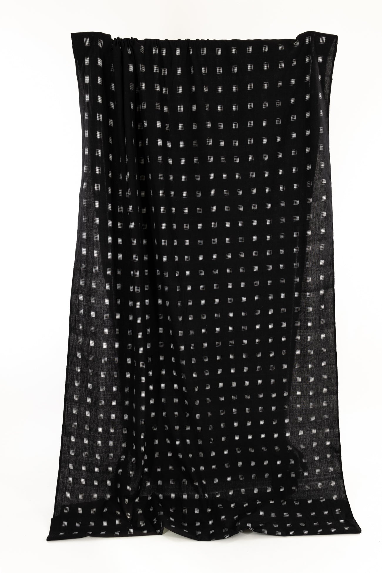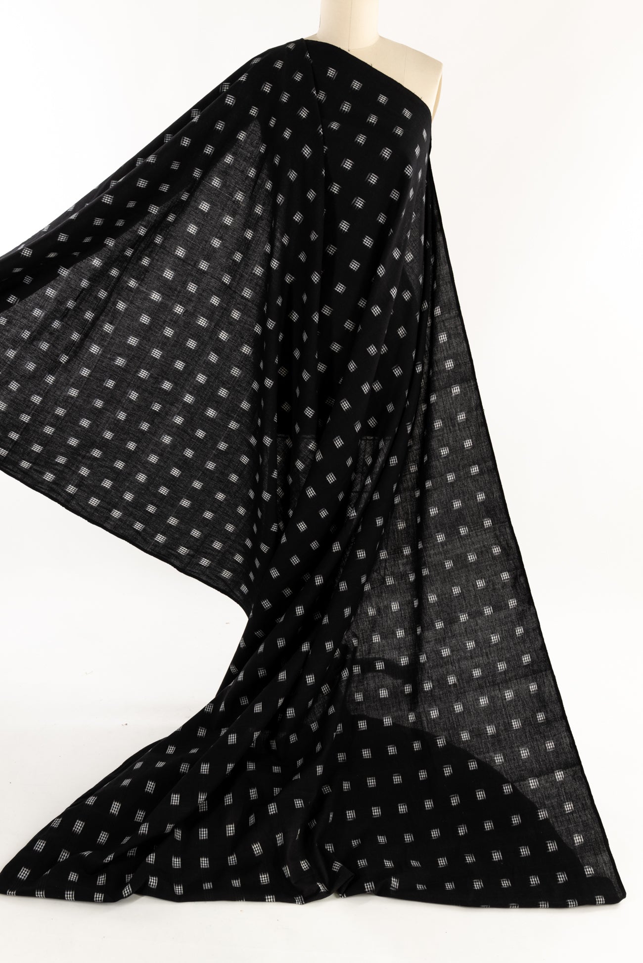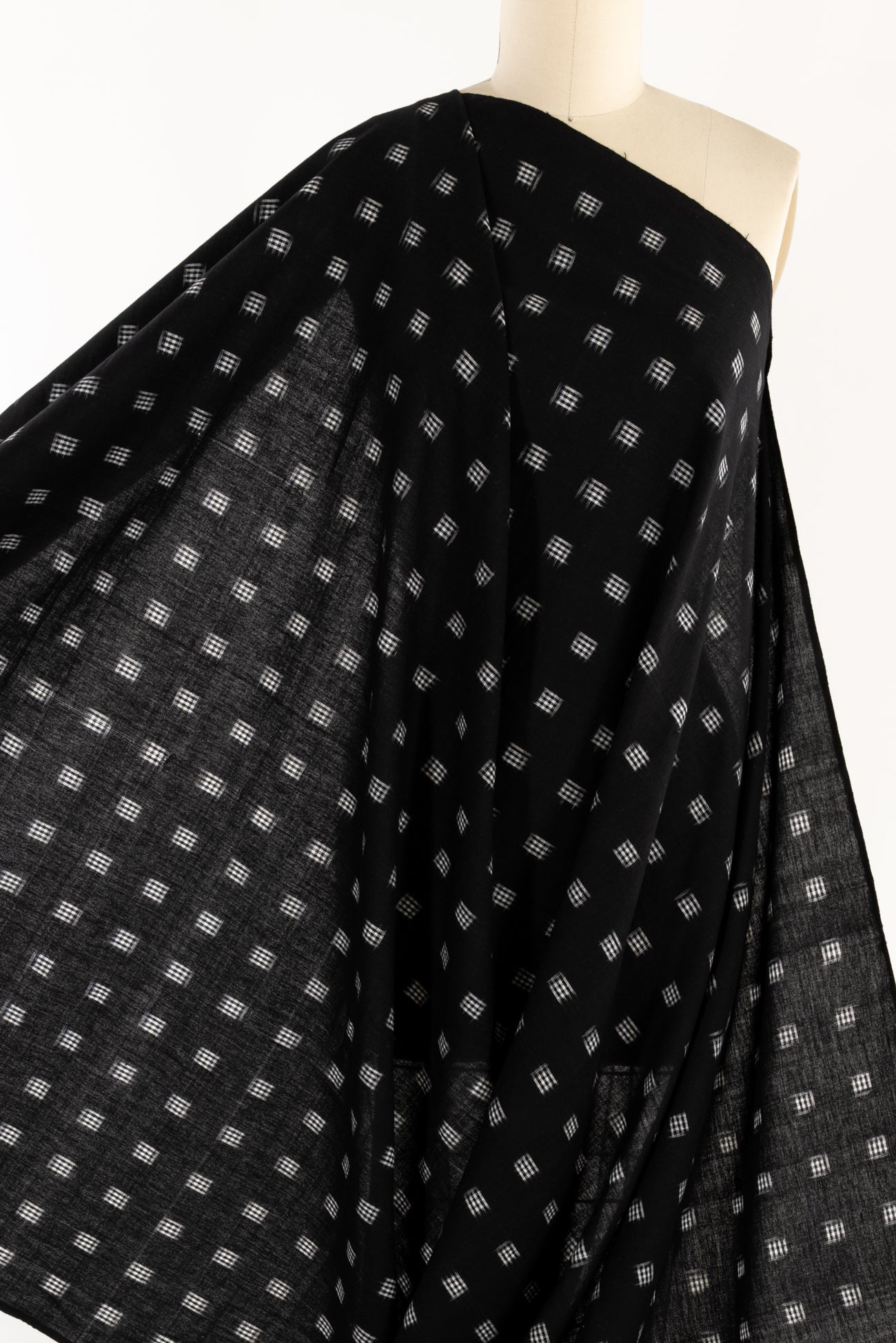 Black and white small double ikat checkered squares in a hand-woven cotton from India that is naturally blurry in a charming way. Some of the most interesting and soulful fabrics are coming out of India today where textile traditions continue. Double Ikat is a technique in which both warp and the weft are resist-dyed prior to weaving, so it it is the most difficult to make and more expensive to produce. Light weight, opaque with a lightly textured appealing cool hand, and airy drape. The weight is right for a tunic, shirt, light jacket, vest, dress, skirt, caftan or soft pants.