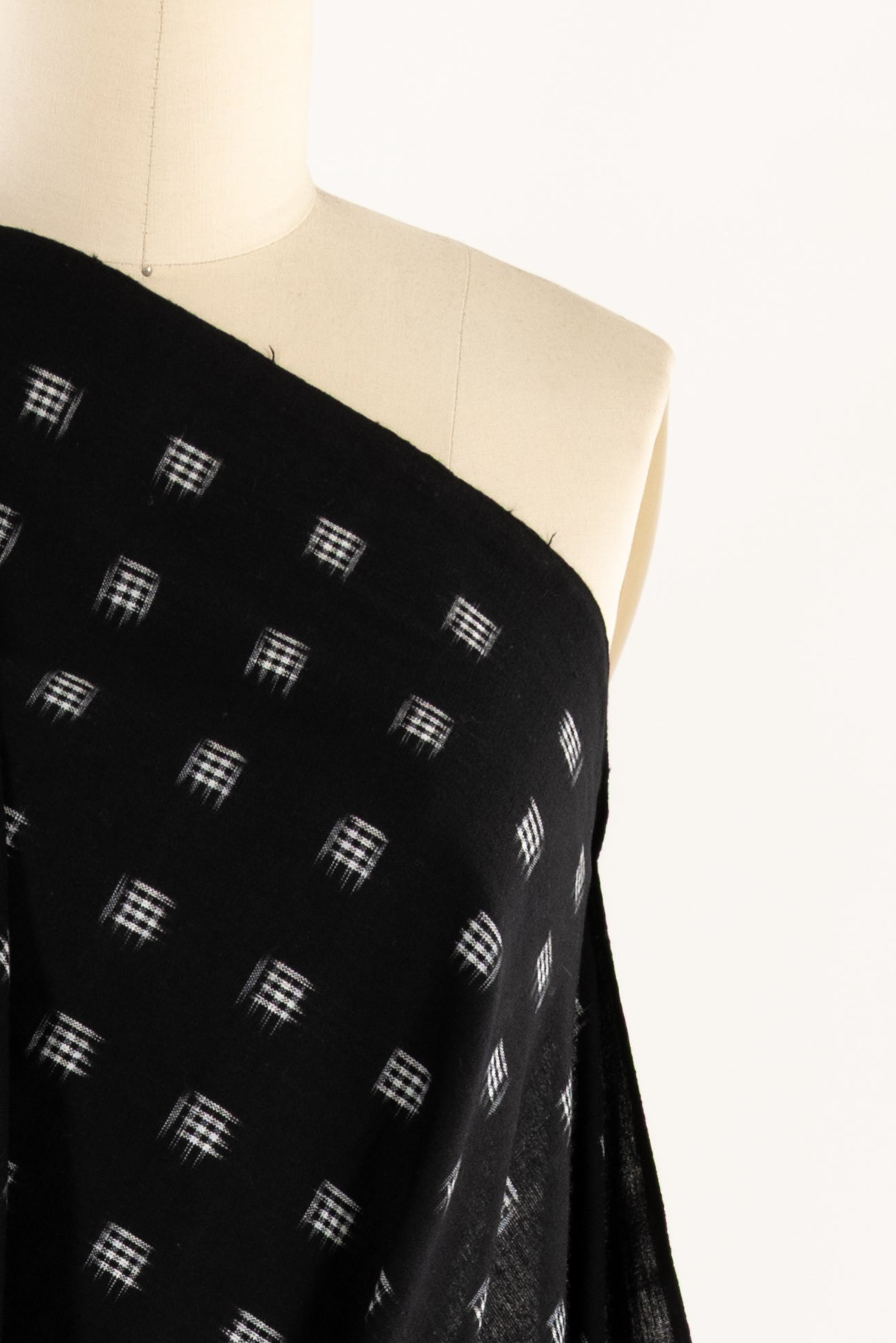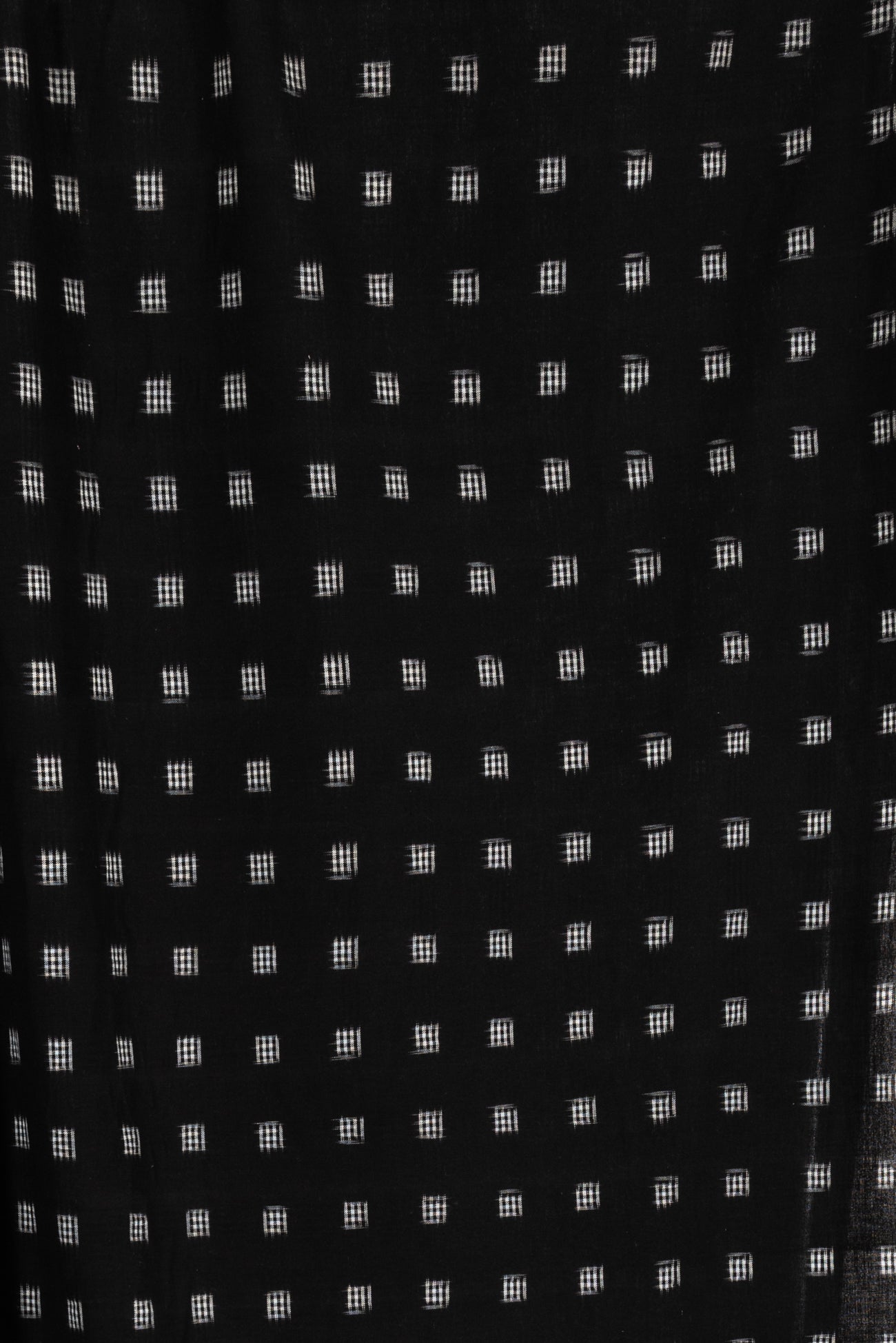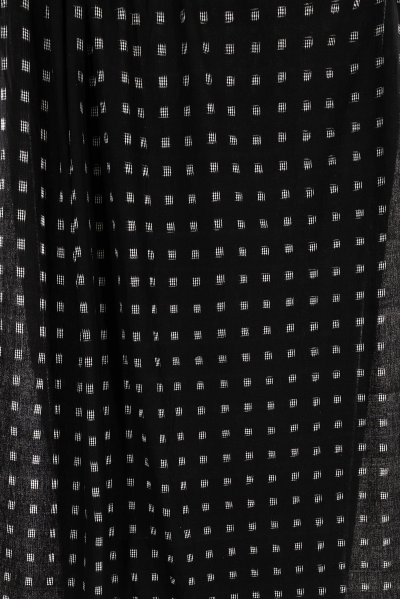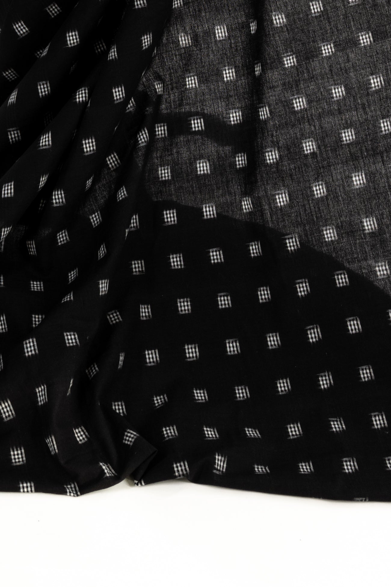 Black and white small double ikat checkered squares in a hand-woven cotton from India that is naturally blurry in a charming way. Some of the most interesting and soulful fabrics are coming out of India today where textile traditions continue. Double Ikat is a technique in which both warp and the weft are resist-dyed prior to weaving, so it it is the most difficult to make and more expensive to produce. Light weight, opaque with a lightly textured appealing cool hand, and airy drape. The weight is right for a tunic, shirt, light jacket, vest, dress, skirt, caftan or soft pants.