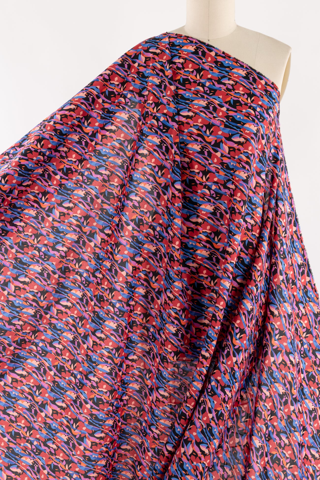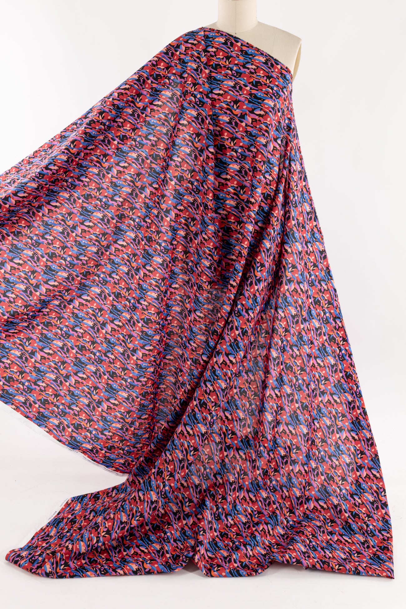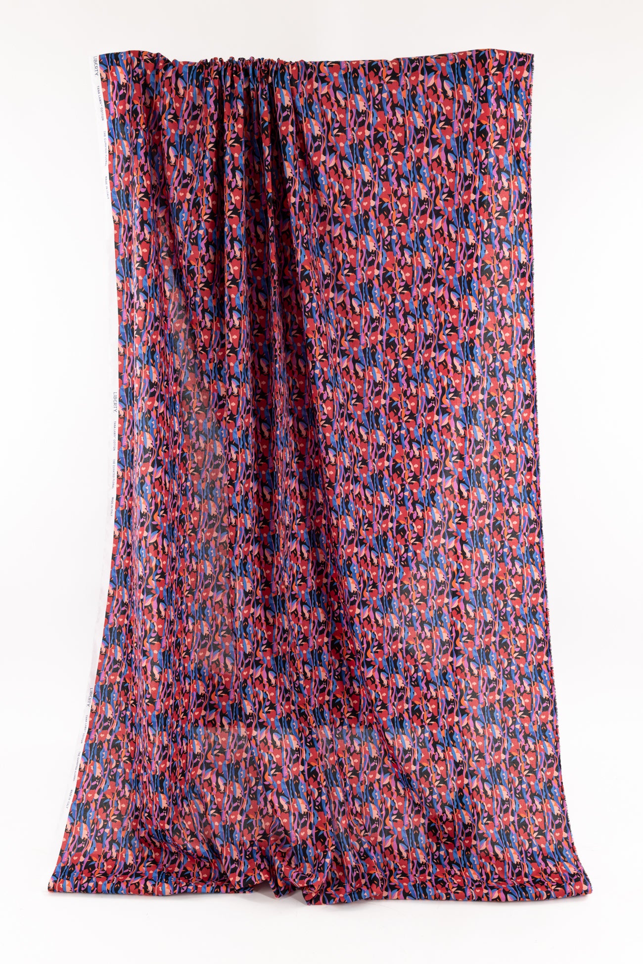 Modern Liberty floral in red, magenta, pink, and blue on a soft black background. Deadstock from a NYC designer, produced in Northern Italy for Liberty of London, printed on the renowned and exceptional Tana Lawn, the cotton that behaves and feels like silk. Fine-grained, with a cool, smooth, soft hand, fluid drape, depth of color. Perfect for a shirt, dress, skirt, tunic, soft pant, caftan, loungewear, children or men, accessories or home decor. Right to wear everyday or for statement pieces. OEKO-TEX® certified. One-way design, 5" repeat. Limited quantity.