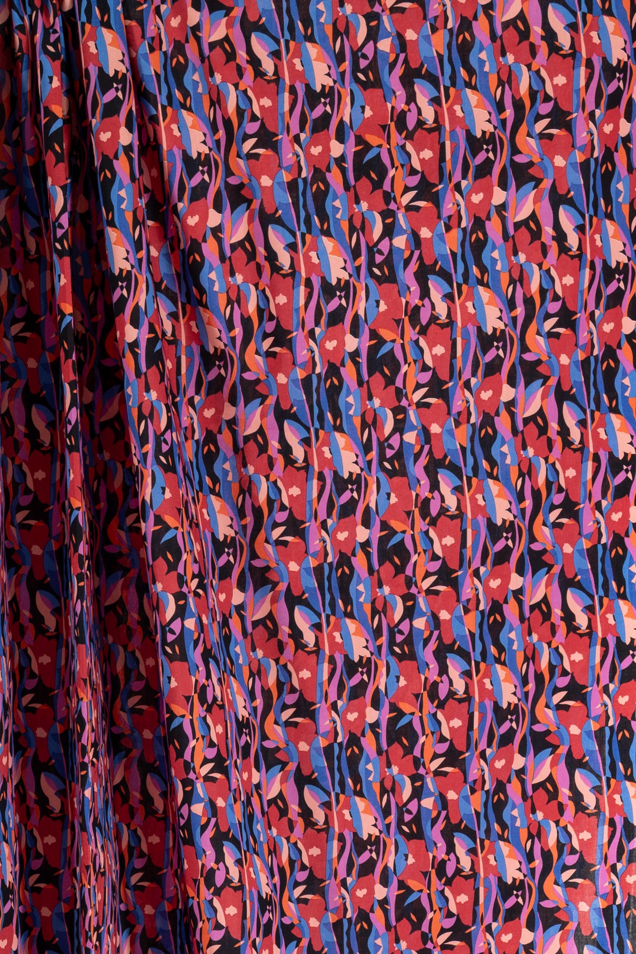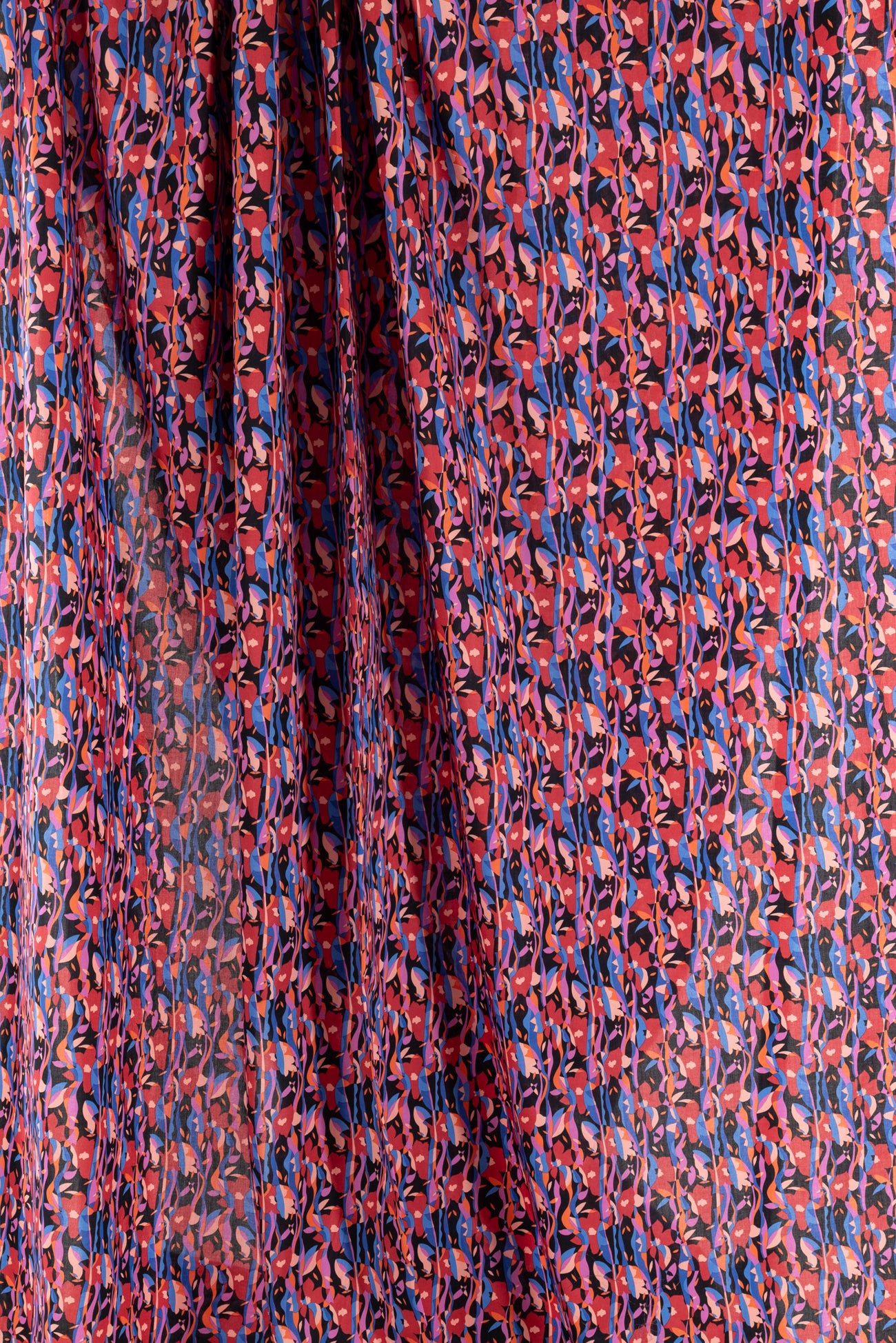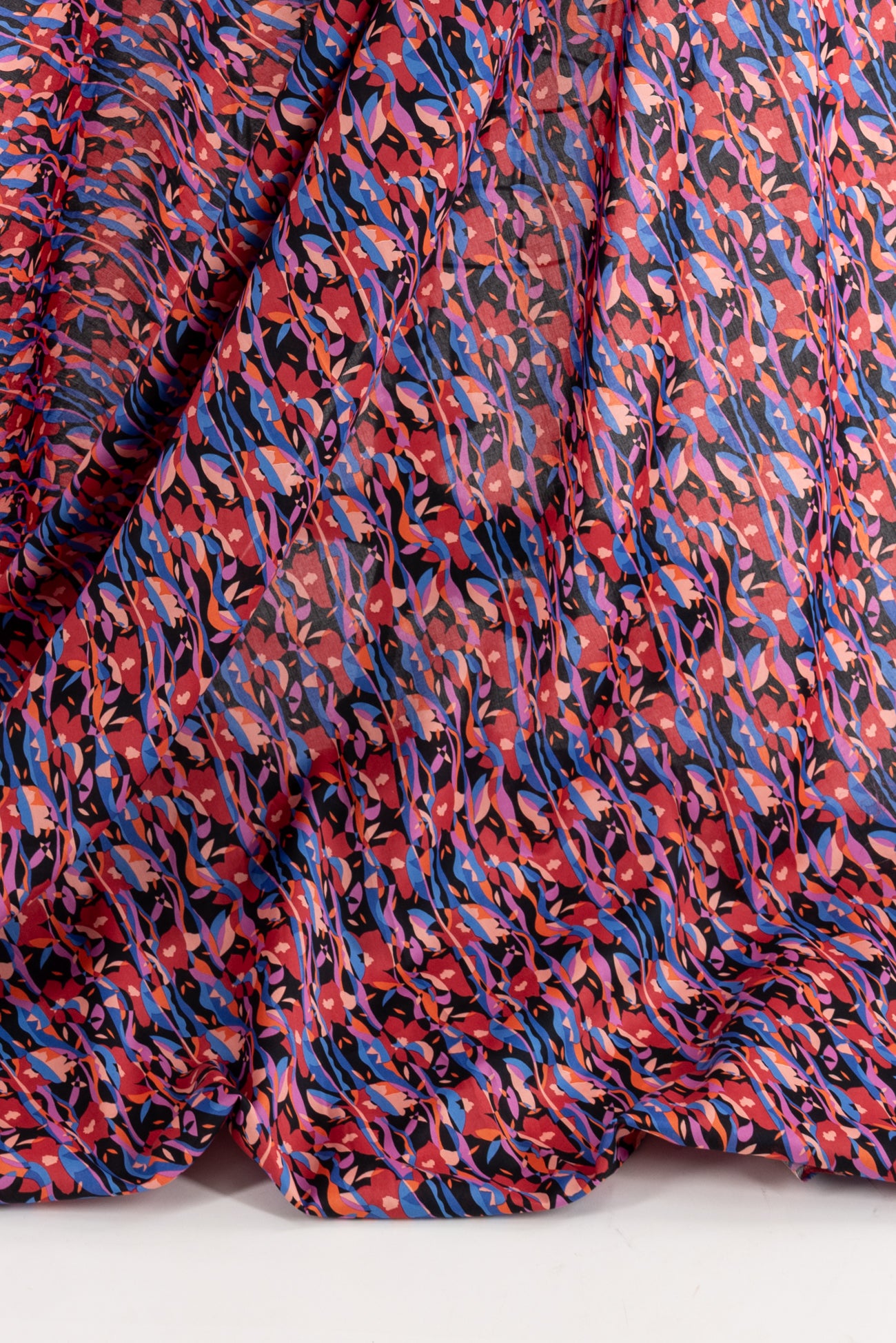 Modern Liberty floral in red, magenta, pink, and blue on a soft black background. Deadstock from a NYC designer, produced in Northern Italy for Liberty of London, printed on the renowned and exceptional Tana Lawn, the cotton that behaves and feels like silk. Fine-grained, with a cool, smooth, soft hand, fluid drape, depth of color. Perfect for a shirt, dress, skirt, tunic, soft pant, caftan, loungewear, children or men, accessories or home decor. Right to wear everyday or for statement pieces. OEKO-TEX® certified. One-way design, 5" repeat. Limited quantity.
