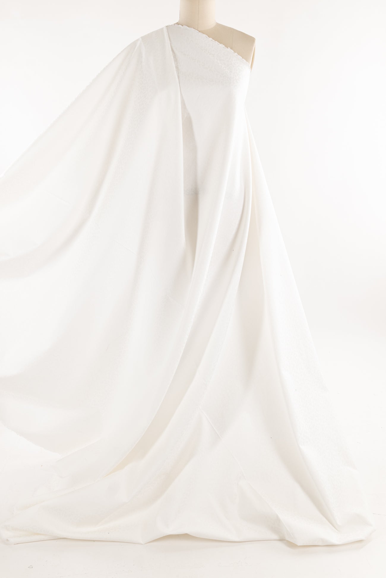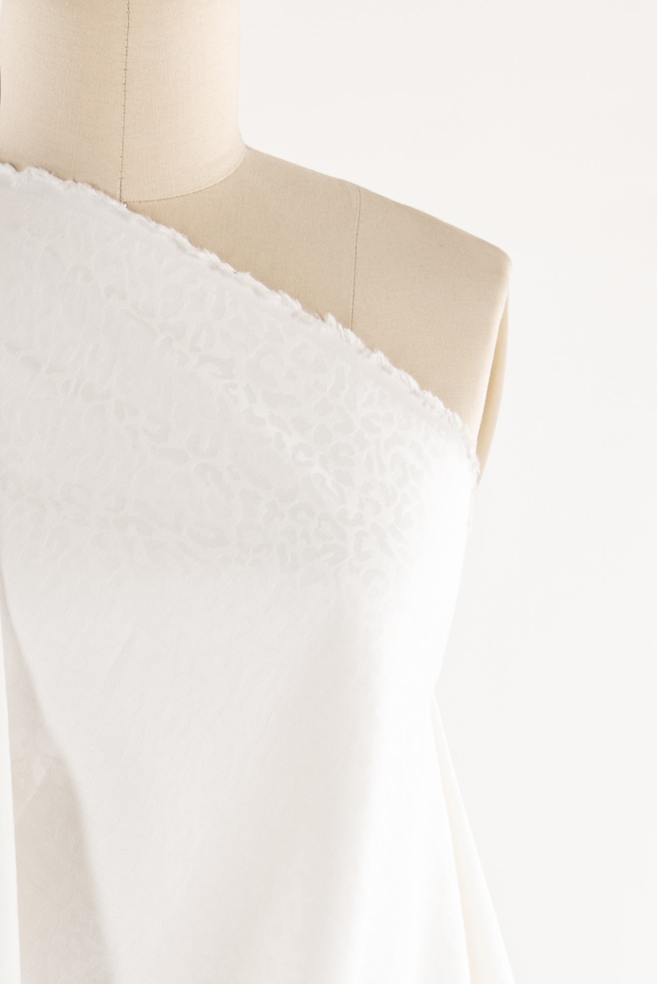 White cotton/spandex jacquard has a discreet, small woven-in leopard pattern, deadstock from an LA designer. Mid/light weight is perfect for summer pants, (no lingerie show through), with a smooth hand, crosswise stretch, and light drape. Right for pants, jacket, dress, or skirt.